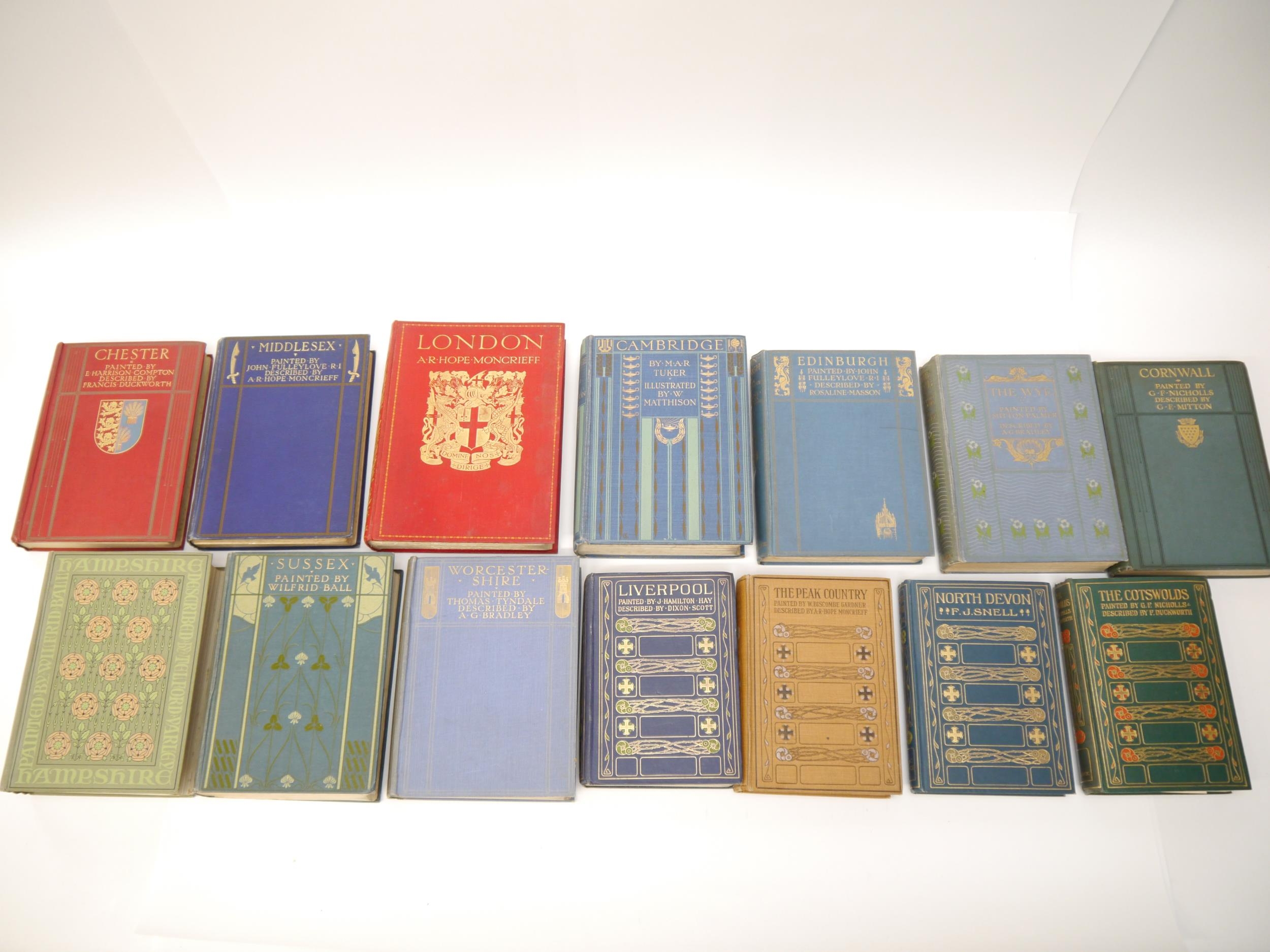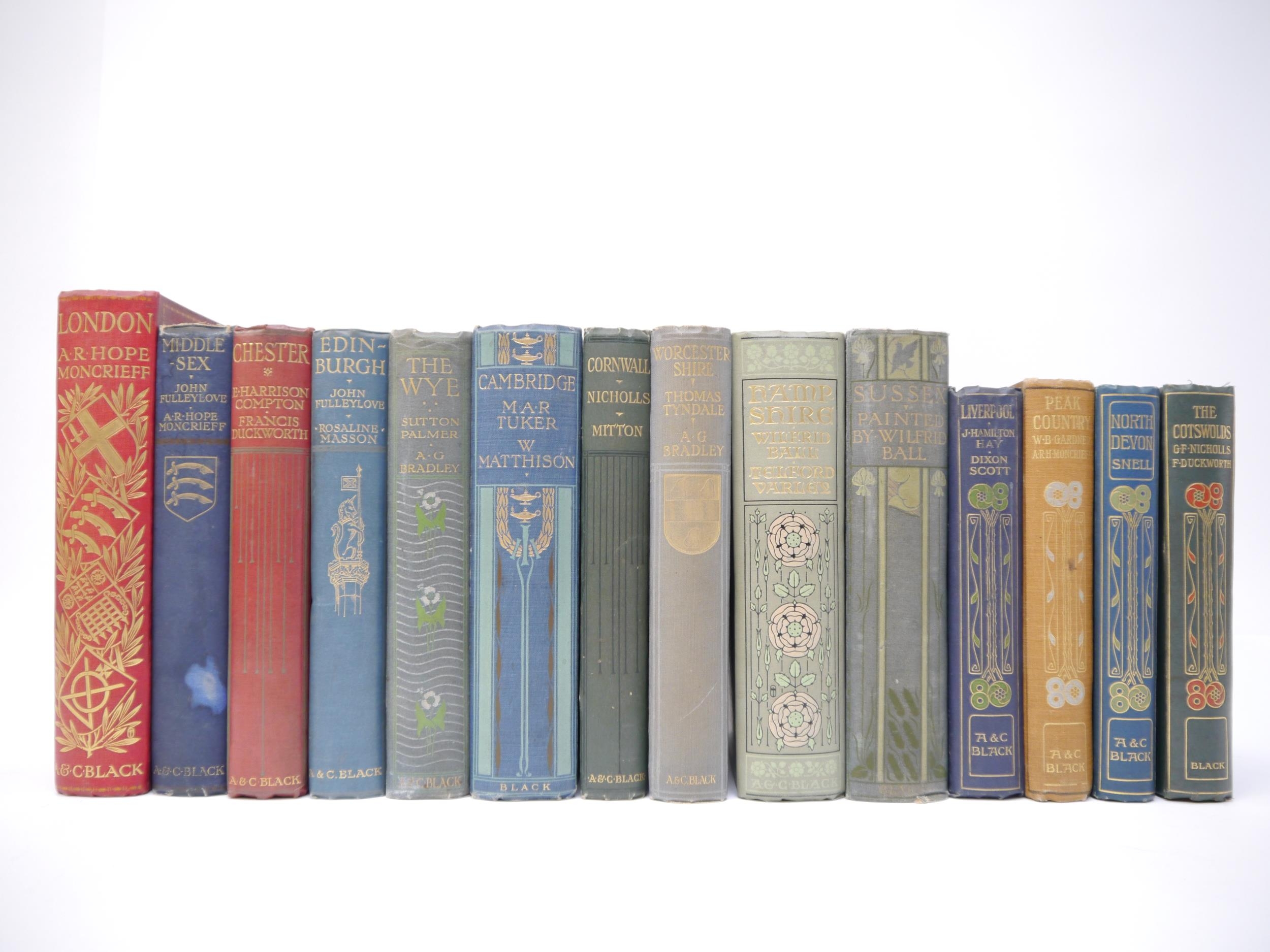 Fourteen A & C Black colour books, including 'Cambridge', 1907, 77 colour plates by W. Mathison + folding map at end as called for, original pictorial cloth gilt, top edge gilt; A.R. Hope Moncrieff: 'London', 1910, 32 colour plates as called for, original red pictorial cloth gilt, top edge gilt; 'Hampshire', 1909, 75 colour plates by Wilfrid Ball + folding map at end as called for, orig. pictorial cloth gilt; 'Sussex', 1913 reprint, 75 colour plates by Wilfrid Ball + folding map at end as called for, orig. pictorial cloth gilt, top edge gilt; 'The Wye', 1910, 24 colour plates by Sutton Palmer + folding map at end as called for, orig. pictorial cloth gilt, top edge gilt; plus others Edinburgh, Chester, Middlesex, Worcestershire, Cornwall, 6 shillings series The Cotswolds, North Devon, Peak Country & Liverpool (14)