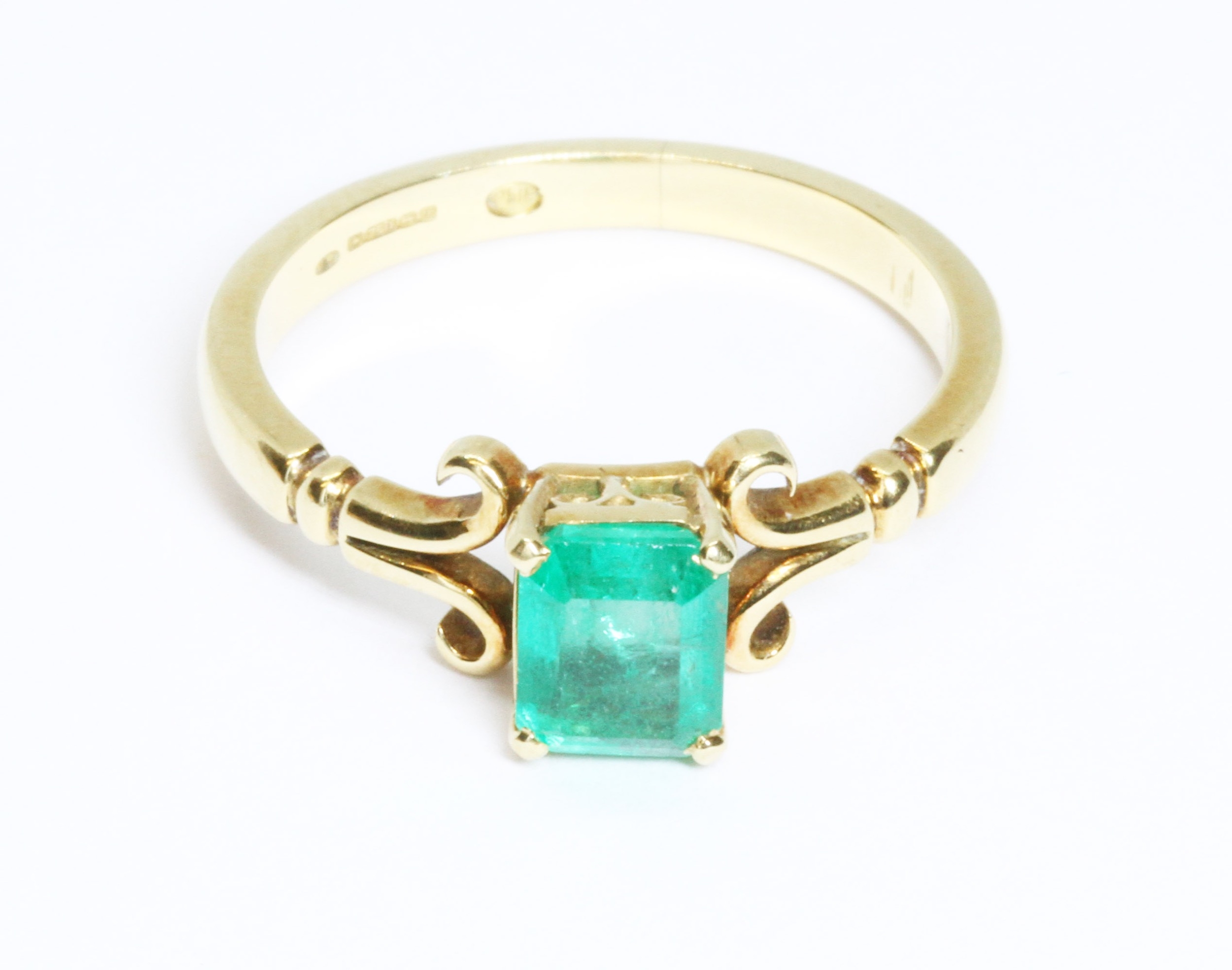 An 18ct gold emerald ring, the stone measuring approx. 7.34mm x 5.82mm, depth 2.73mm, gross weight 4.9g, size T.