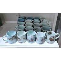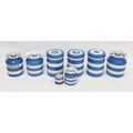 Group of TG Green Cornishware storage jars and covers in sizes, printed green marks, mid-20th century, one inscribed Lentils, the remainder untitled and a later TG Green eggcup, 14.5cm high max