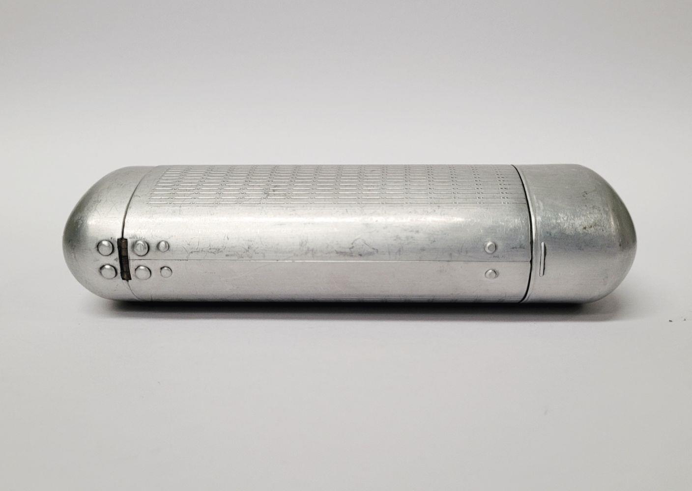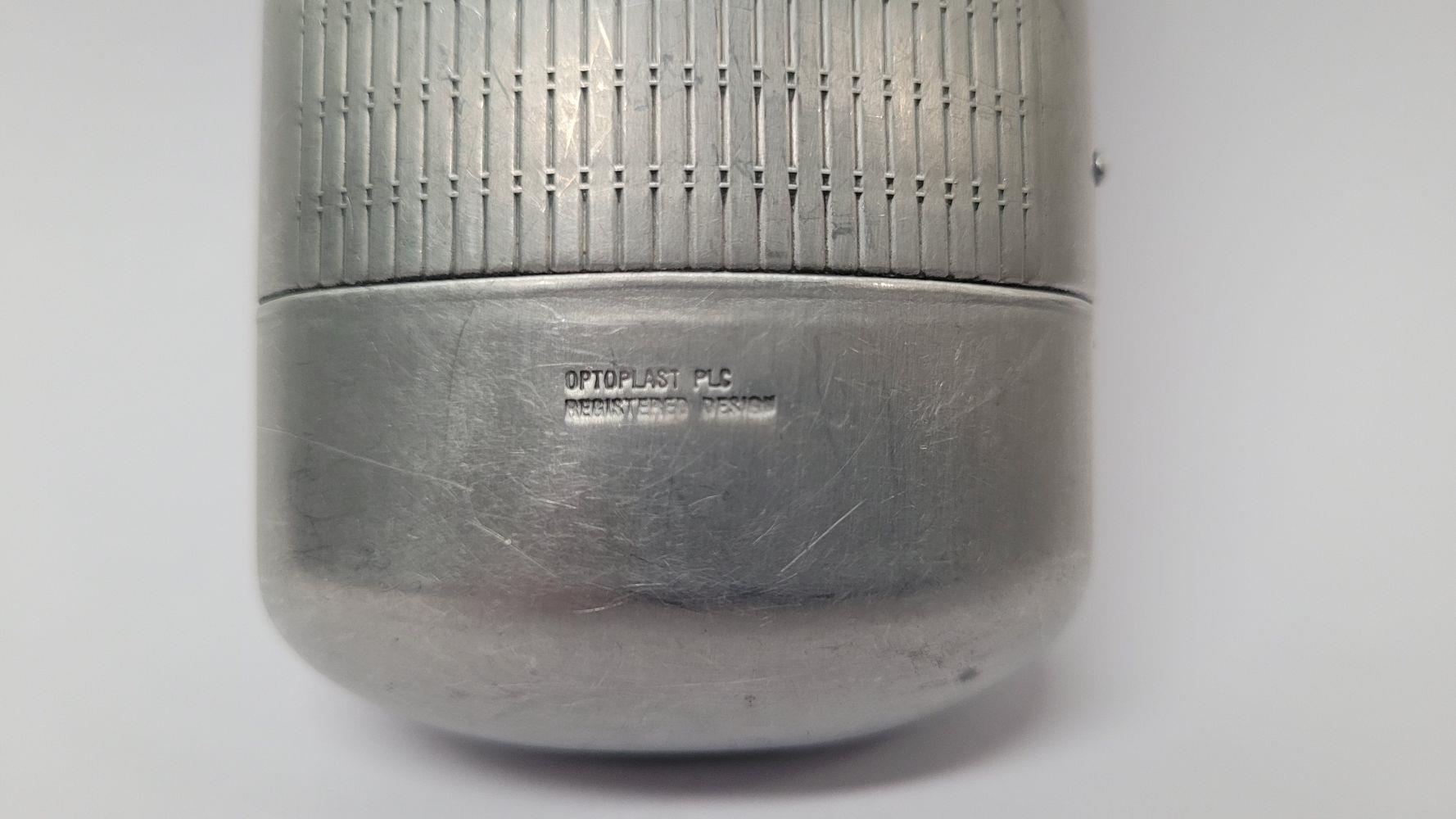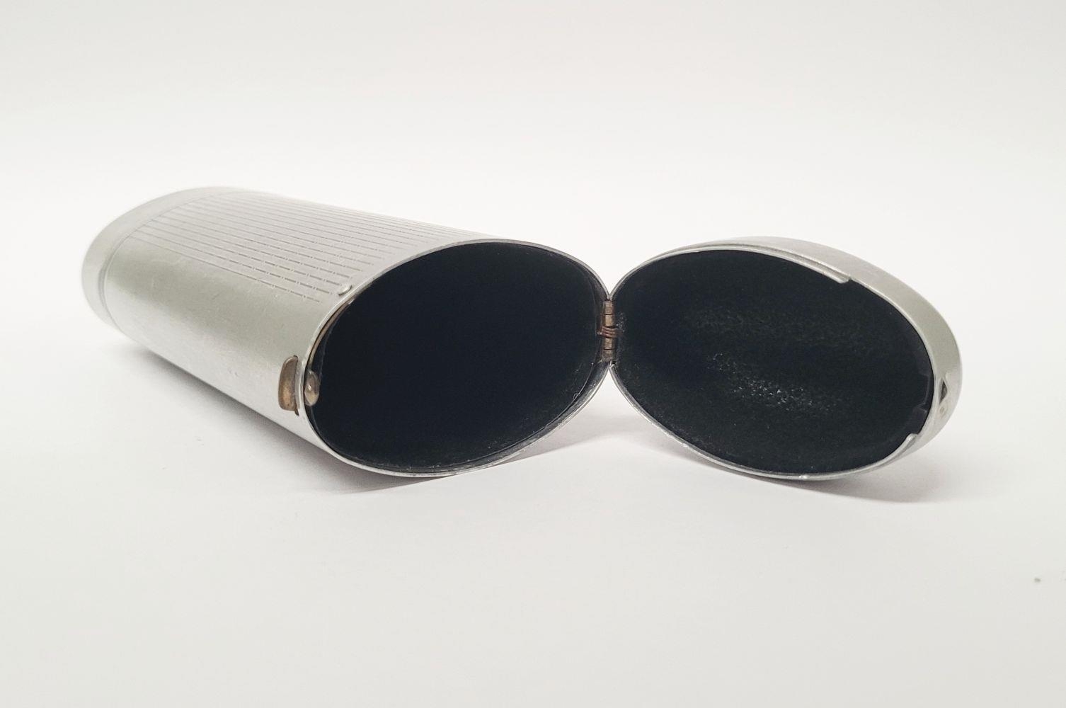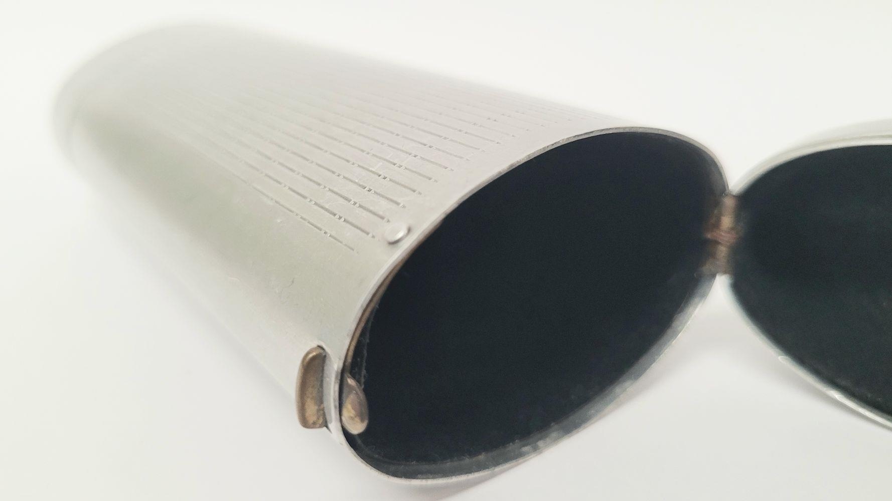 A VINTAGE OPTOPLAST ALUMINIUM SPECTACLE CASE, possibly from 1950s. Clip closing mechanism, with lining, maker’s mark impressed: ‘Optoplast PLC Registered Design’ to one side. In excellent condition. 15 x 6 x 3.5cm (L x W x D)