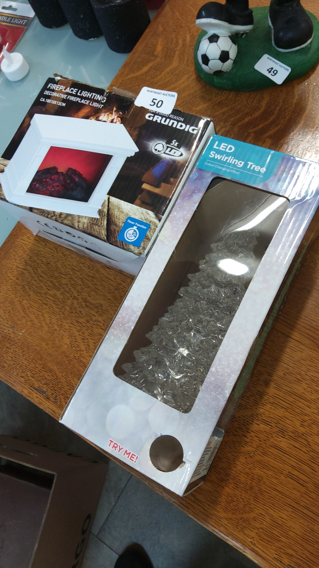 Pair of boxed LED decorative lights comprising a Grundig “Fireplace Lighting” unit and a colour-changing acrylic “LED Swirling Tree”.