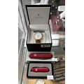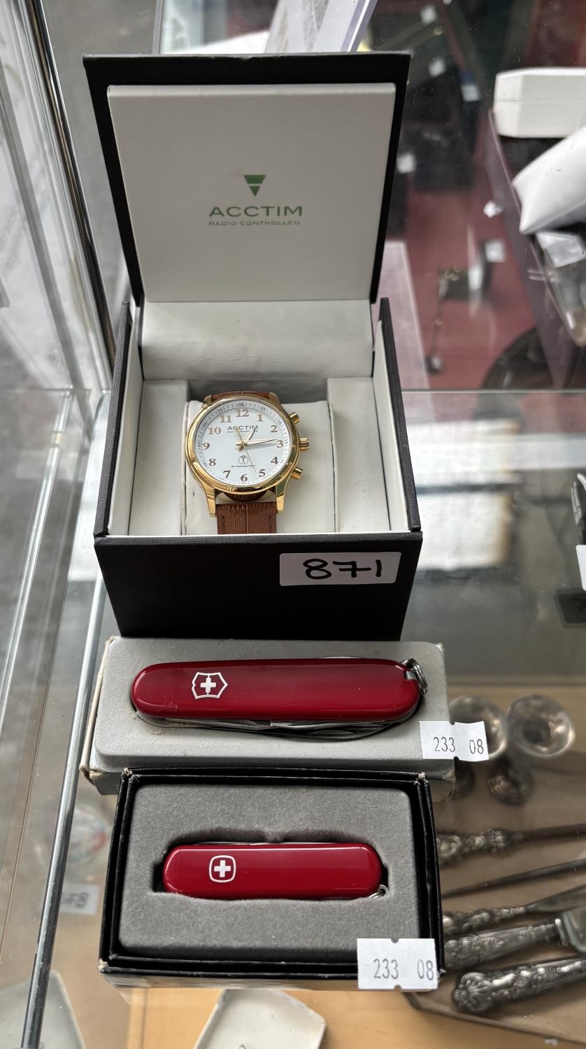 Boxed Acctim radio controlled watch and 2 Swiss Army knives
