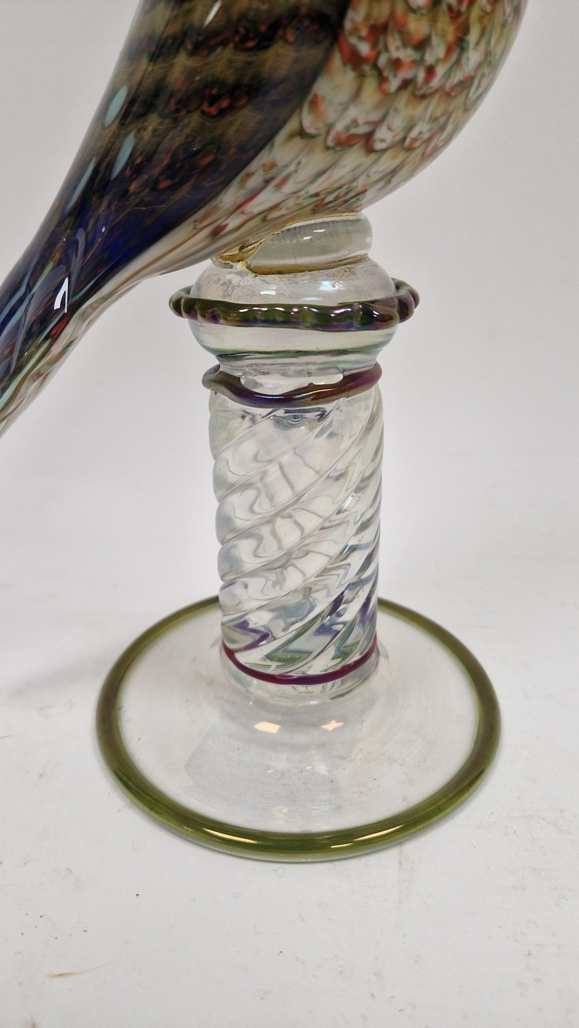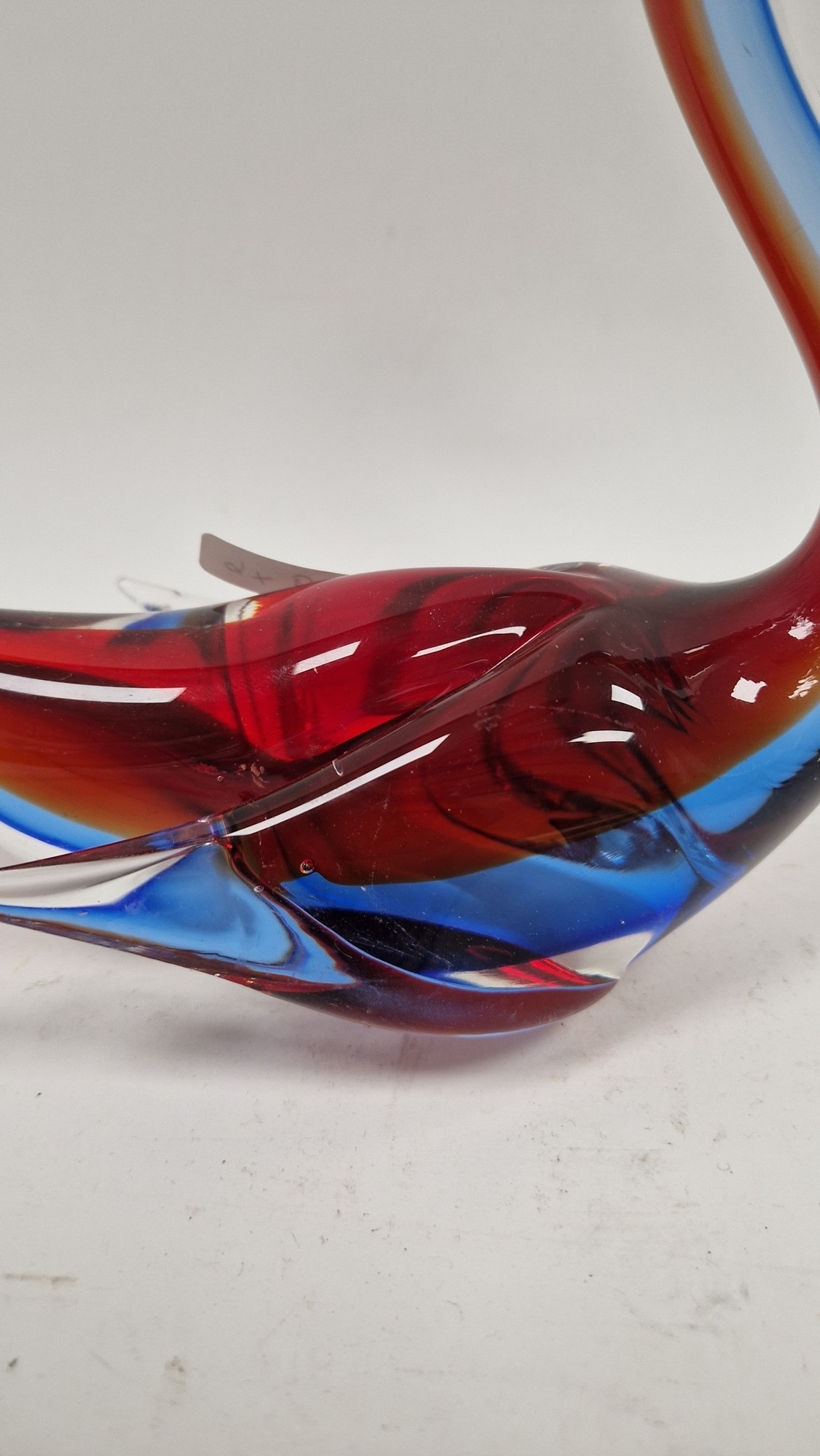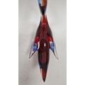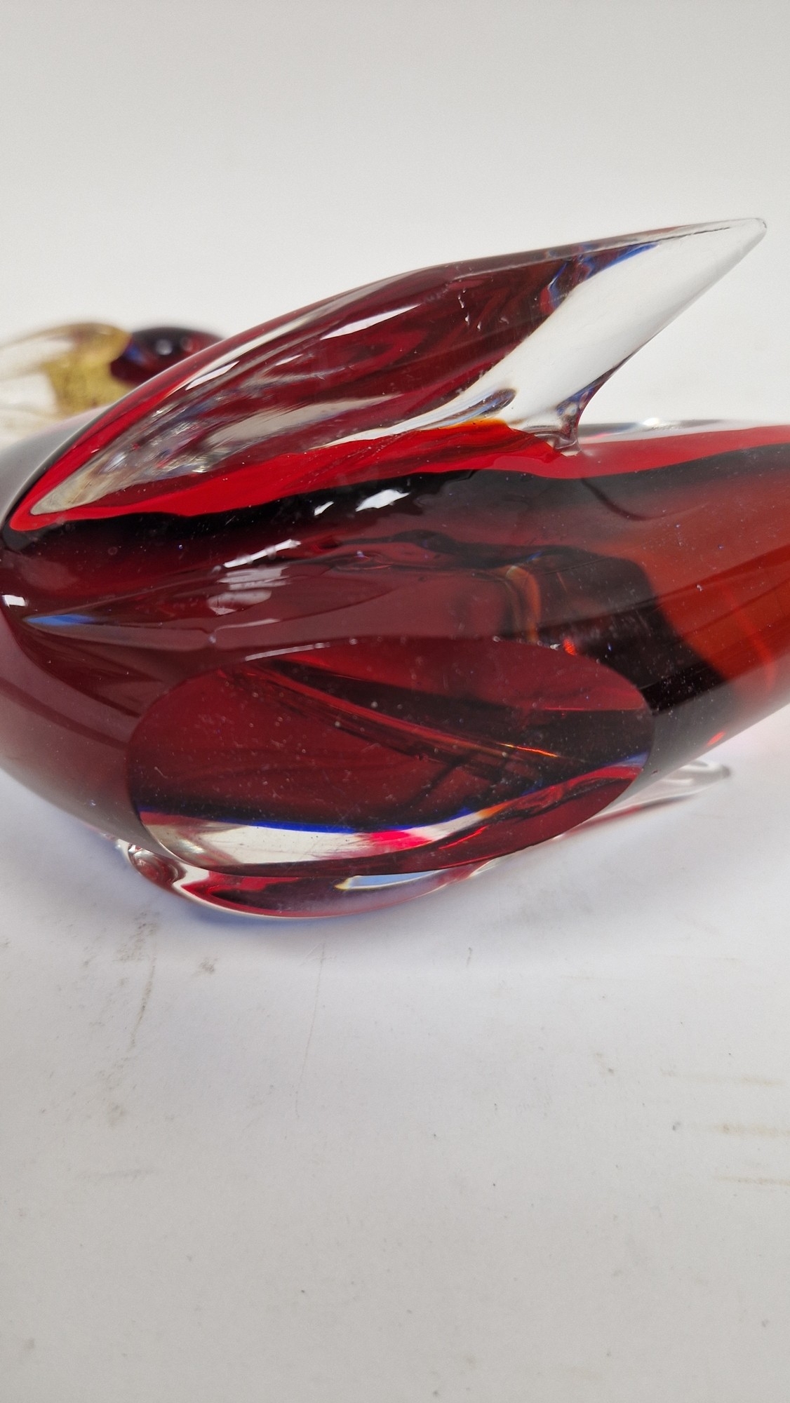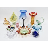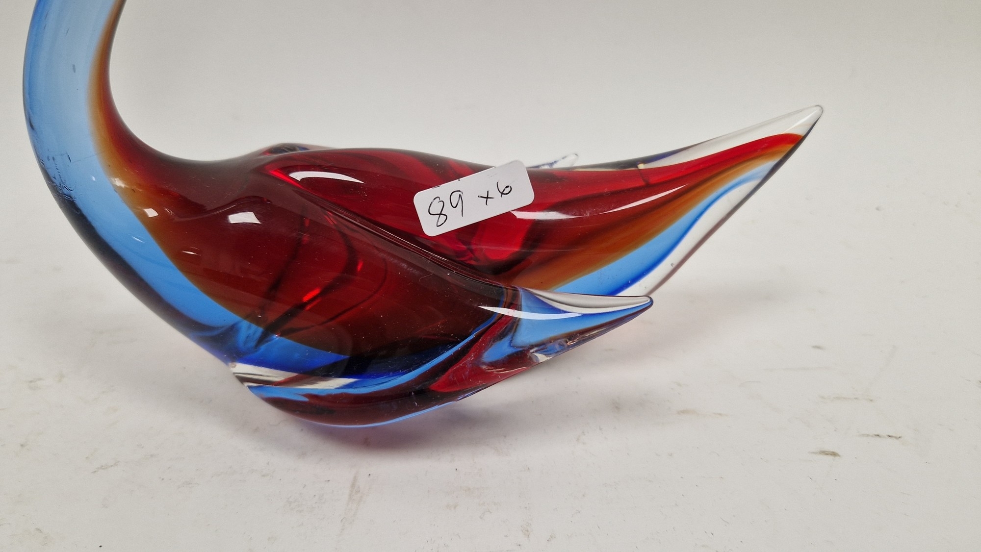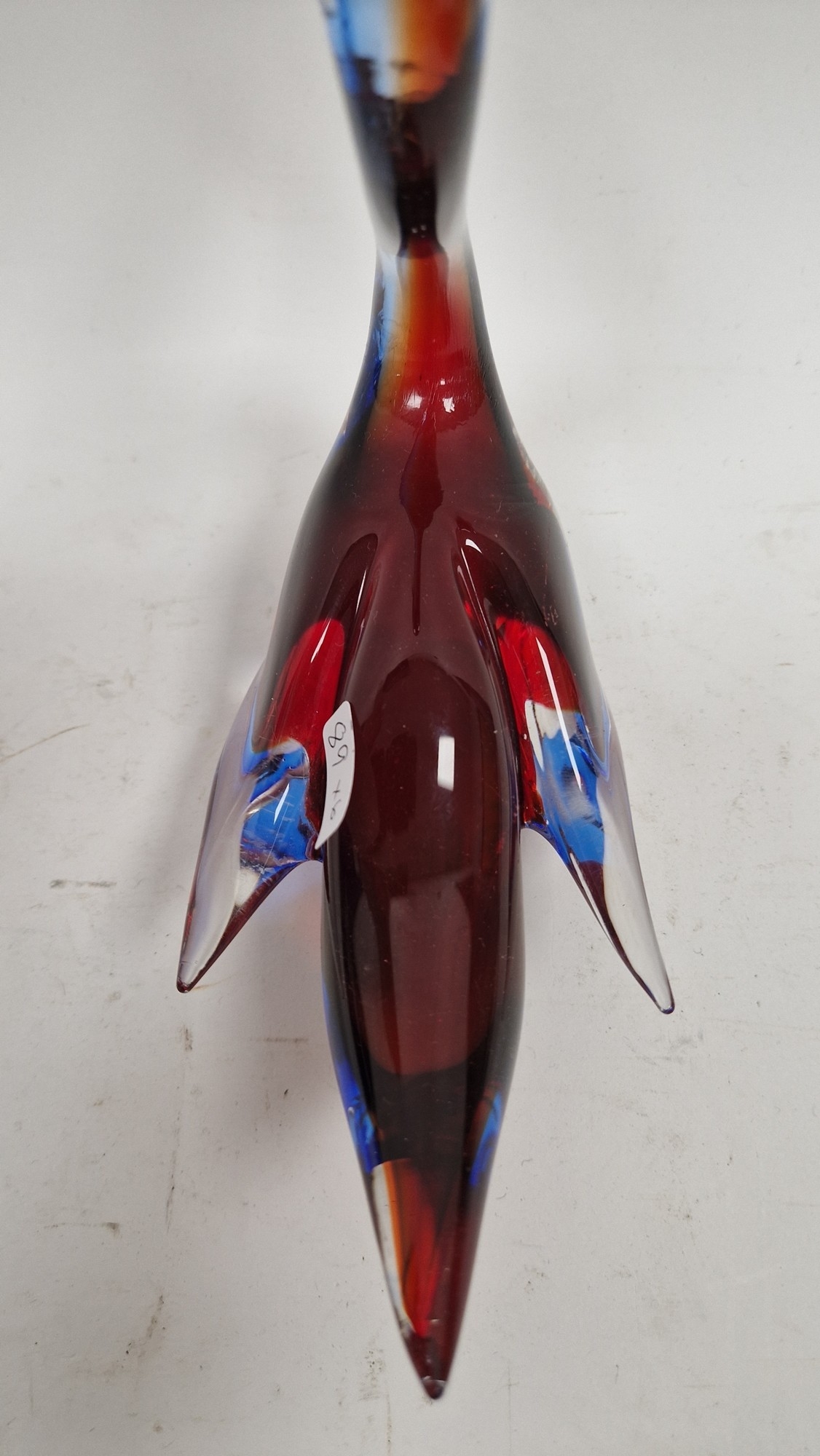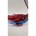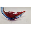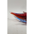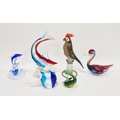 Small quantity of glass animals to include a Murano-style parrot, fish on pedestal base, a Murano duck in red and blue colourway, a Laguna Glass angel fish model, a Crystal D'arques dolphin and a Murano-style gren and yellow glass fish (6)