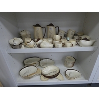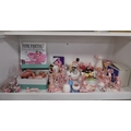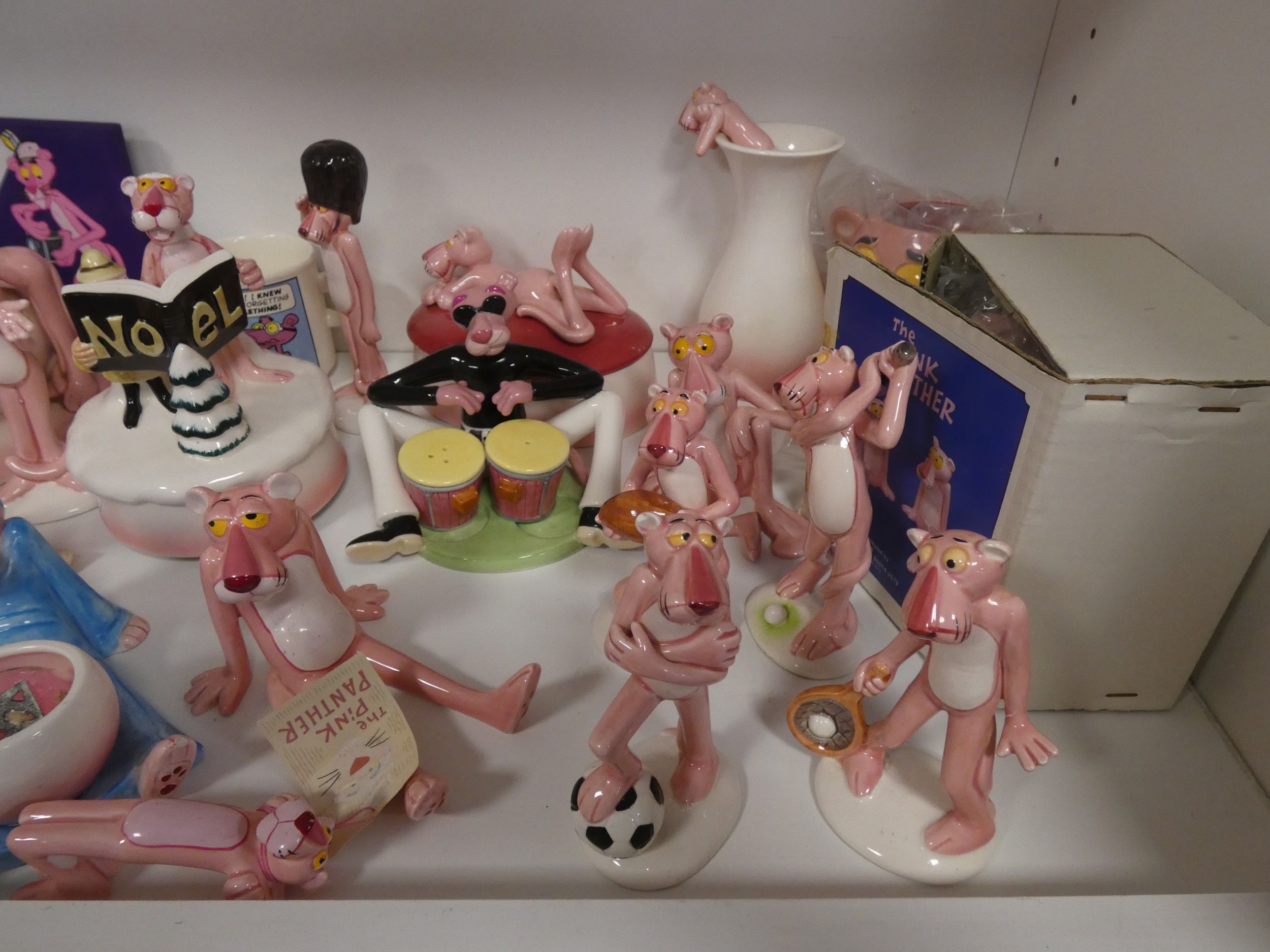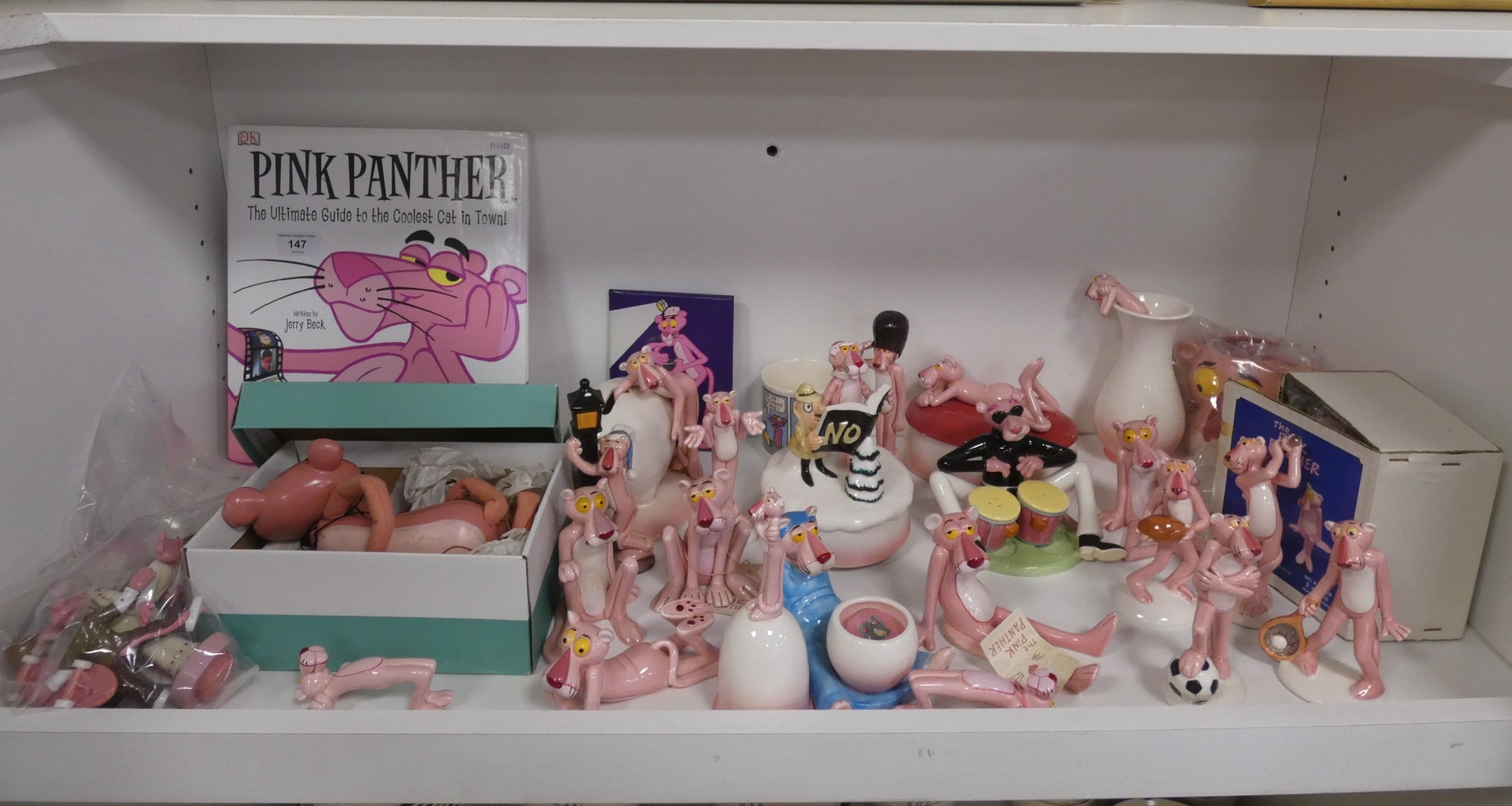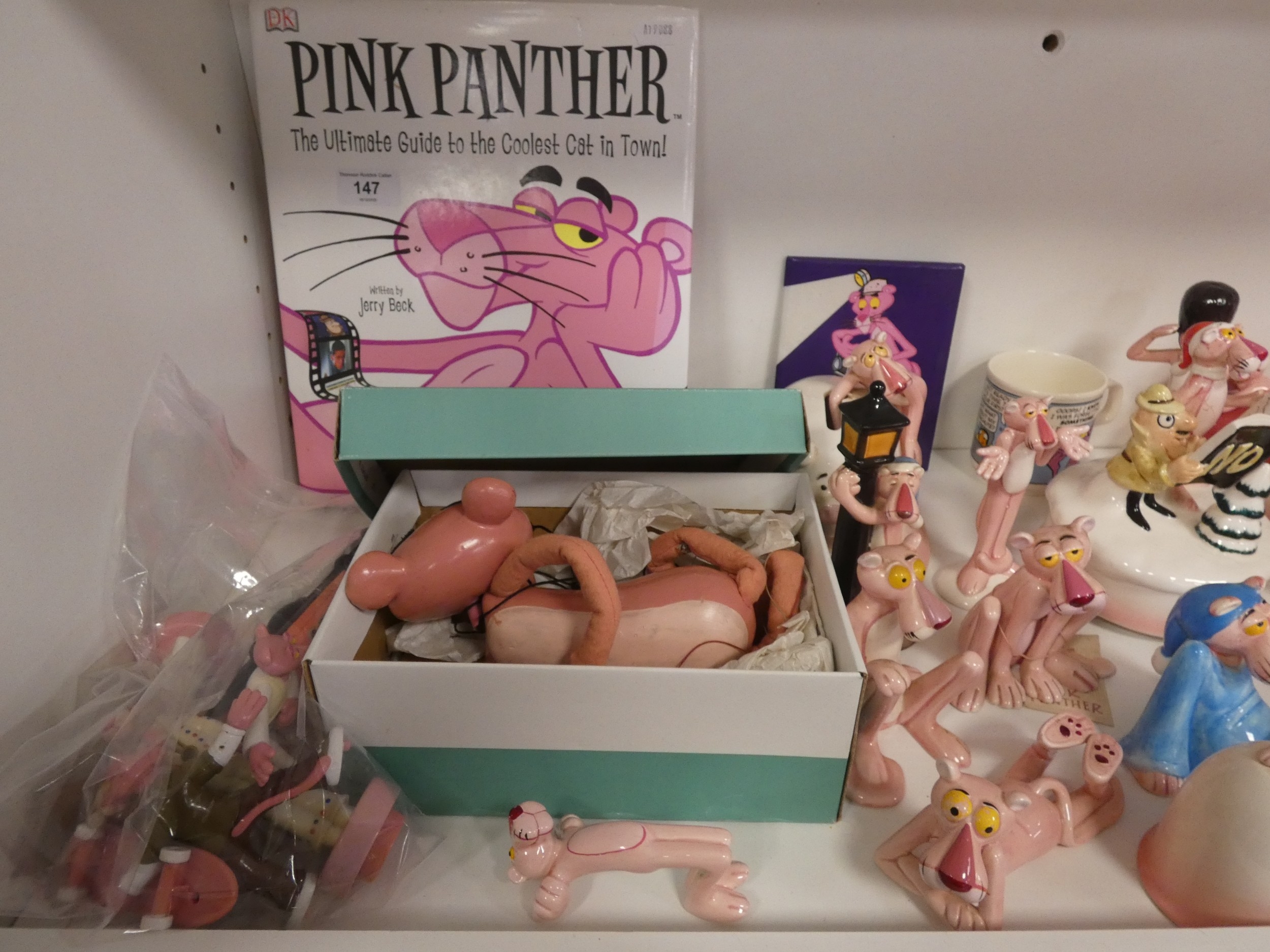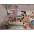 Collection of Pink Panther collectables to include porcelain figures, book, coin bank, puppet, mug etc (one shelf).