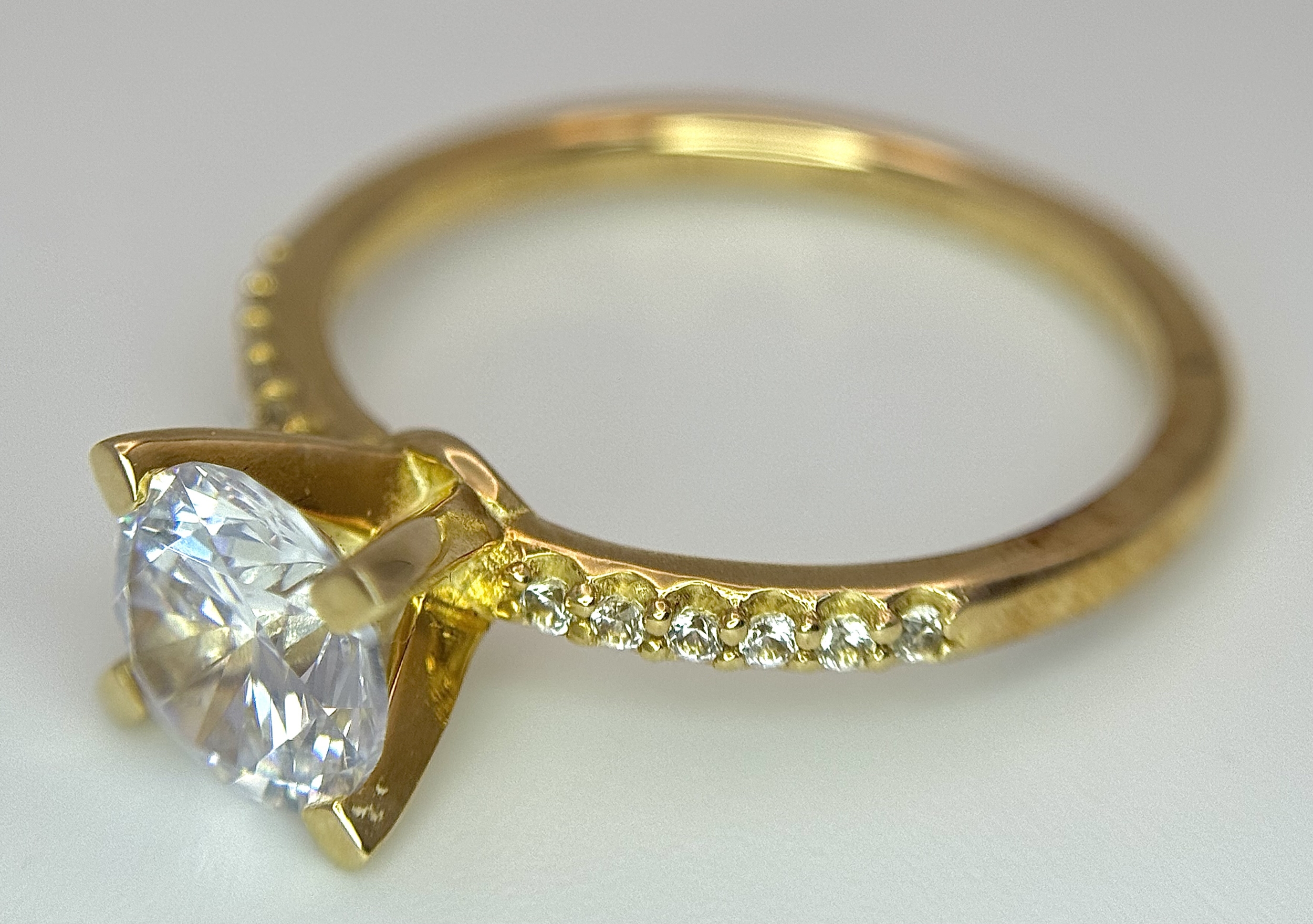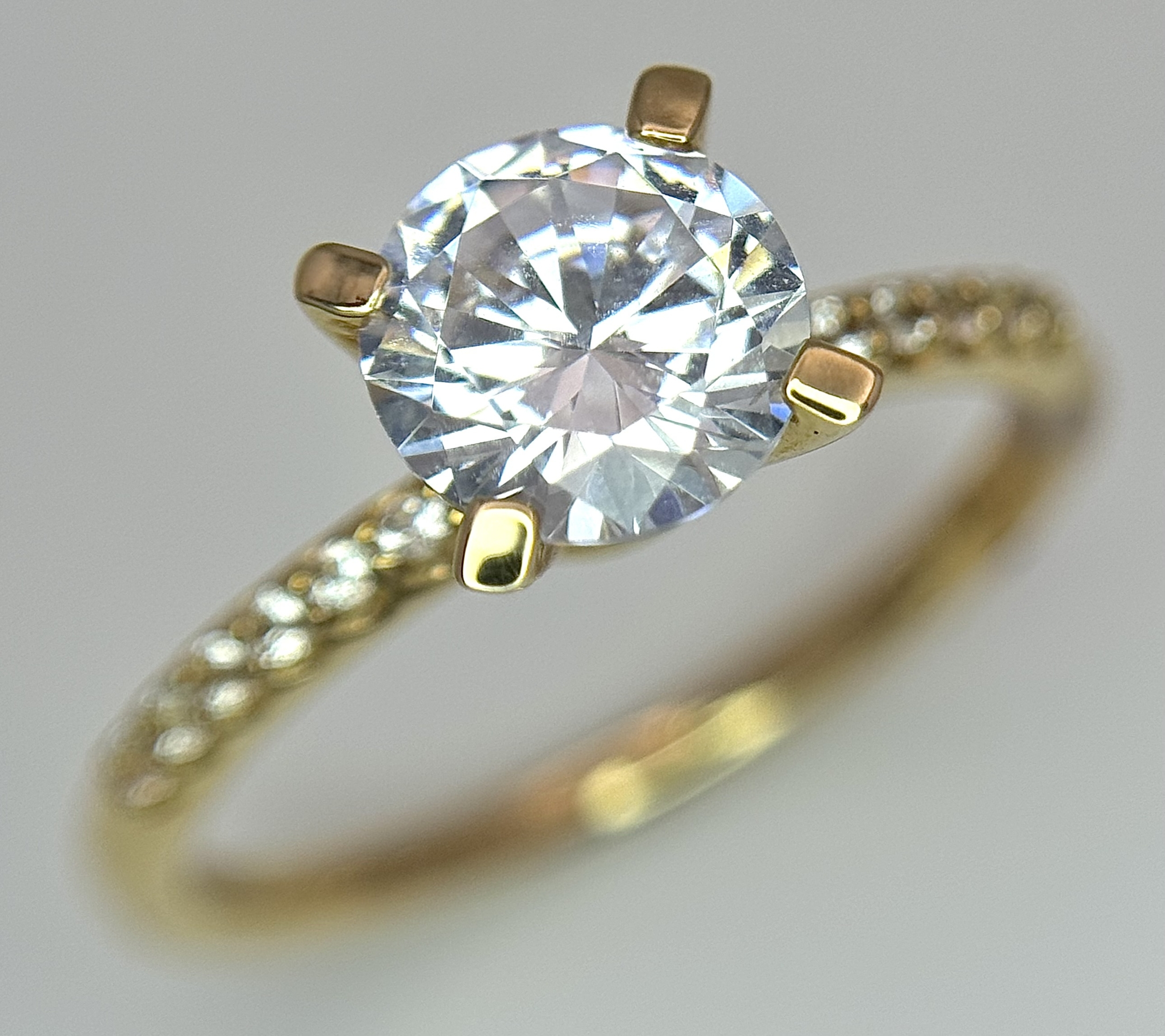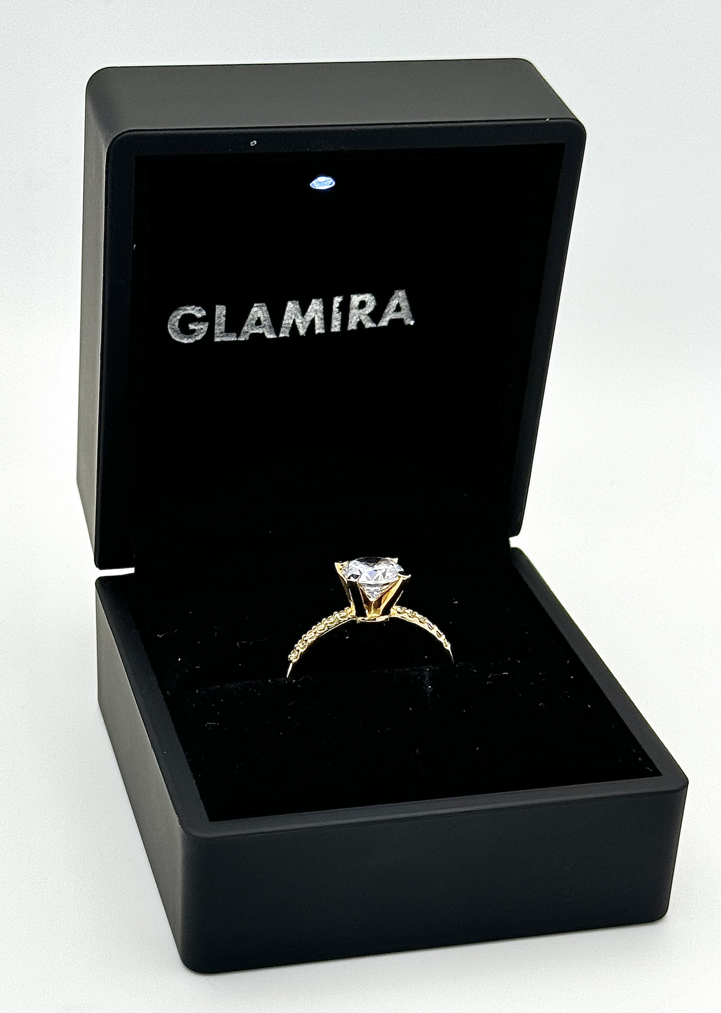 A Glamira 14K Yellow Gold Swarovski Crystal Ring. Size R1/2, 3.93g total weight. Comes with box, pouch, certificate of authenticity and lifetime warranty card. STK025334