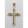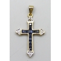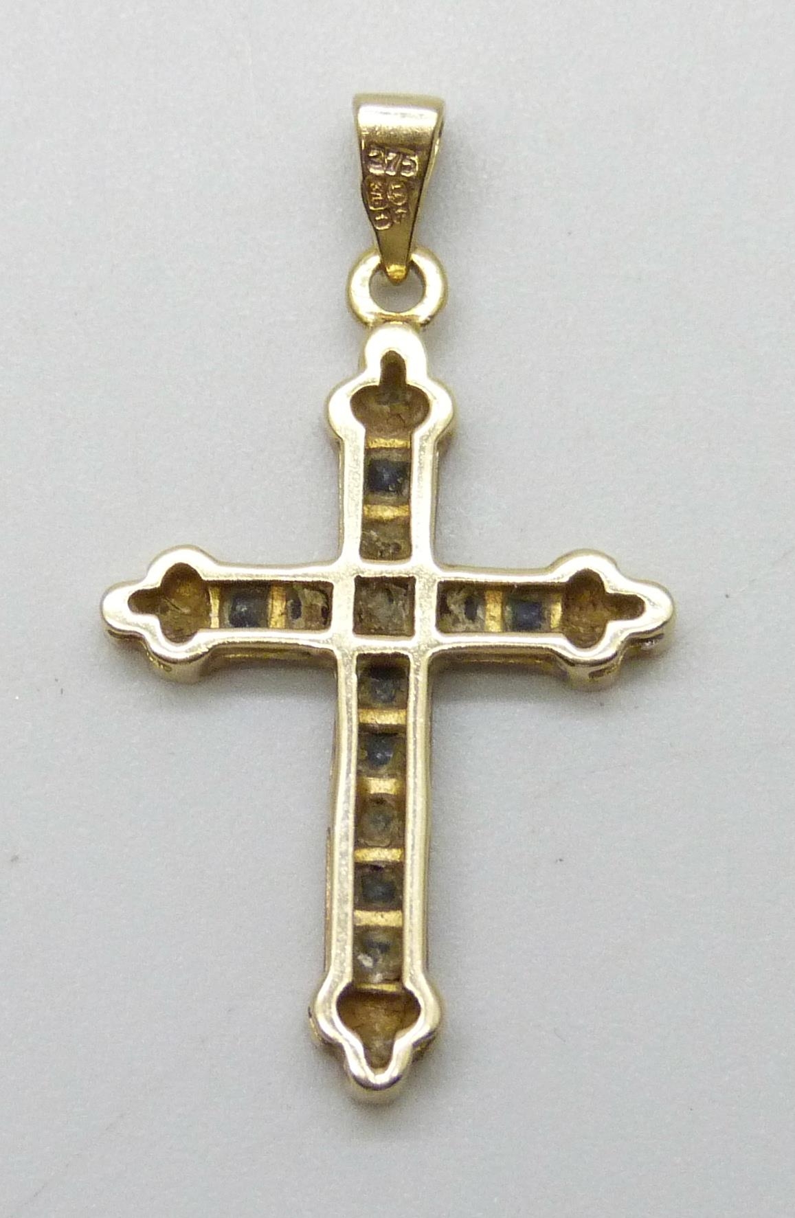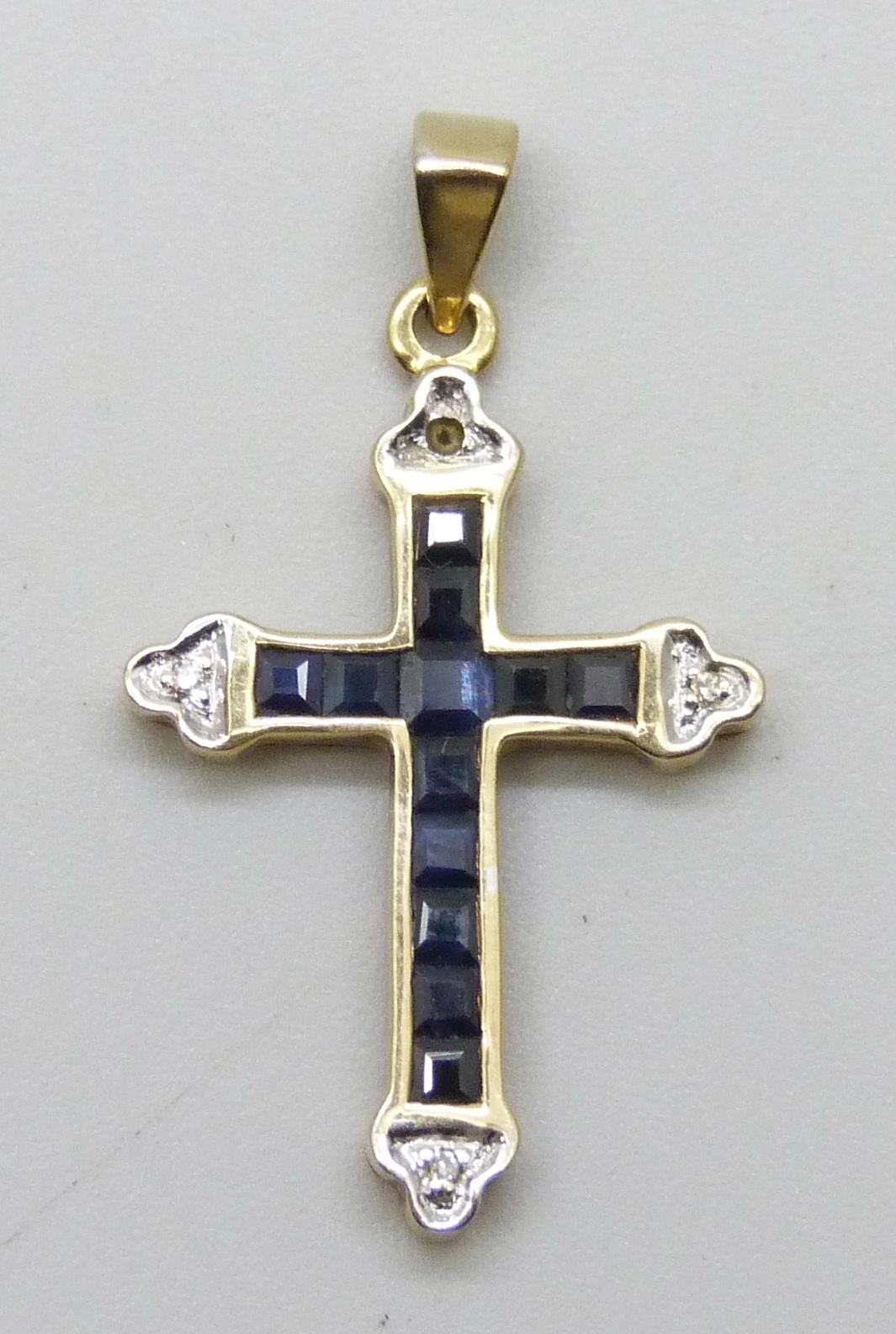 A 9ct gold cross pendant set with diamonds and sapphires, 1.5g, 3cm including bail