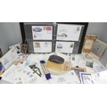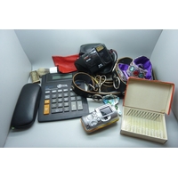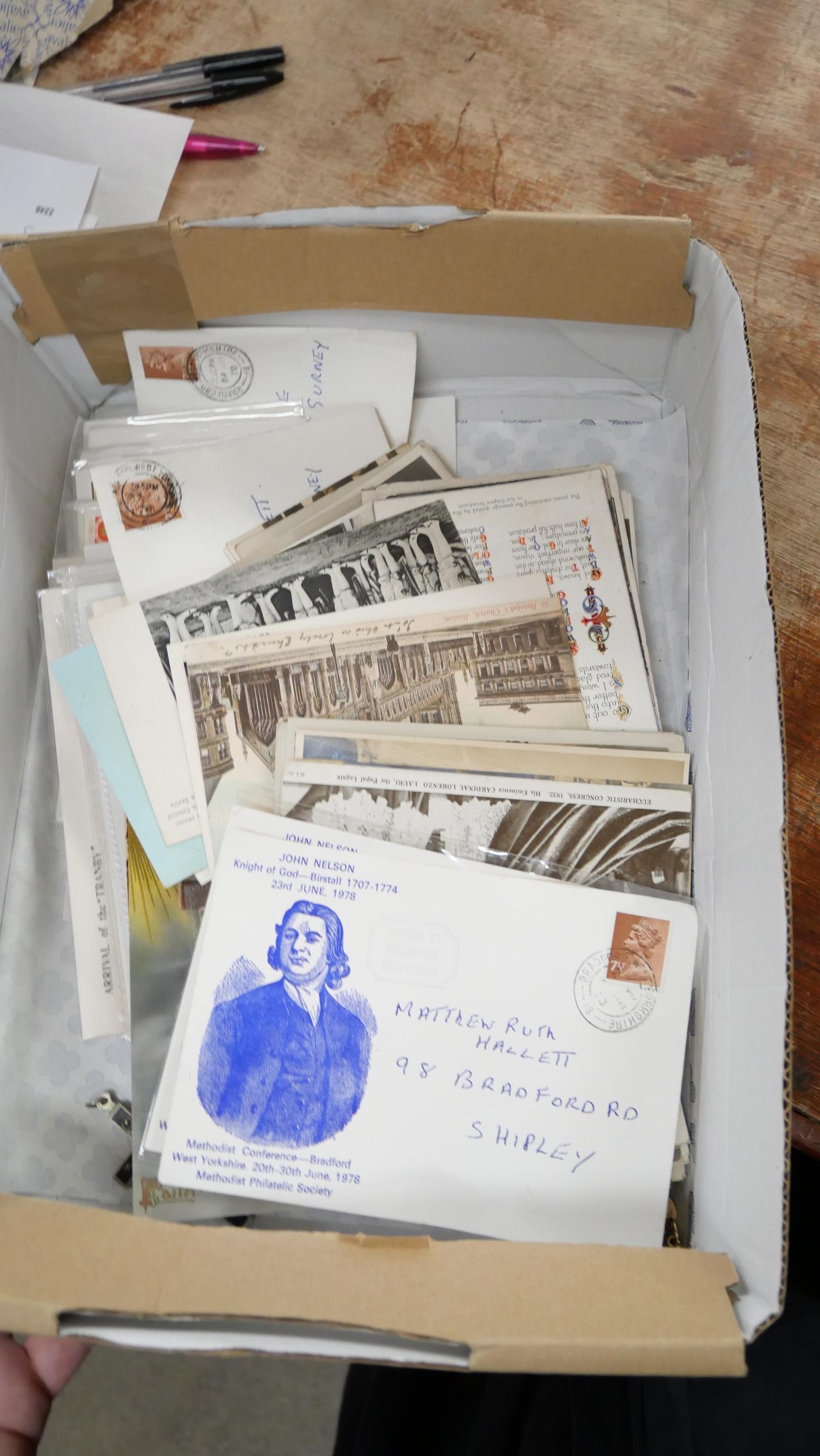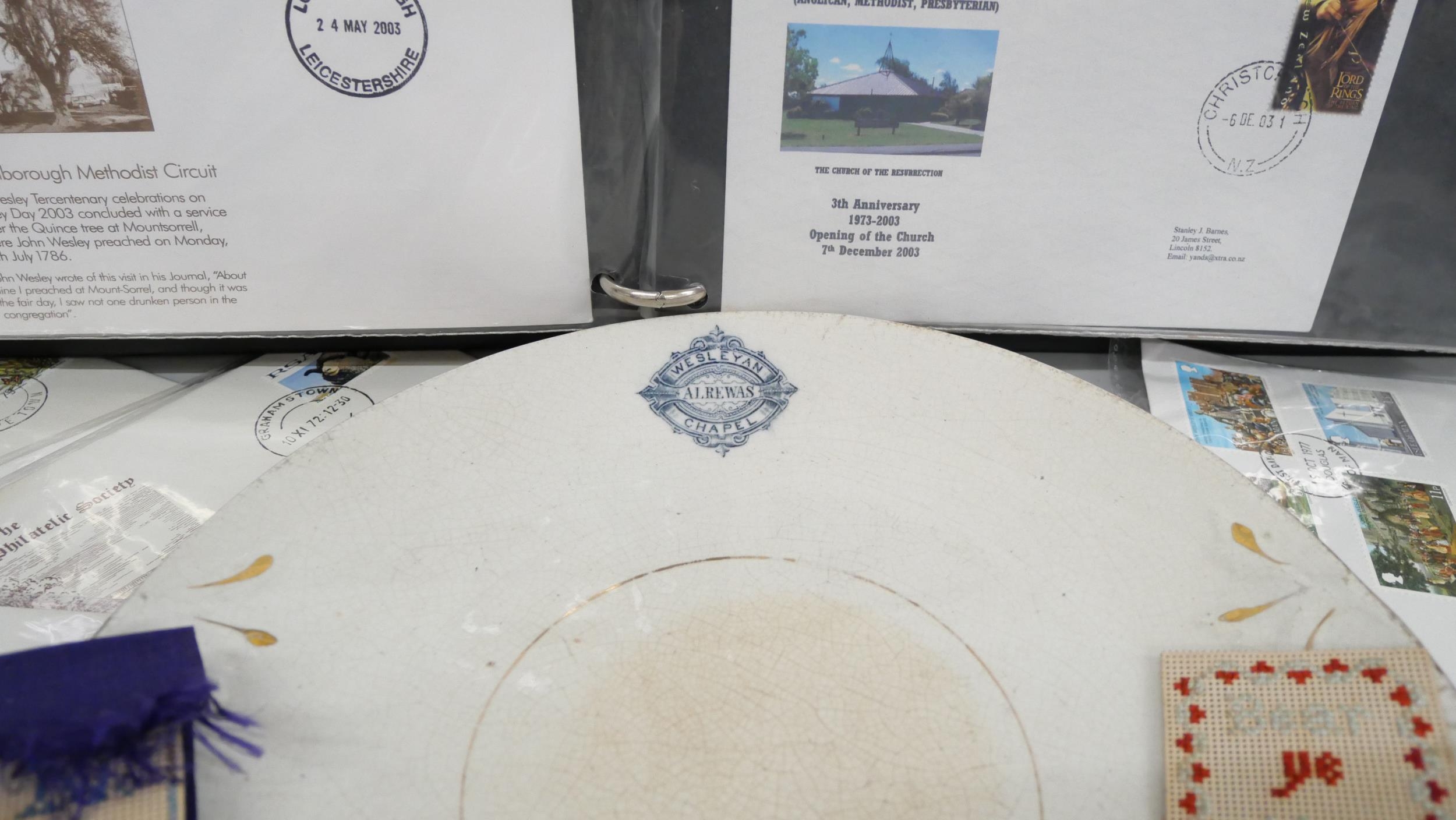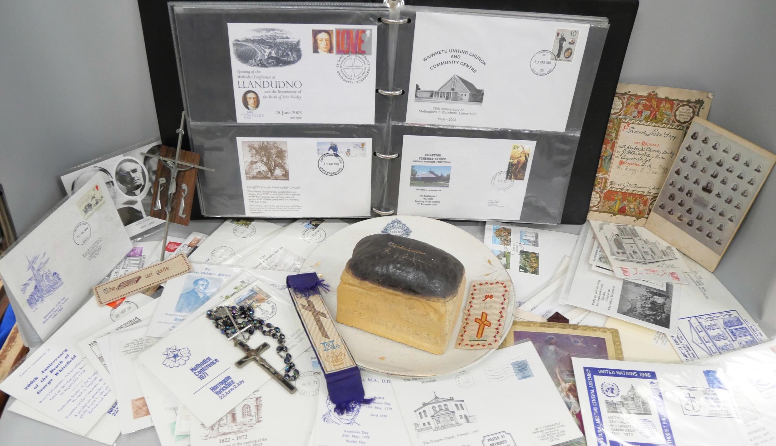 A box of religious ephemera and items including Alrewas Wesleyan Chapel plate, postcards, crucifixes, etc.