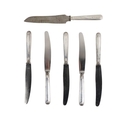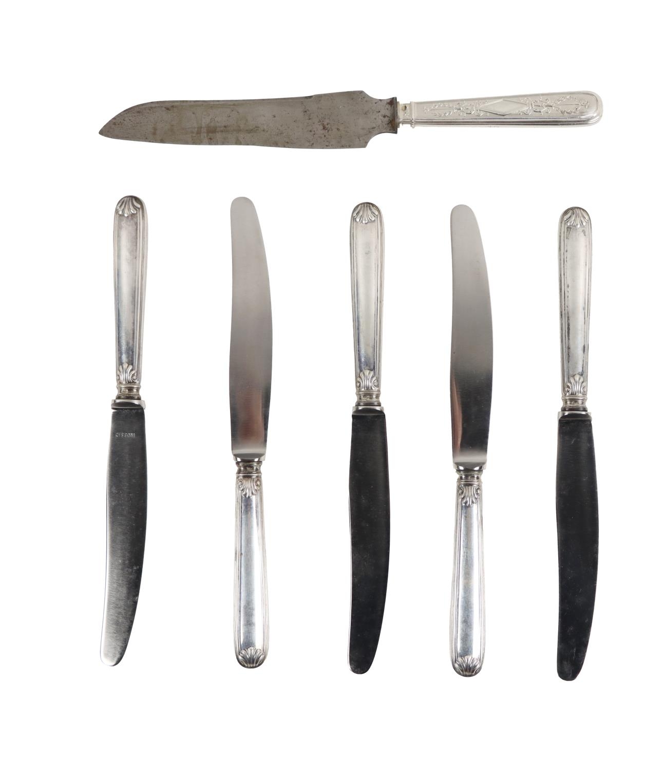Silverware: A set of 5 Italian silver handled steel blade Knives, with shell decoration, Italian c. 1950; also an ornate silver handle steel blade French Carving Knife, Puiforcat c. 1950, as a lot. (6)