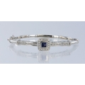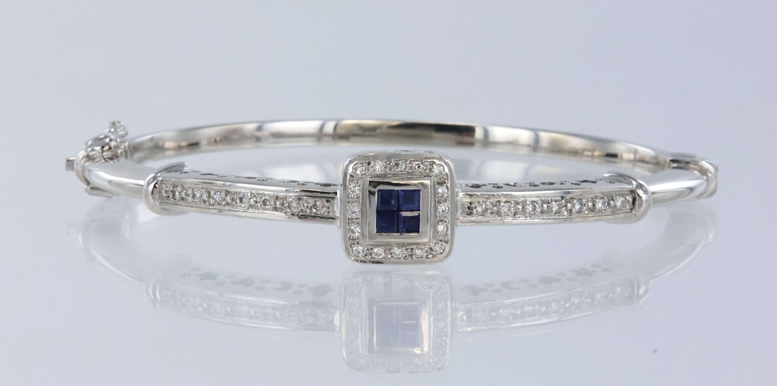 18ct white gold hollow hinged bangle with box clasp and double safety catches, centre square cluster of four princess cut sapphires surrounded by sixteen round brilliant cut diamonds, further seven diamonds either side, total diamond weight approx. 0.15ct, weight 21.6g