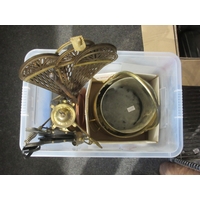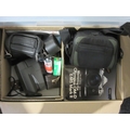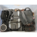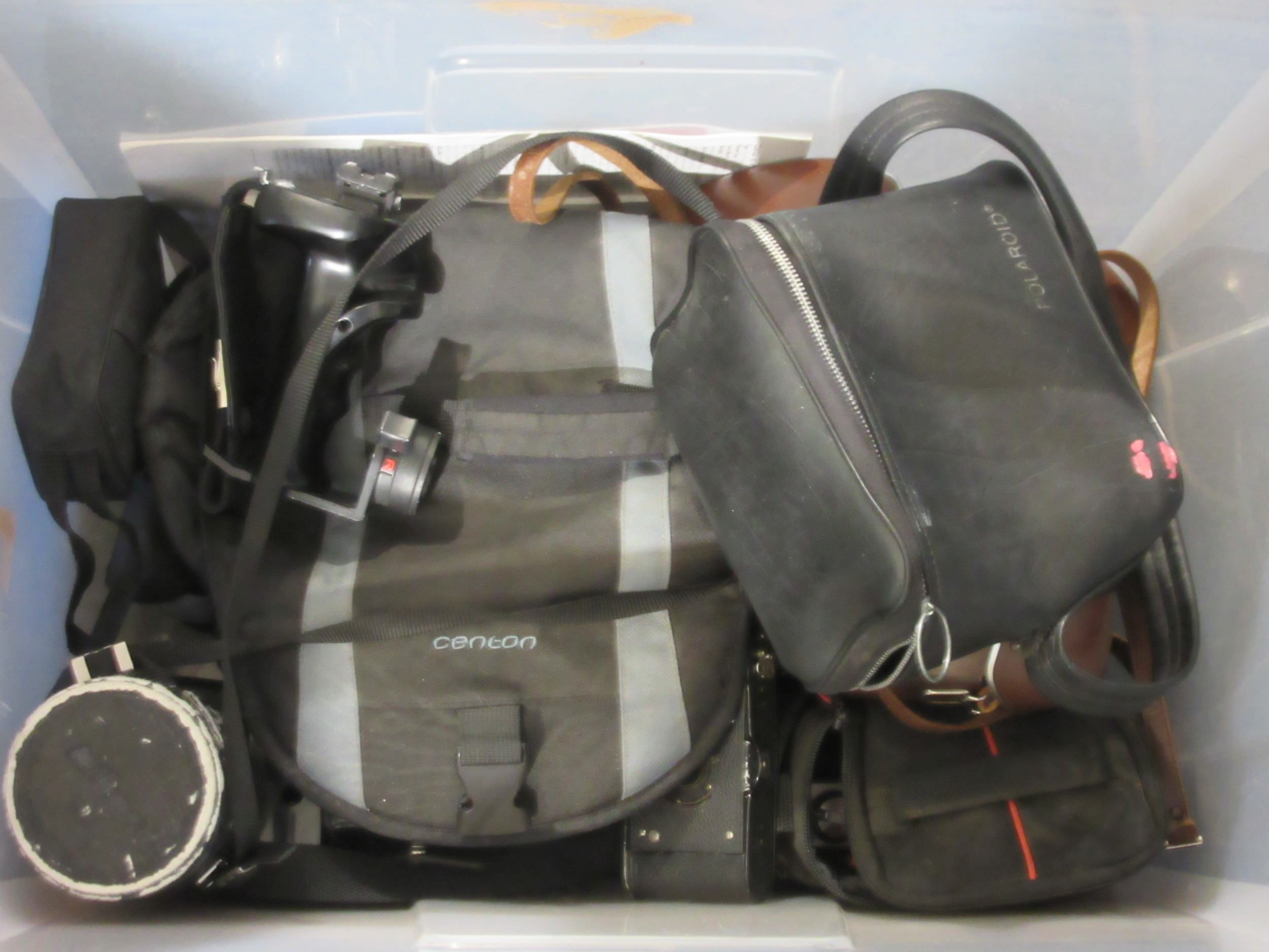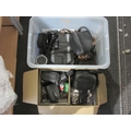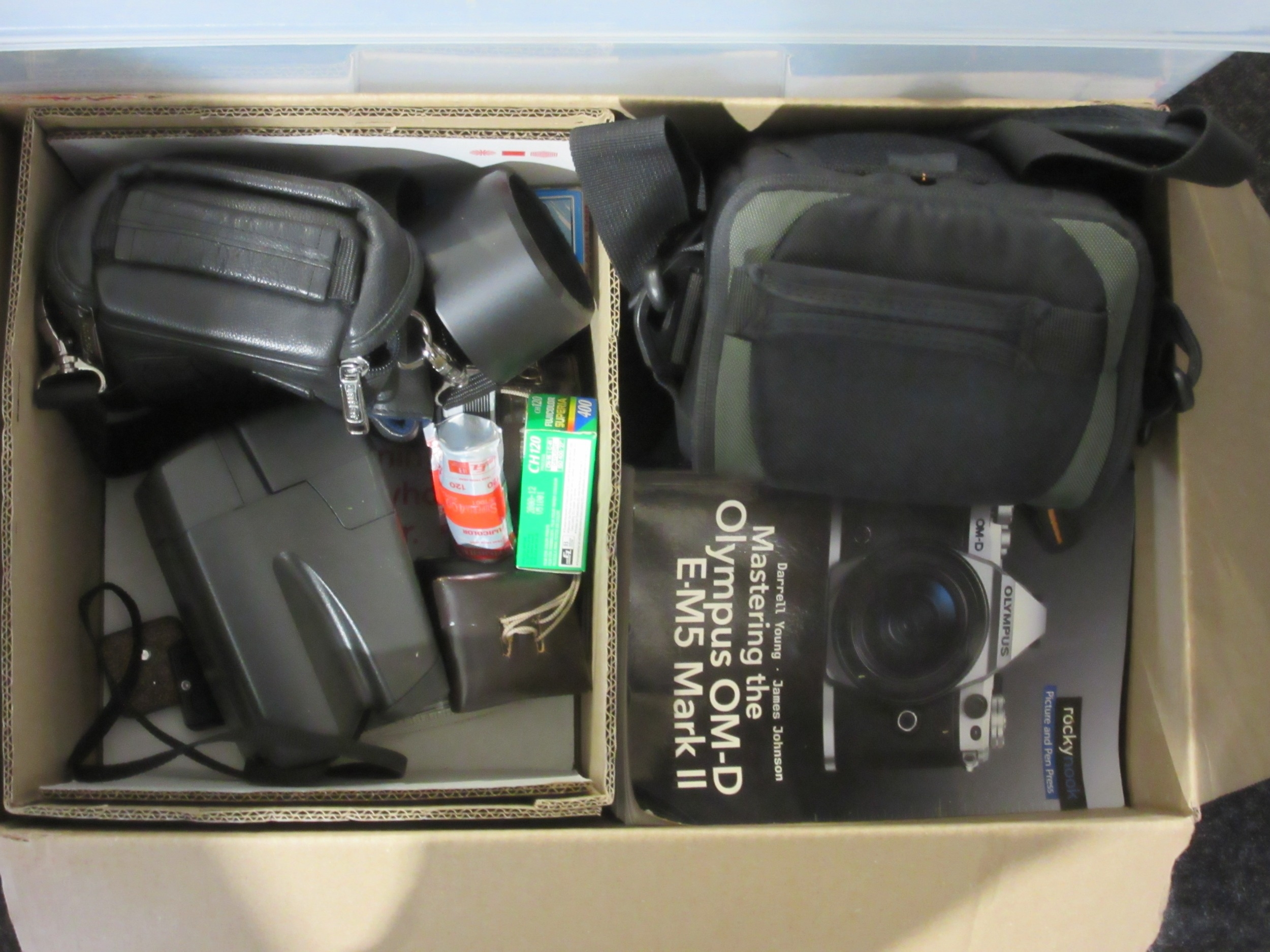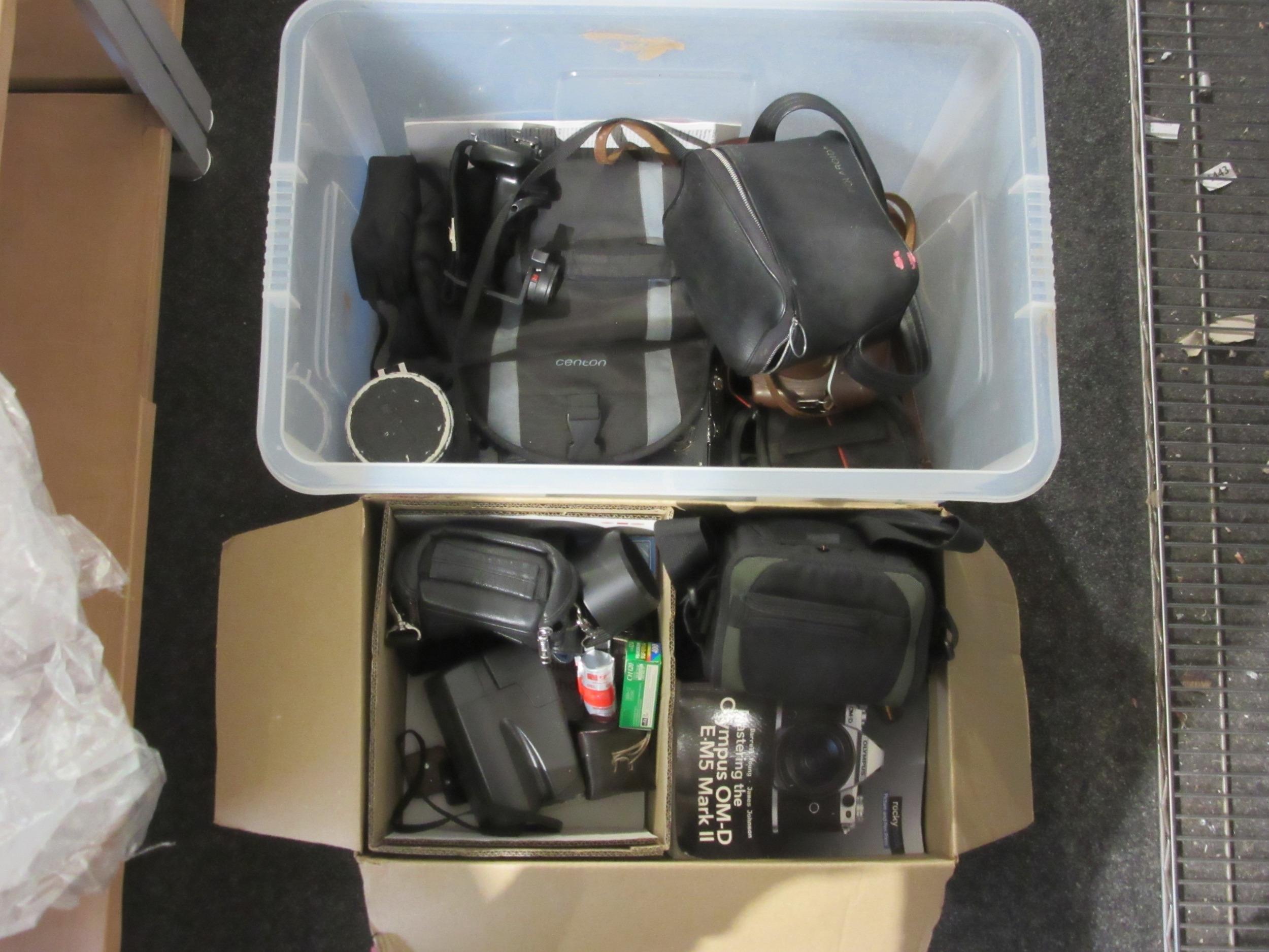 Two boxes containing a quantity of cameras and accessories including various lenses, cases, Voigtlander camera and other vintage cameras