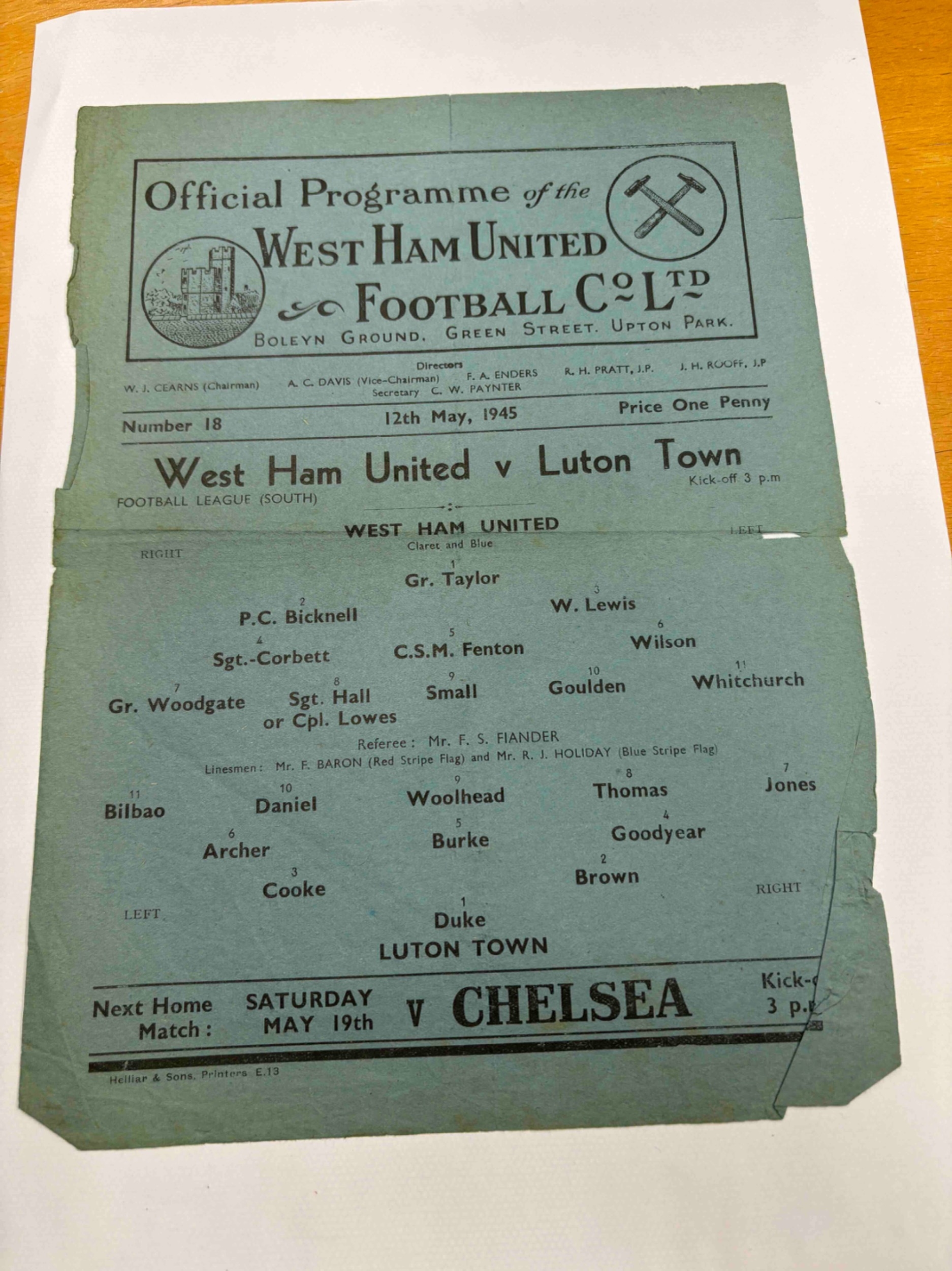 1944/45 West Ham United v Luton Town (May 12). 1” edge tear (no paper loss). Some edge wear. No writing.
