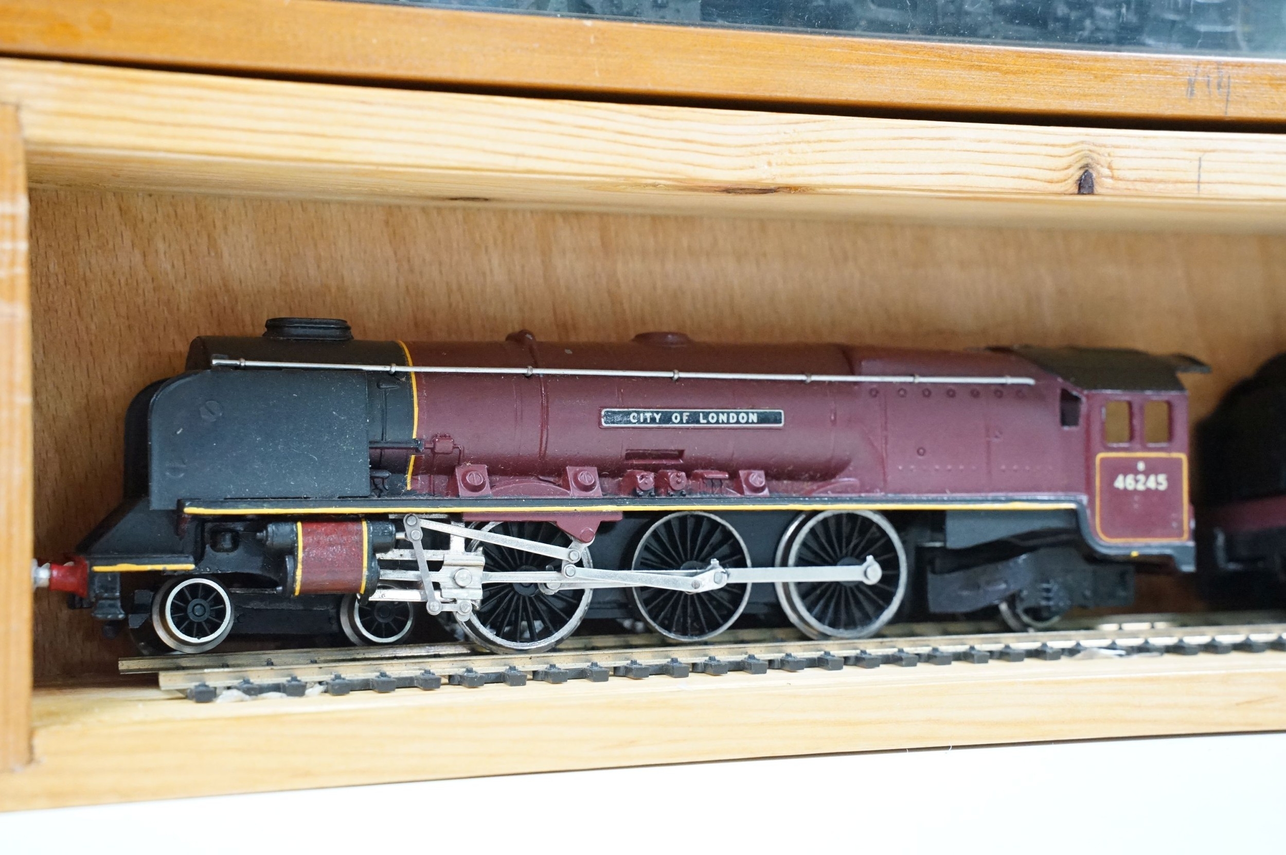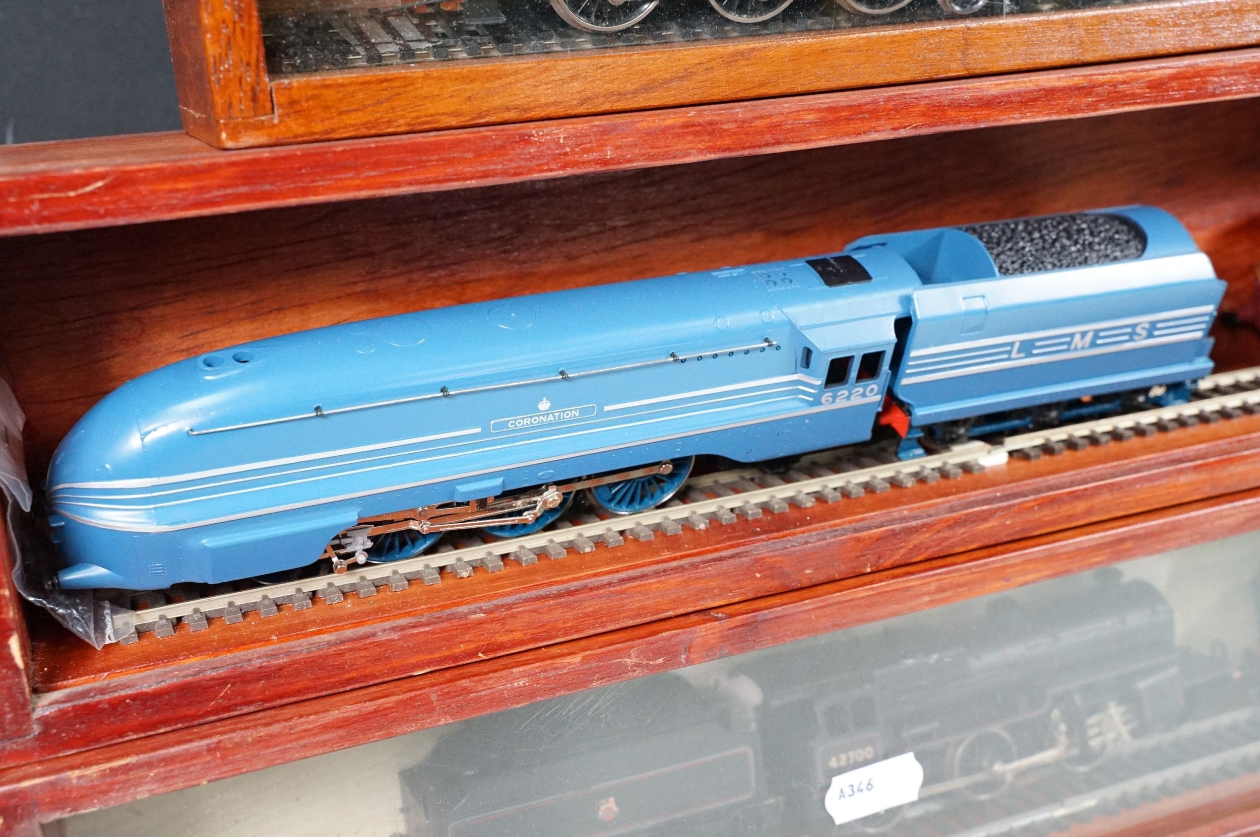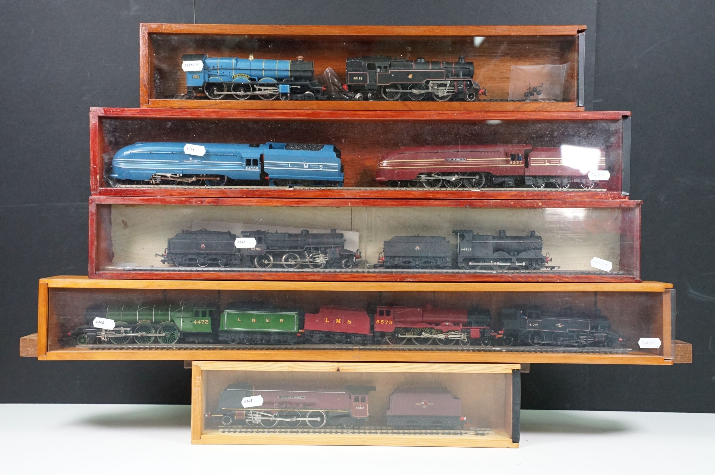 Ten OO gauge locomotives to include Hornby Flying Scotsman, Wrenn 80138 2-6-4, Hornby Coronation, Hornby City of Bristol, Lima 42700 2-6-0, Airfix 0-6-0 44454, Wrenn City of London etc, contained within 4 x display cases