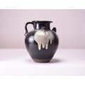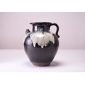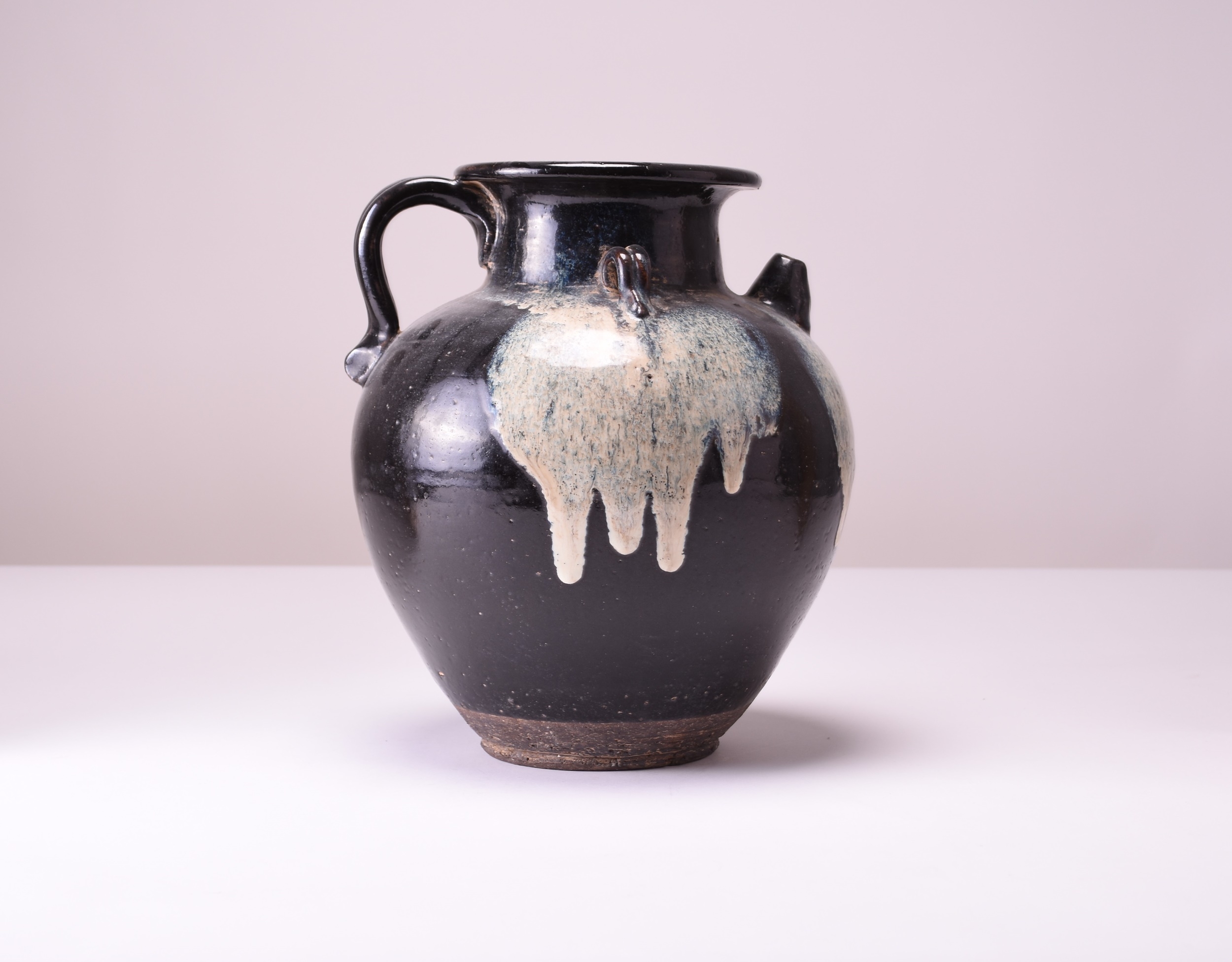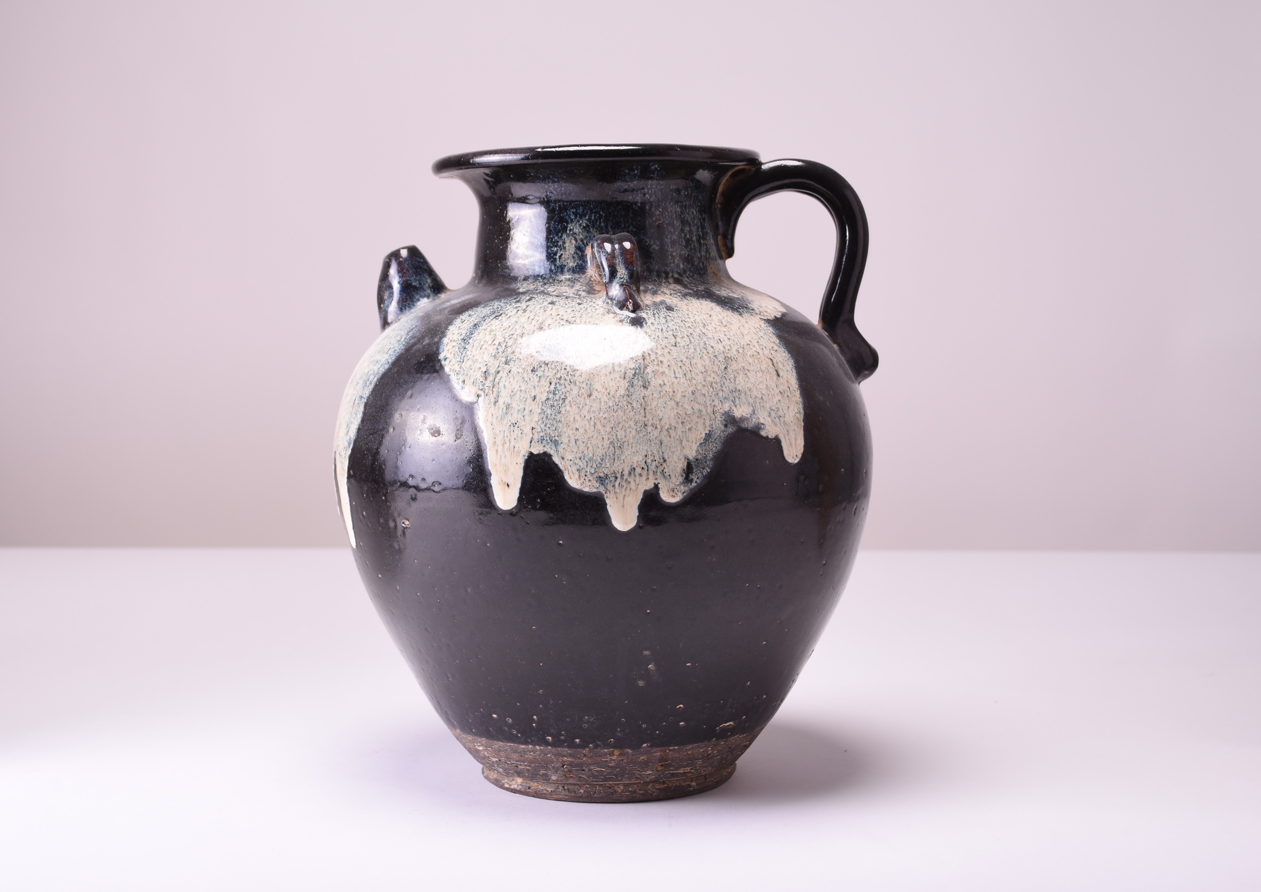 A Chinese Lushan phosphatic splash-glazed ewer, Tang Dynasty The heavily potted vessel with ribbed loop handles, everted rim and short conical spout, covered with a lustrous dark brown glaze stopping short of the foot, decorated with milky-blue phosphatic splashes. 31.5cm high Property of a private London collector. Footnote:For a vessel with very similar decoration see Christie's Hong Kong, Chinese Ceramics From The Yangdetang Collection, 30 November 2016, lot 3106. A ewer of very similar shape can be found in the collection of the Asian Art Museum, San Francisco, object no.B60P135.