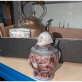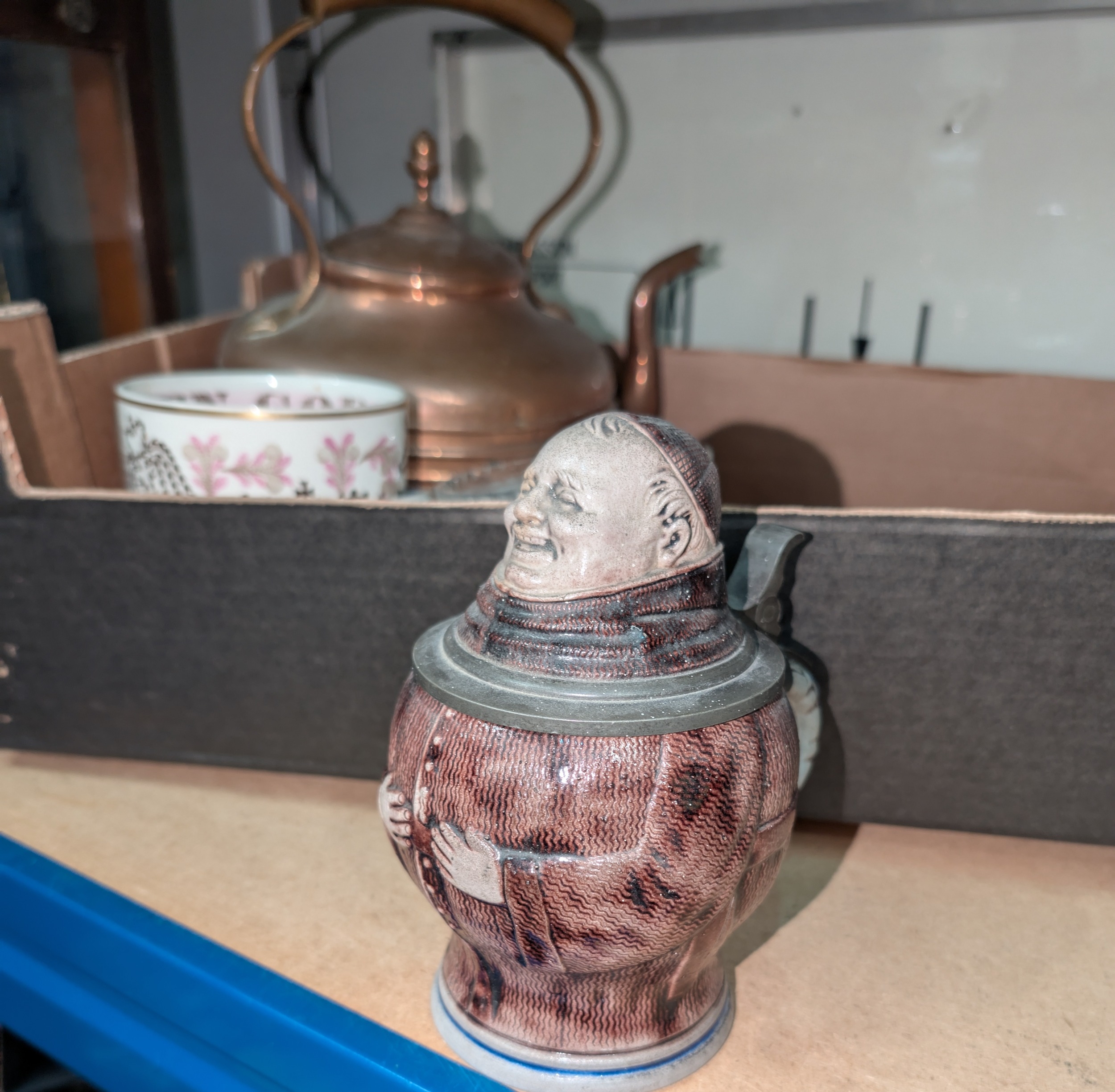 An unusual stoneware stein in the form of a monk with hinged lid; blue and white and other pottery; unusual etching, copper kettle etc