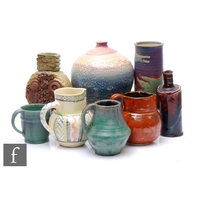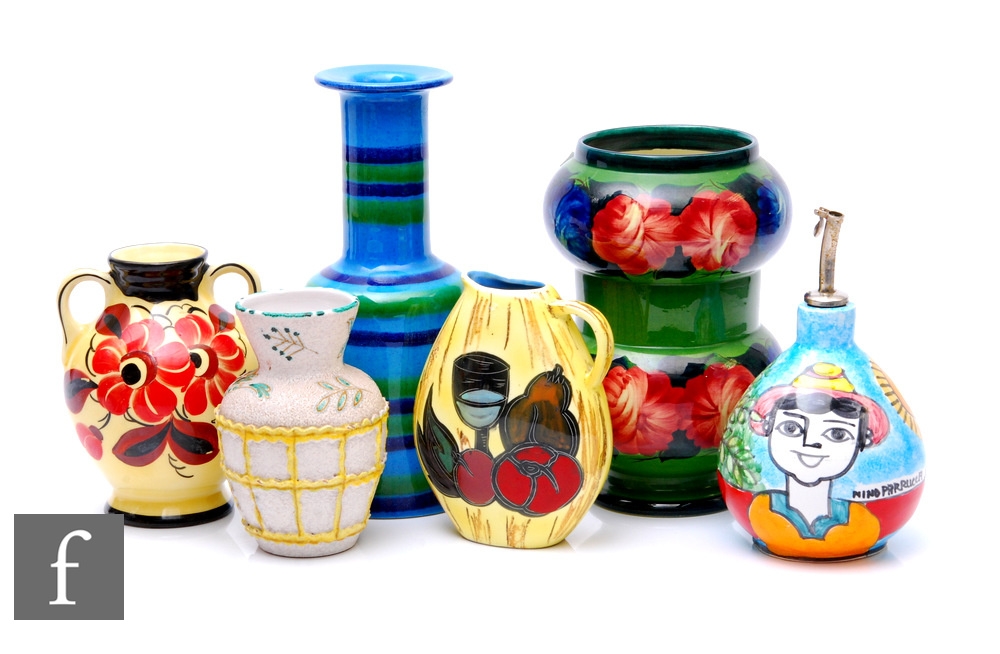 Nino Parrucca - A mid 20th Century olive oil flask of ovoid form, decorated with scenes of a farmer in a sunny olive grove, together with five other Italian vases and jugs to include Baldelli and Fratelli Fanciullacci, tallest 25cm. (6)