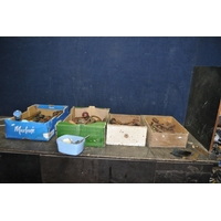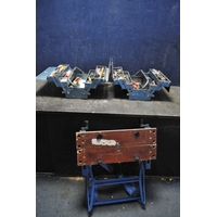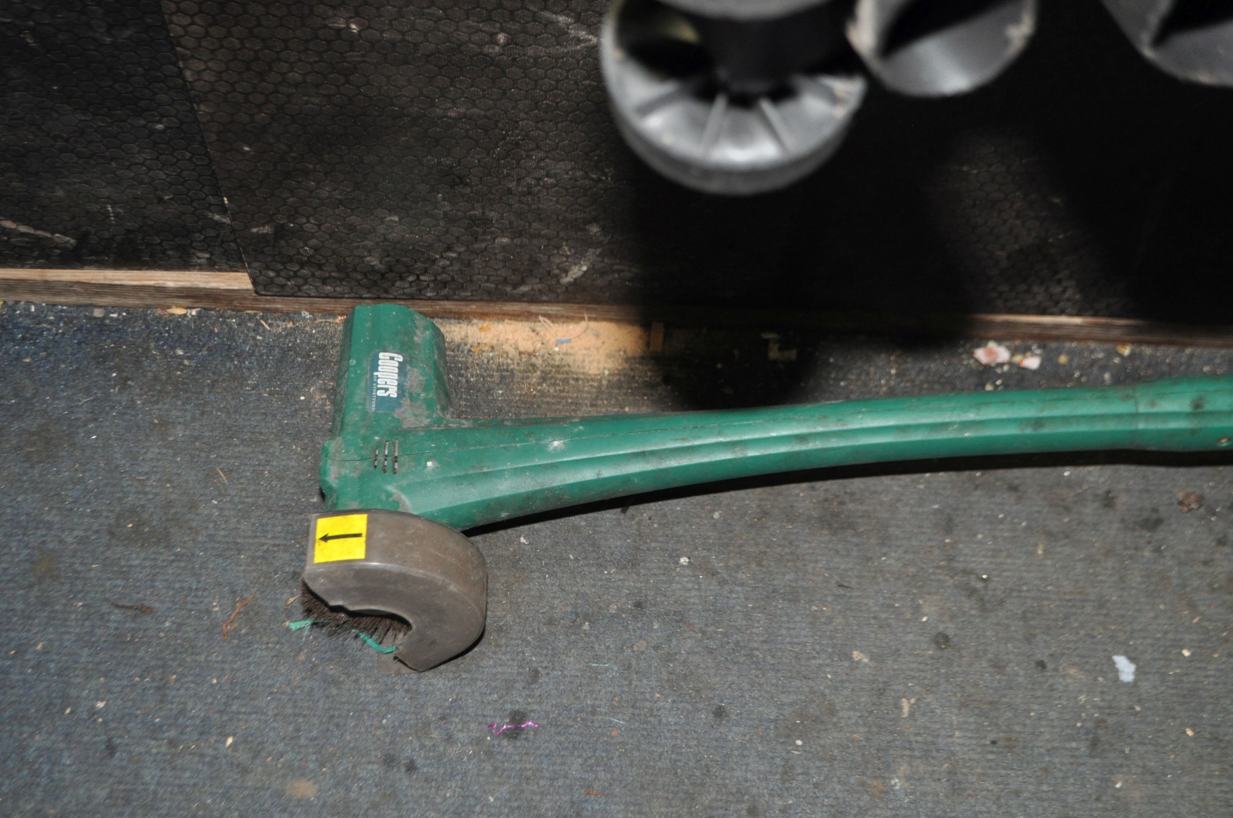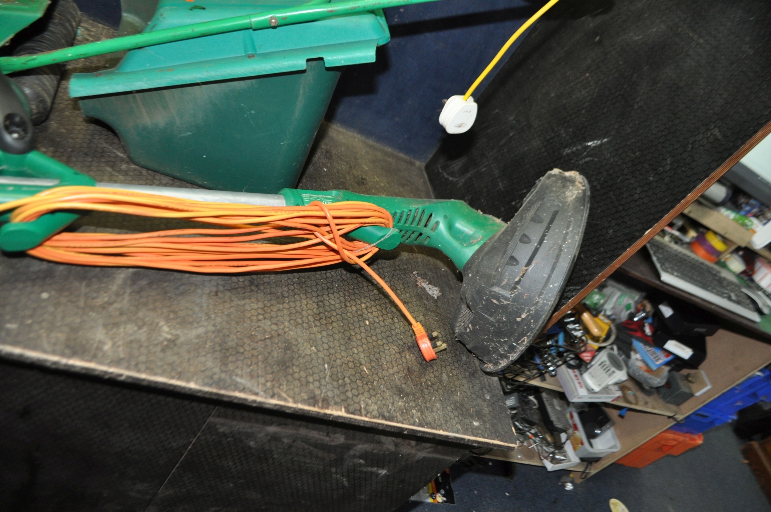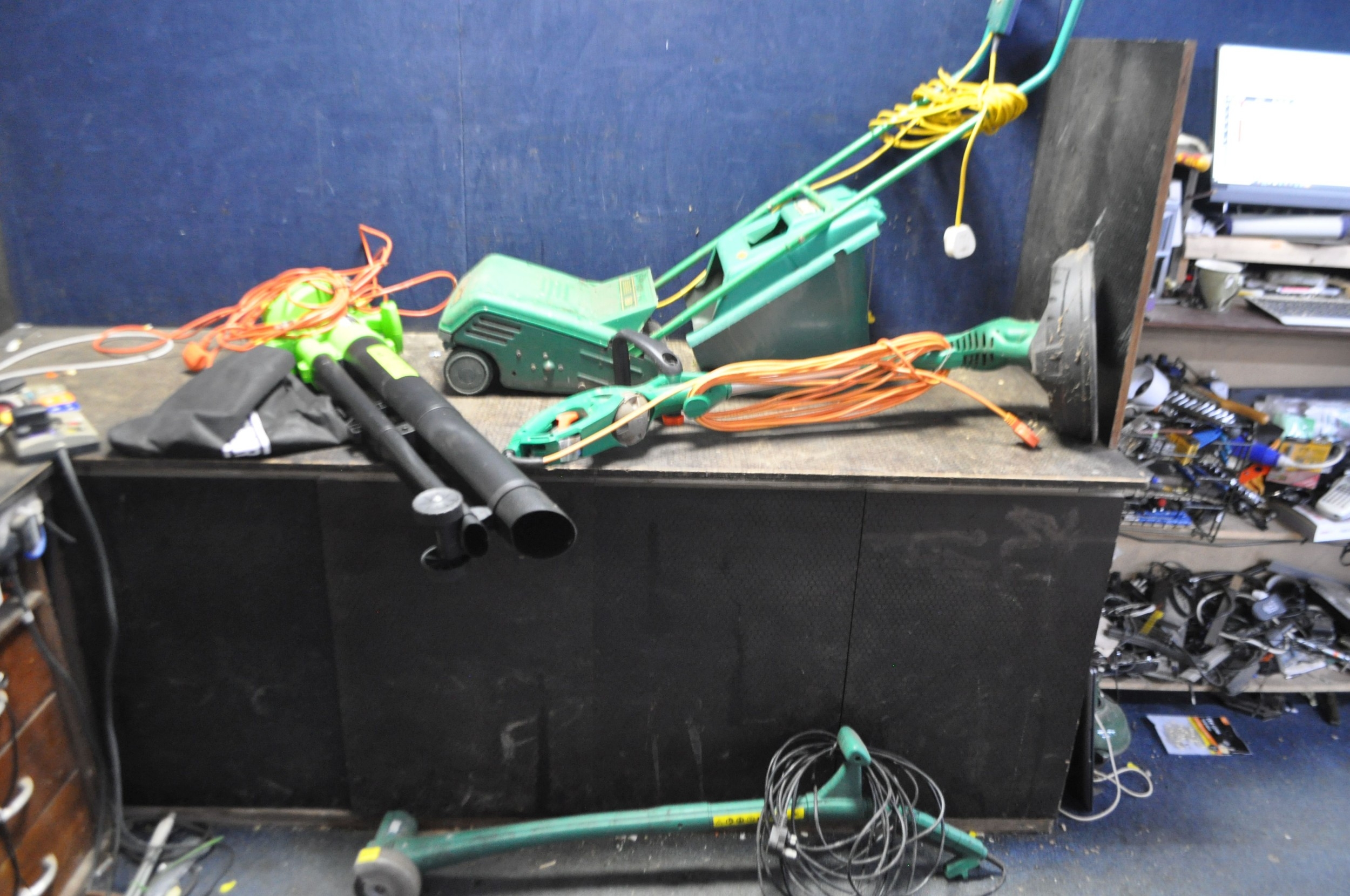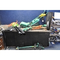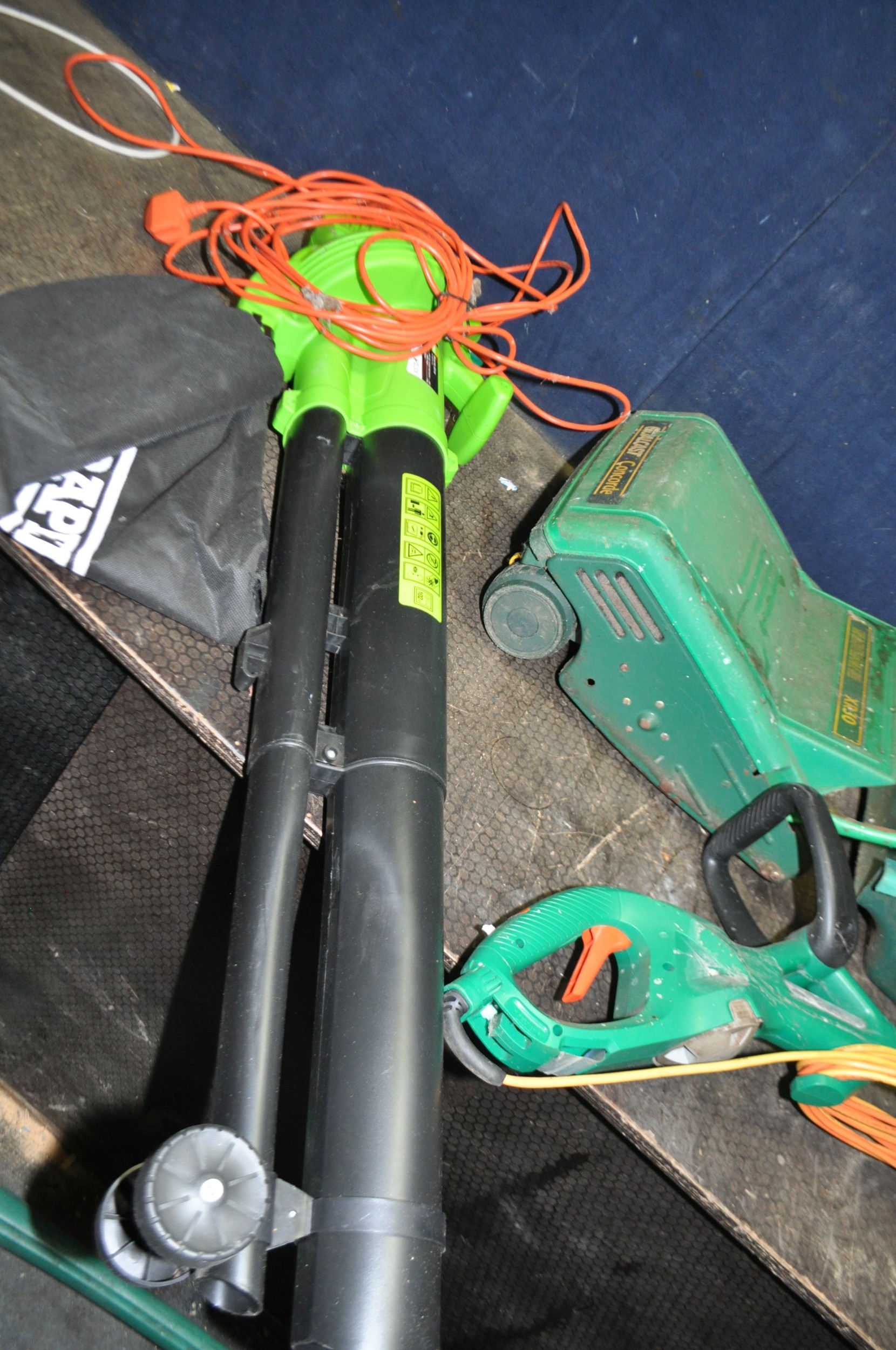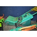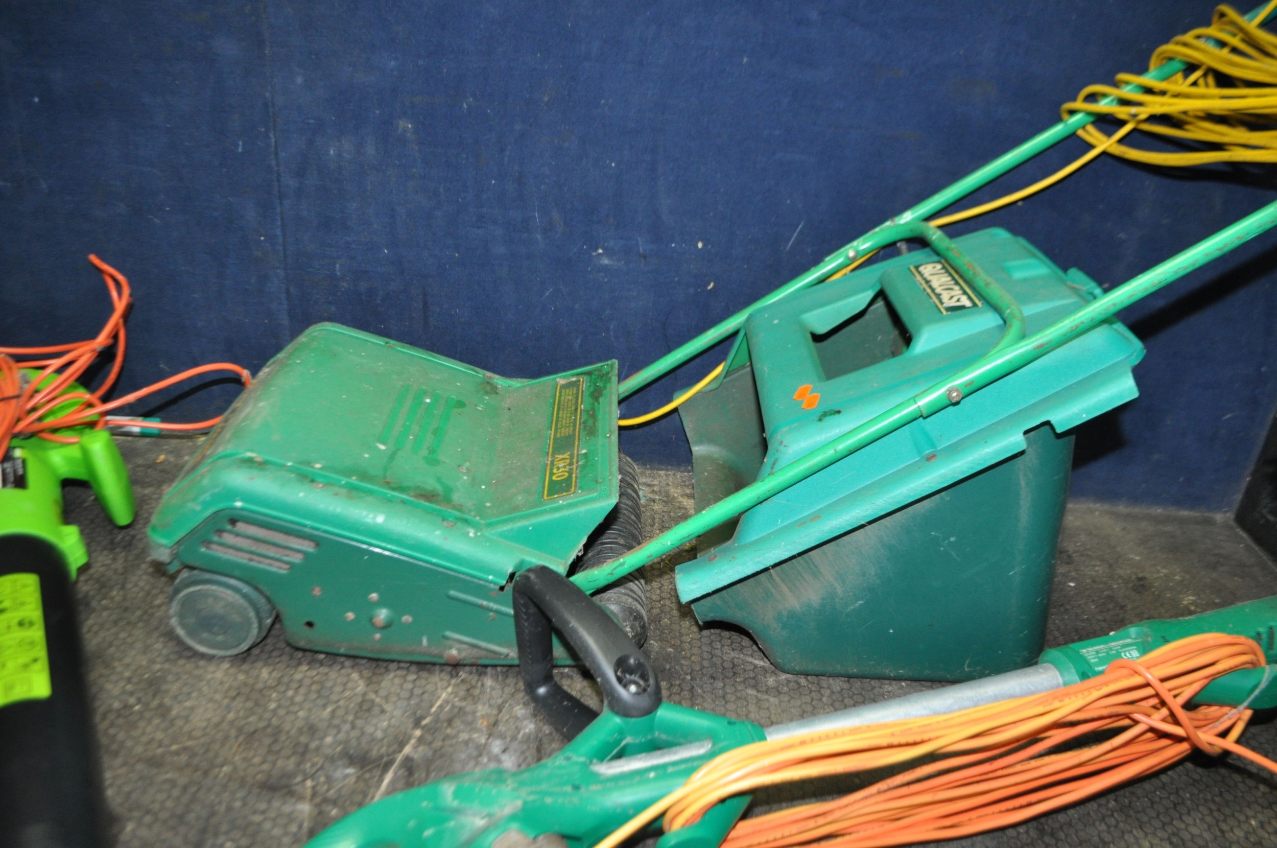 A SELECTION OF GARDEN POWER TOOLS including a Black and Decker strimmer, a Draper Blower/Vac, a Qualcast XR30 lawn mower with grassbox (needs servicing) and a Coopers patio cleaner (all PAT pass and working) (4)