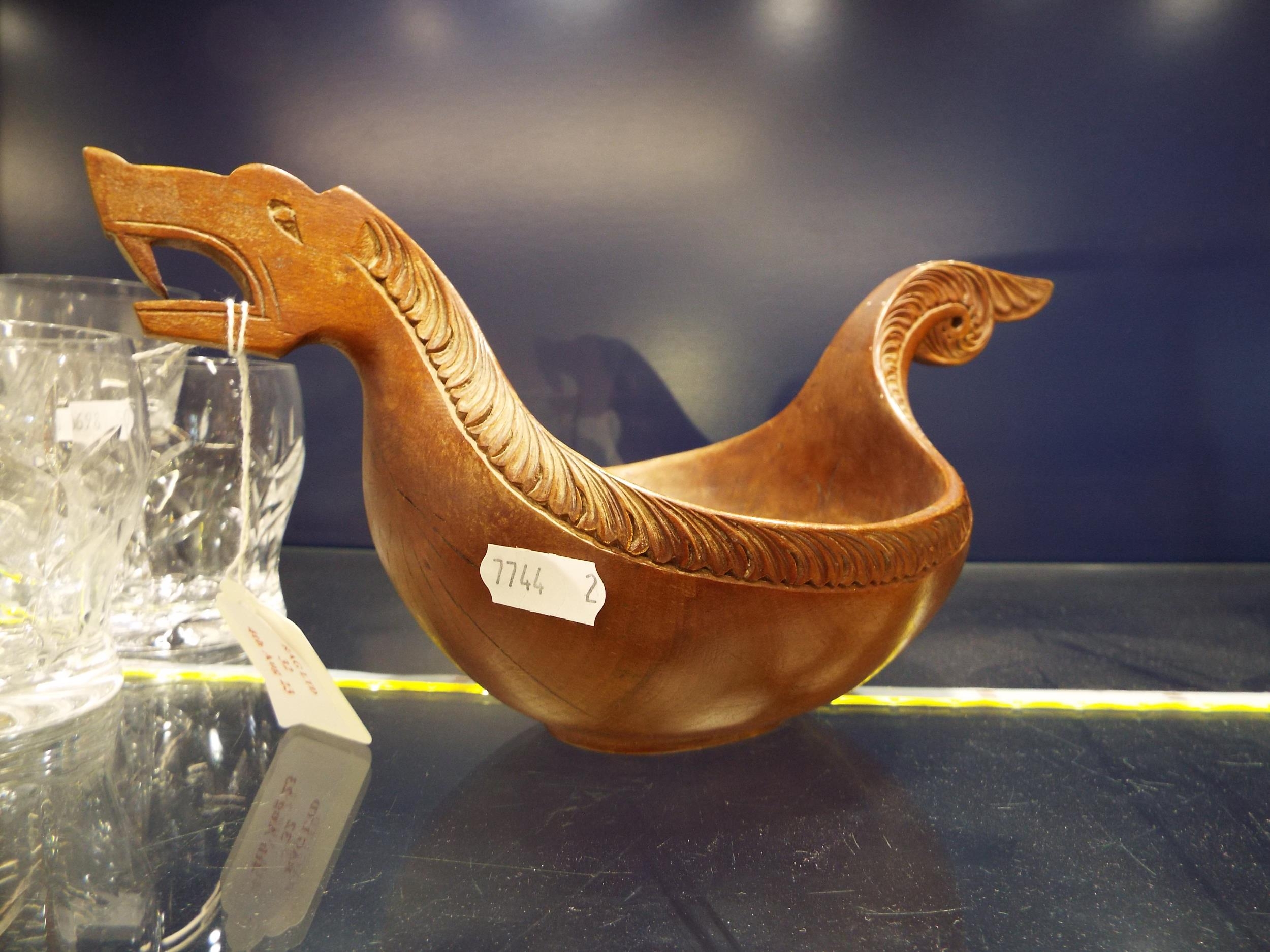 A Norwegian wooden Kasa with a carved dragon design