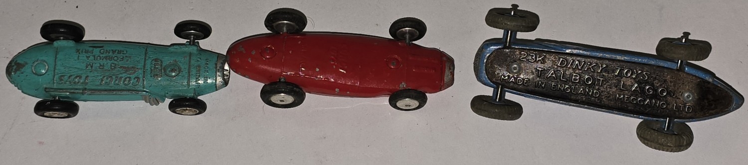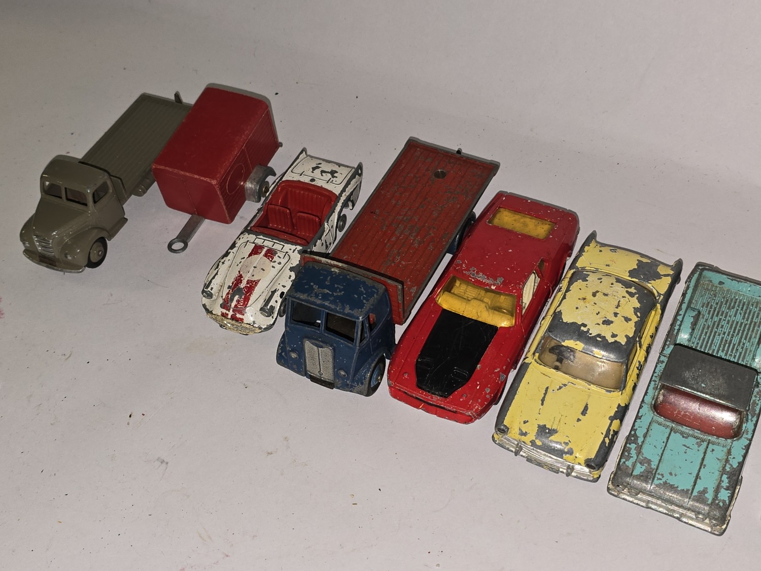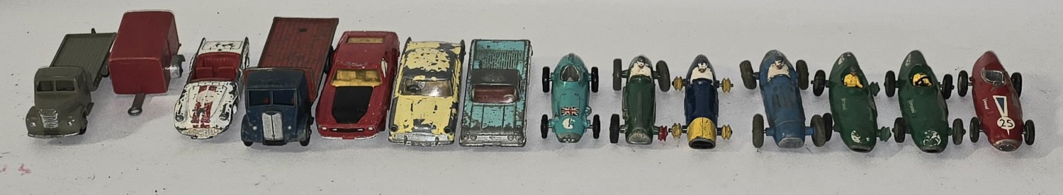 A collection of vintage play worn die cast to include Dinky and Corgi sports cars.
