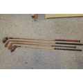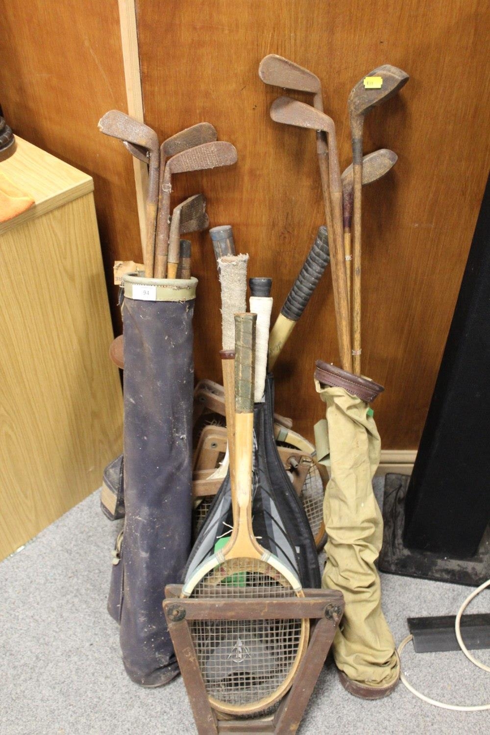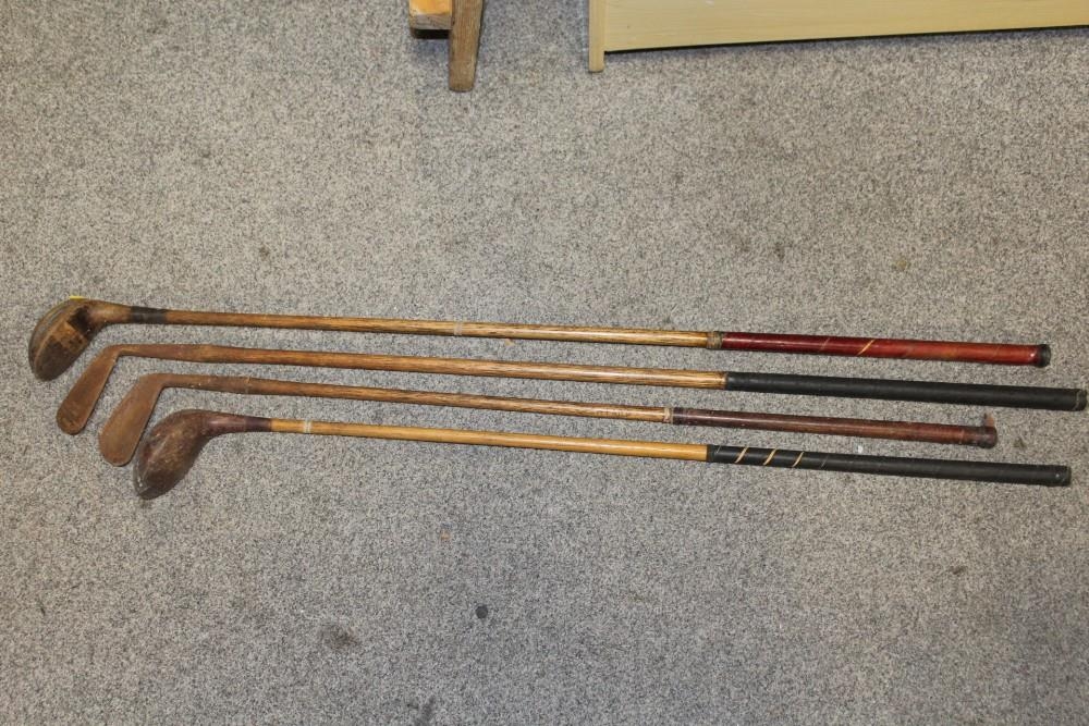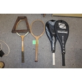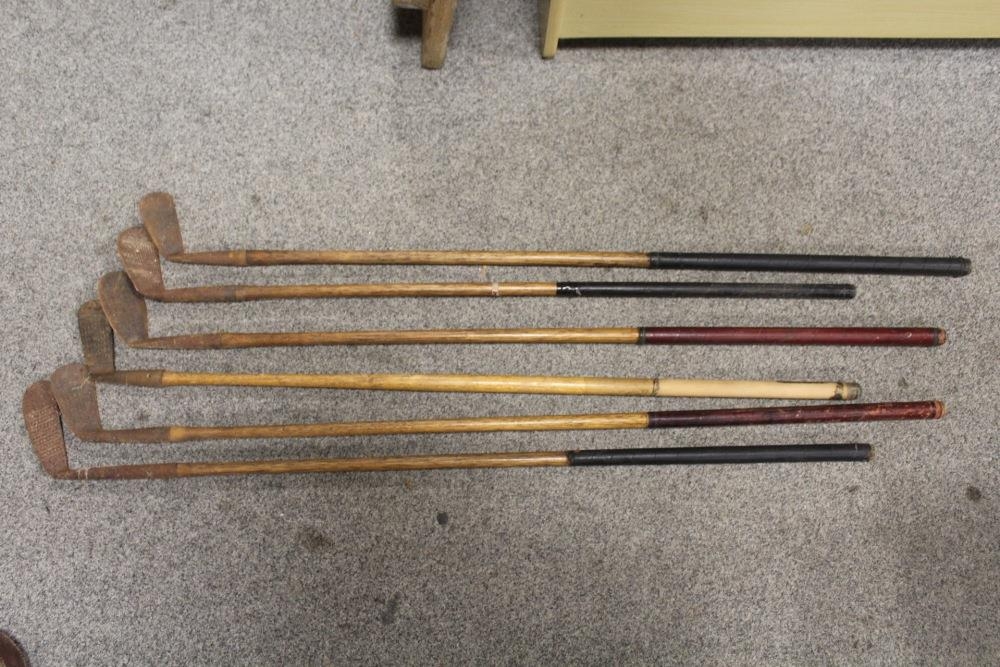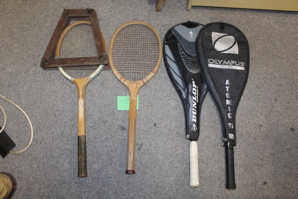 A LARGE QUANTITY OF VINTAGE WOODEN HANDLED GOLF CLUBS, some marked C H Clay, together with a quantity of vintage and modern tennis rackets