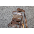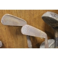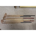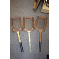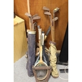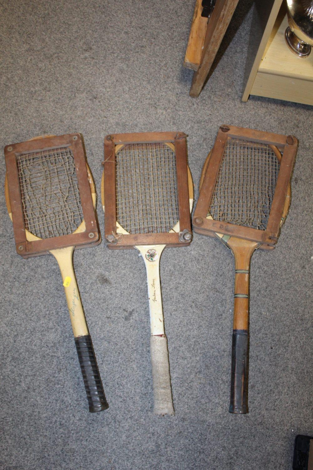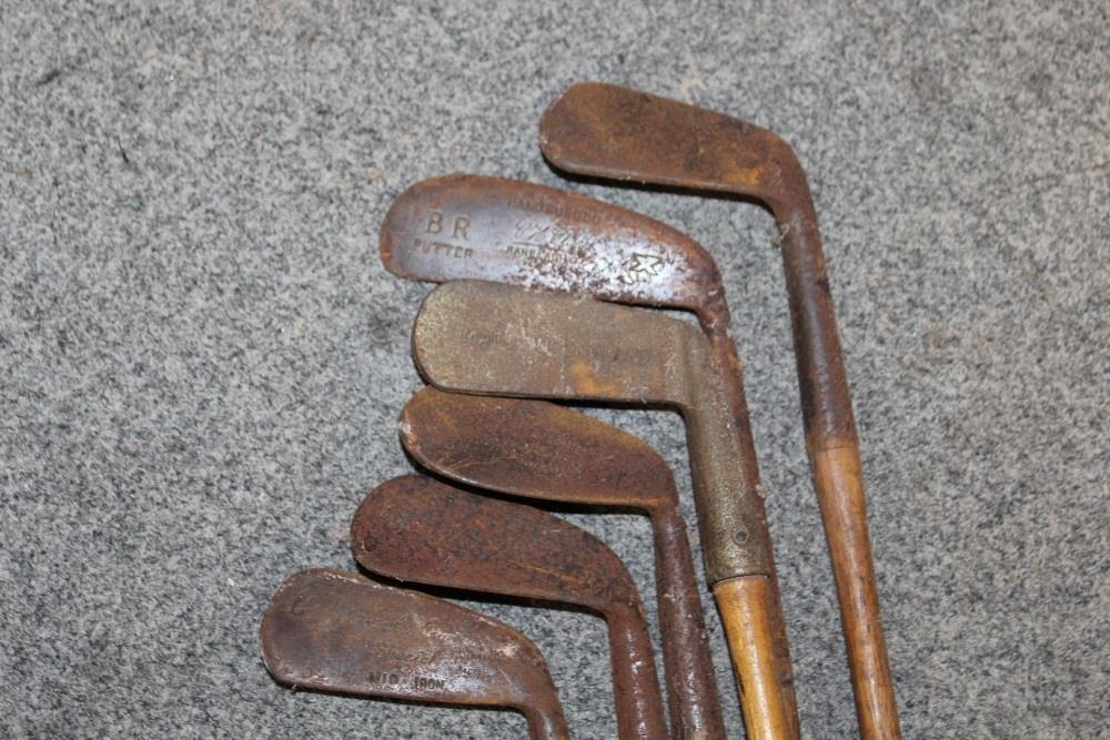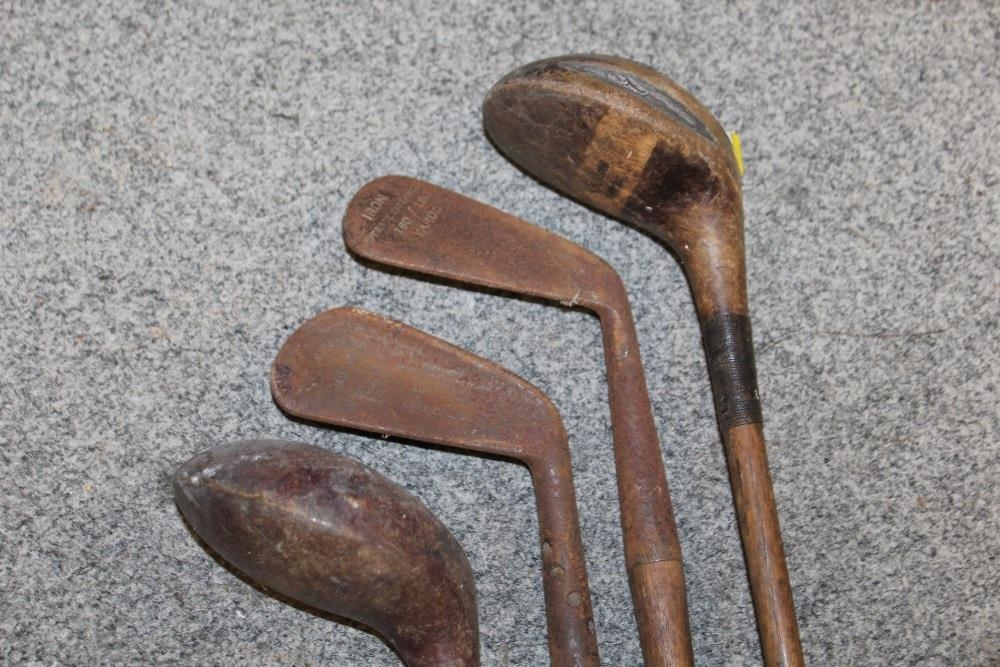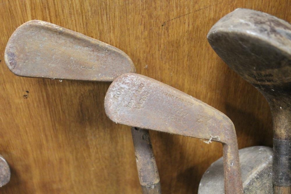 A LARGE QUANTITY OF VINTAGE WOODEN HANDLED GOLF CLUBS, some marked C H Clay, together with a quantity of vintage and modern tennis rackets
