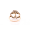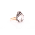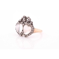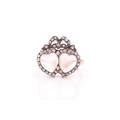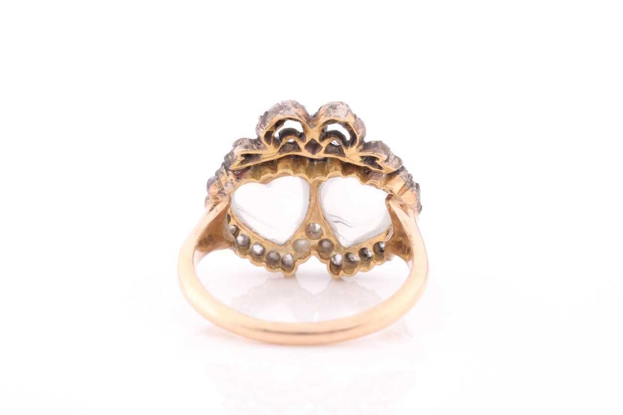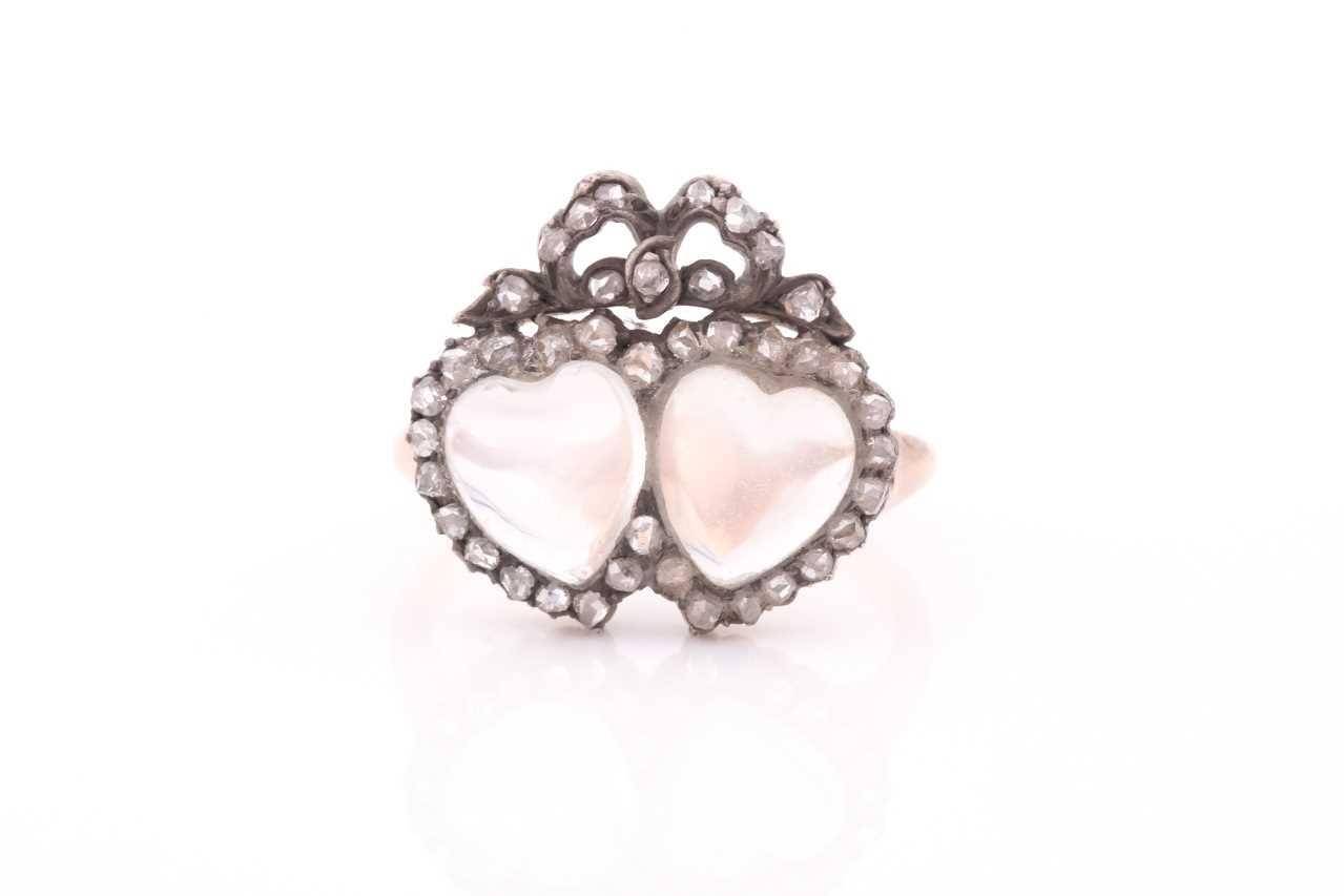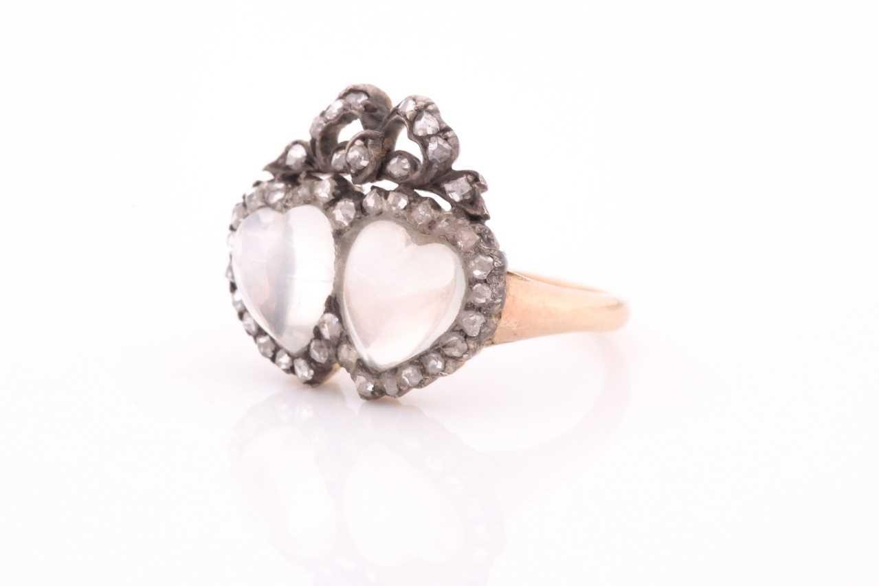 An antique diamond and moonstone double heart ring, the mount set with heart-shaped cabochon moonstones, within a border and bow-shaped surmounted inset with rose-cut diamonds, on a yellow metal shank, unmarked, size M 1/2, 4.4 grams.