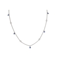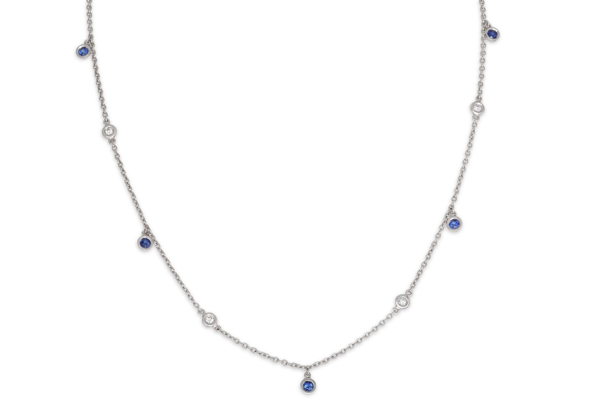 A DIAMOND AND SAPPHIRE NECKLACE, collet set diamonds and drop sapphires, mounted in 18ct white gold, approx. 17"