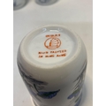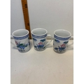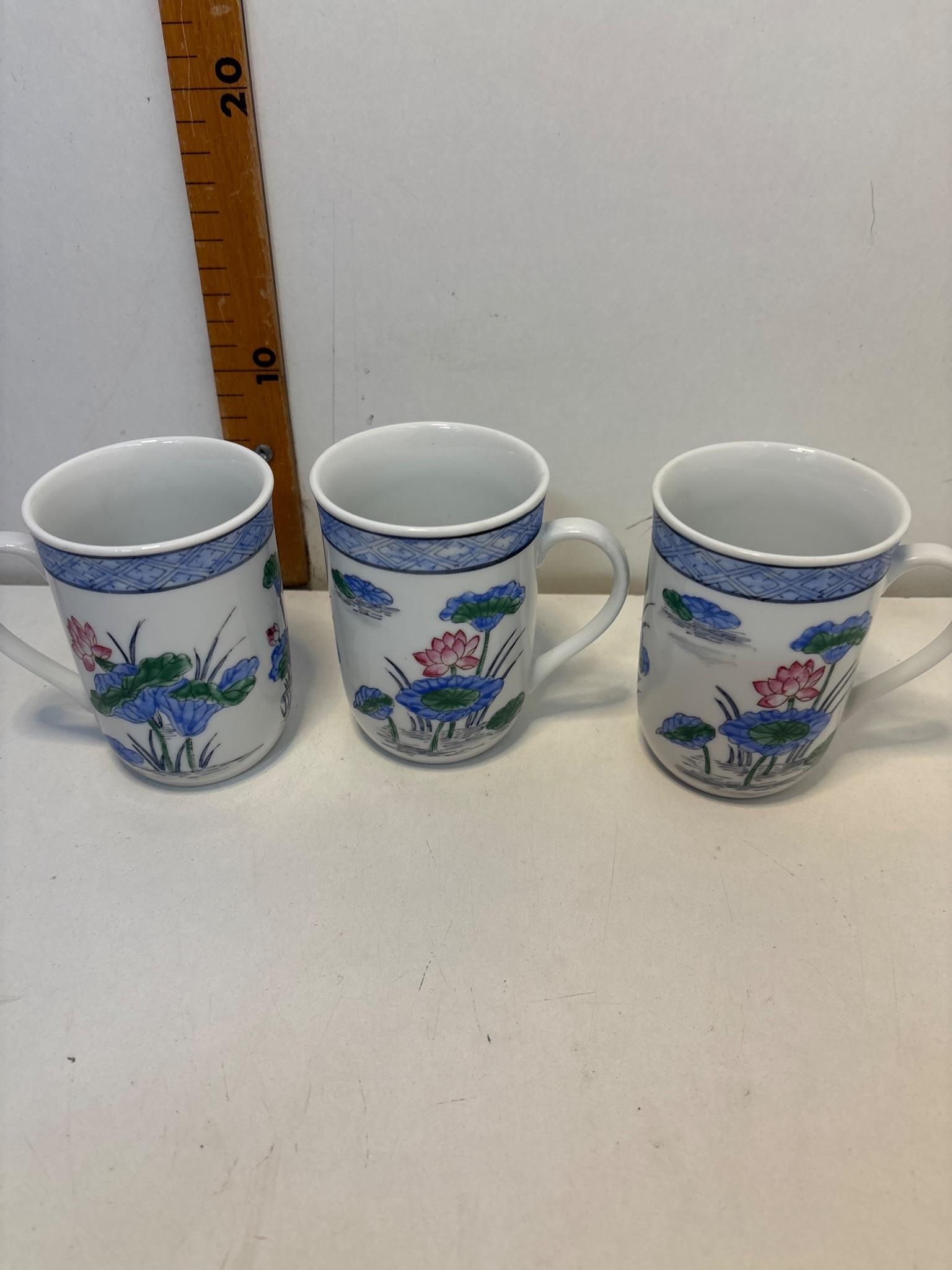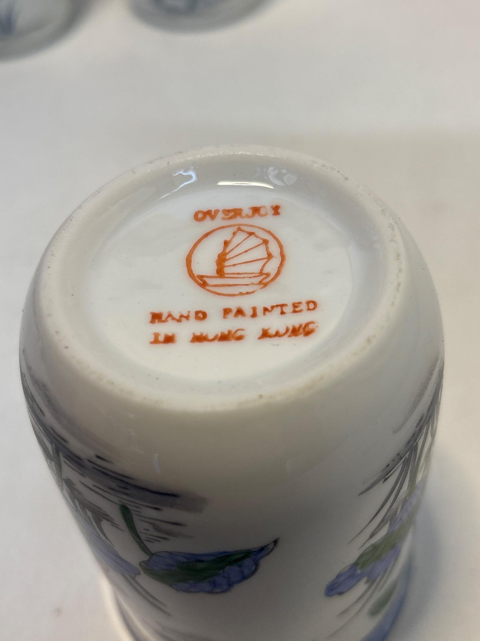 Three hand-painted porcelain mugs featuring a lotus design. Marked 'Overjoy, Hand Painted in Hong Kong' on the base.