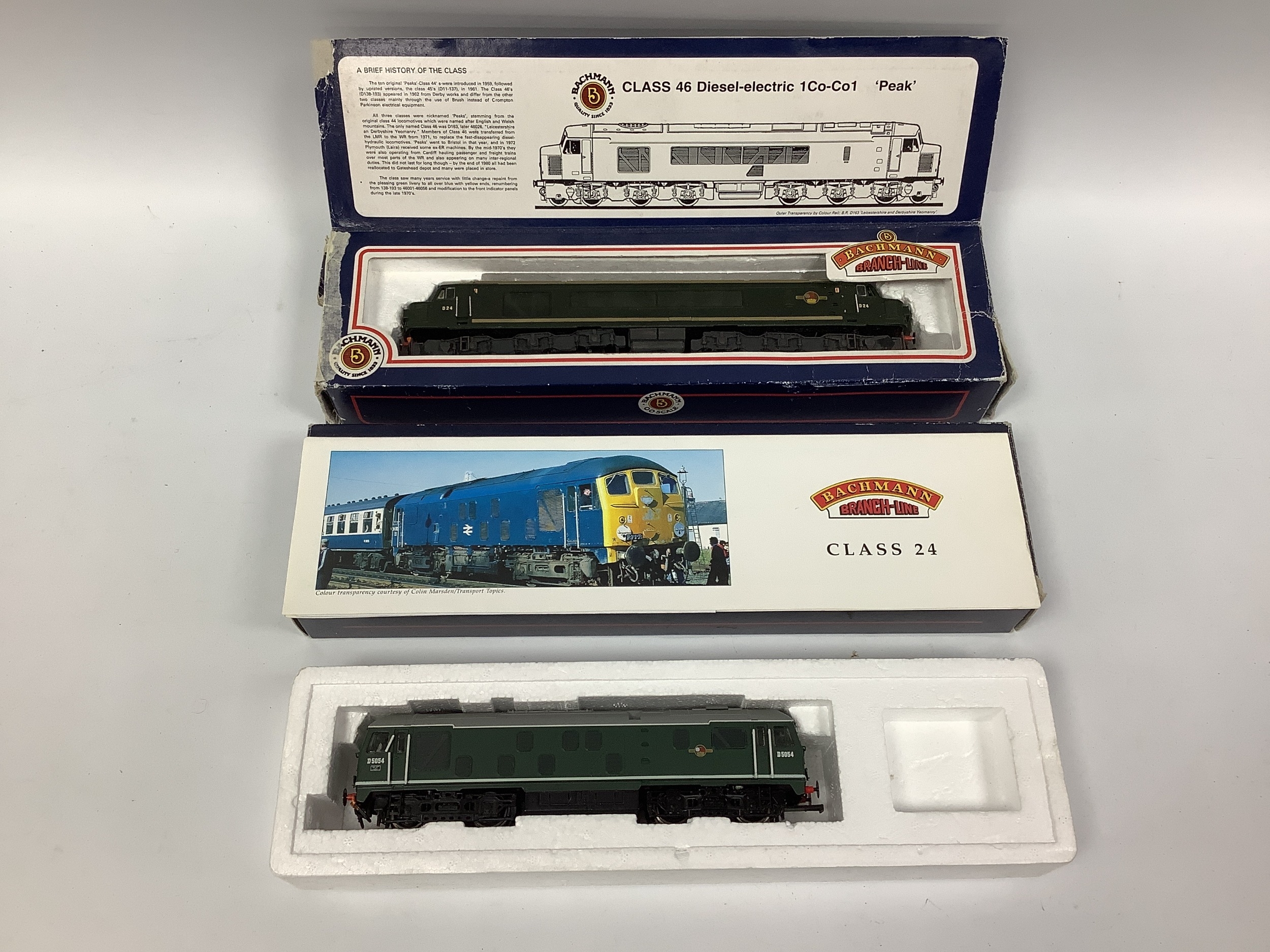 Two boxed Bachmann 00 gauge BR green diesel locomotives: a Class 46 "Peak" running number "D24" with split headcode boxes and green ends; and Class 24 "D5054" with full green ends (slight damage to one cab handrail, buffer beam detail added at one end); both untested, boxes showing wear.