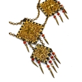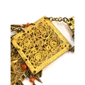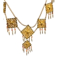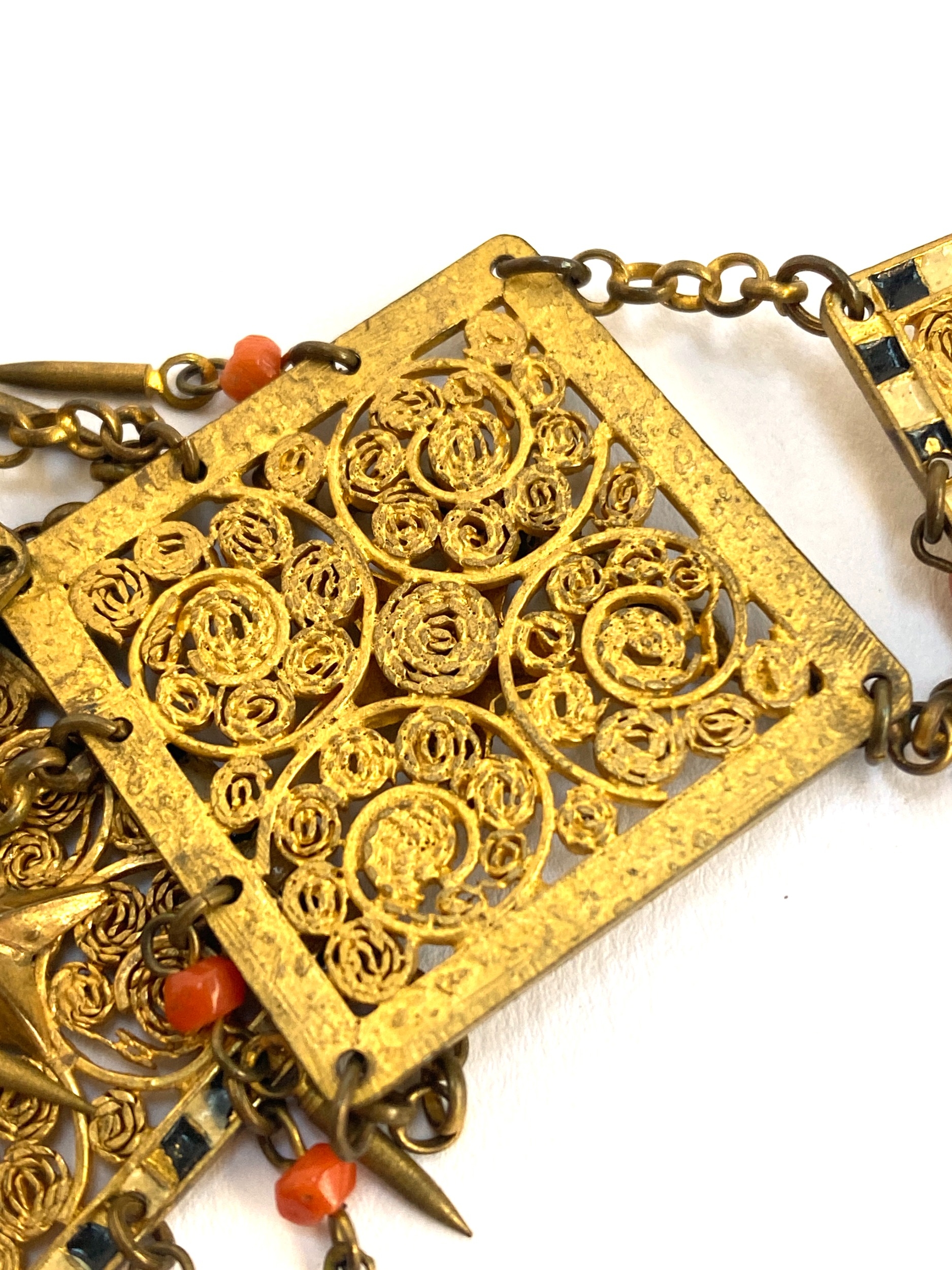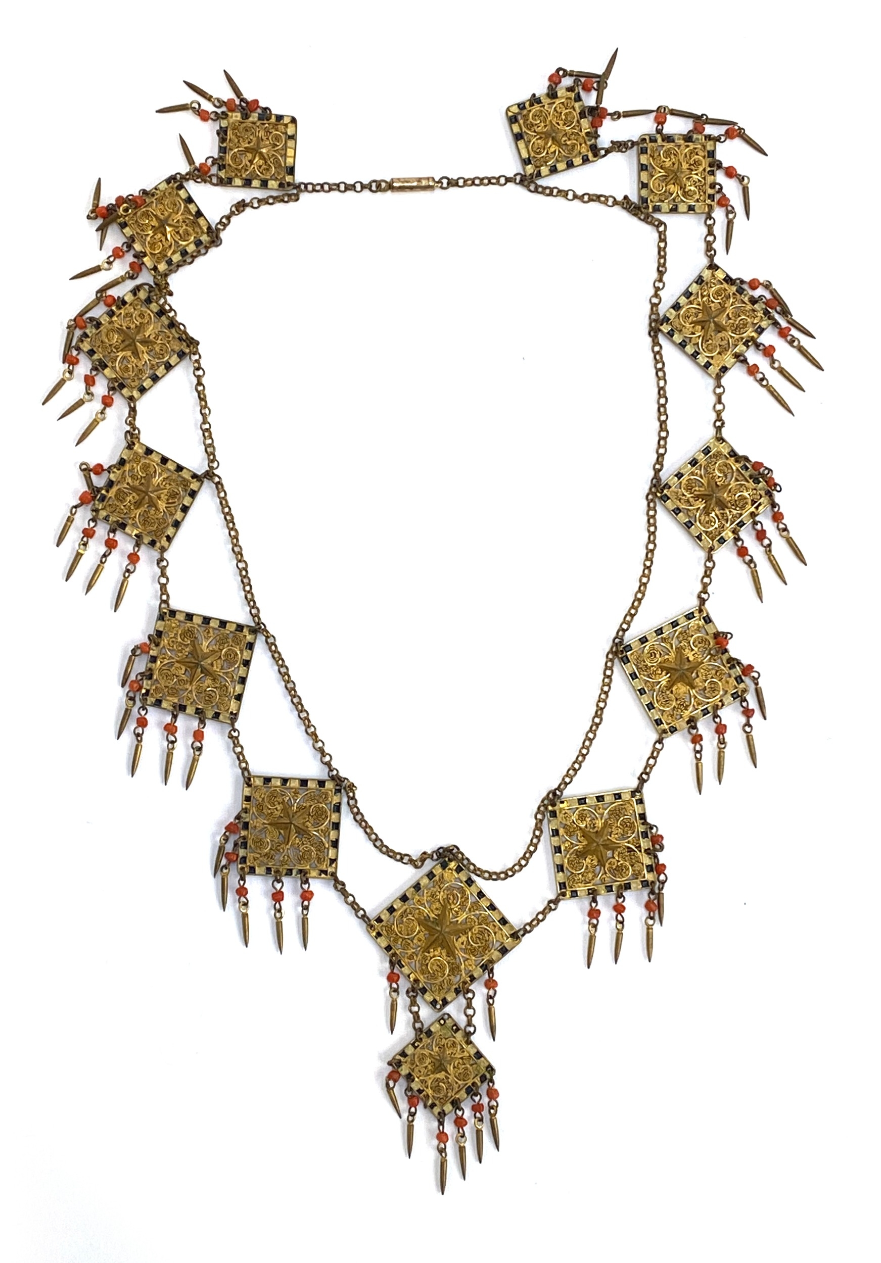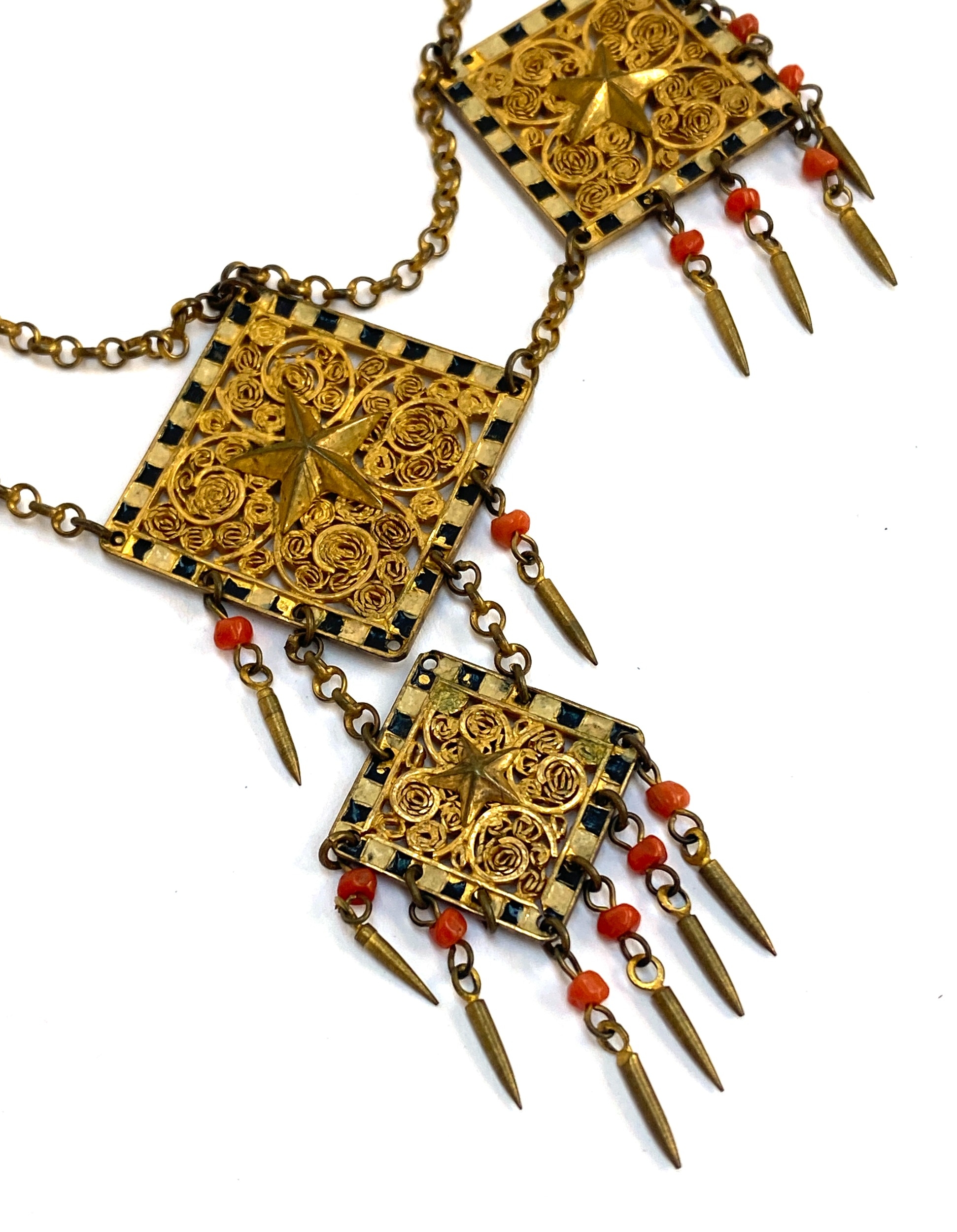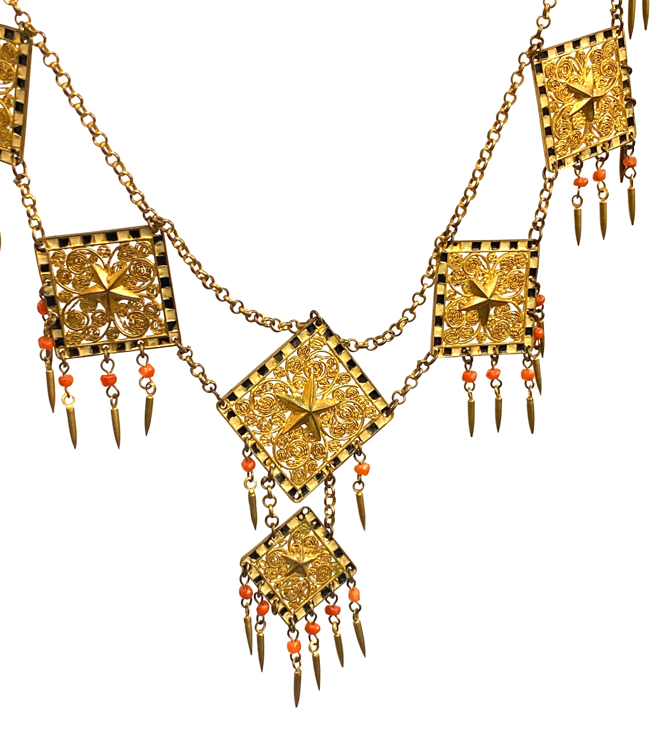 An early 20th century Czech gilt metal filigree necklace, the square panels with applied star detail, cold painted black and white enamel and coral bead tassel drops