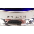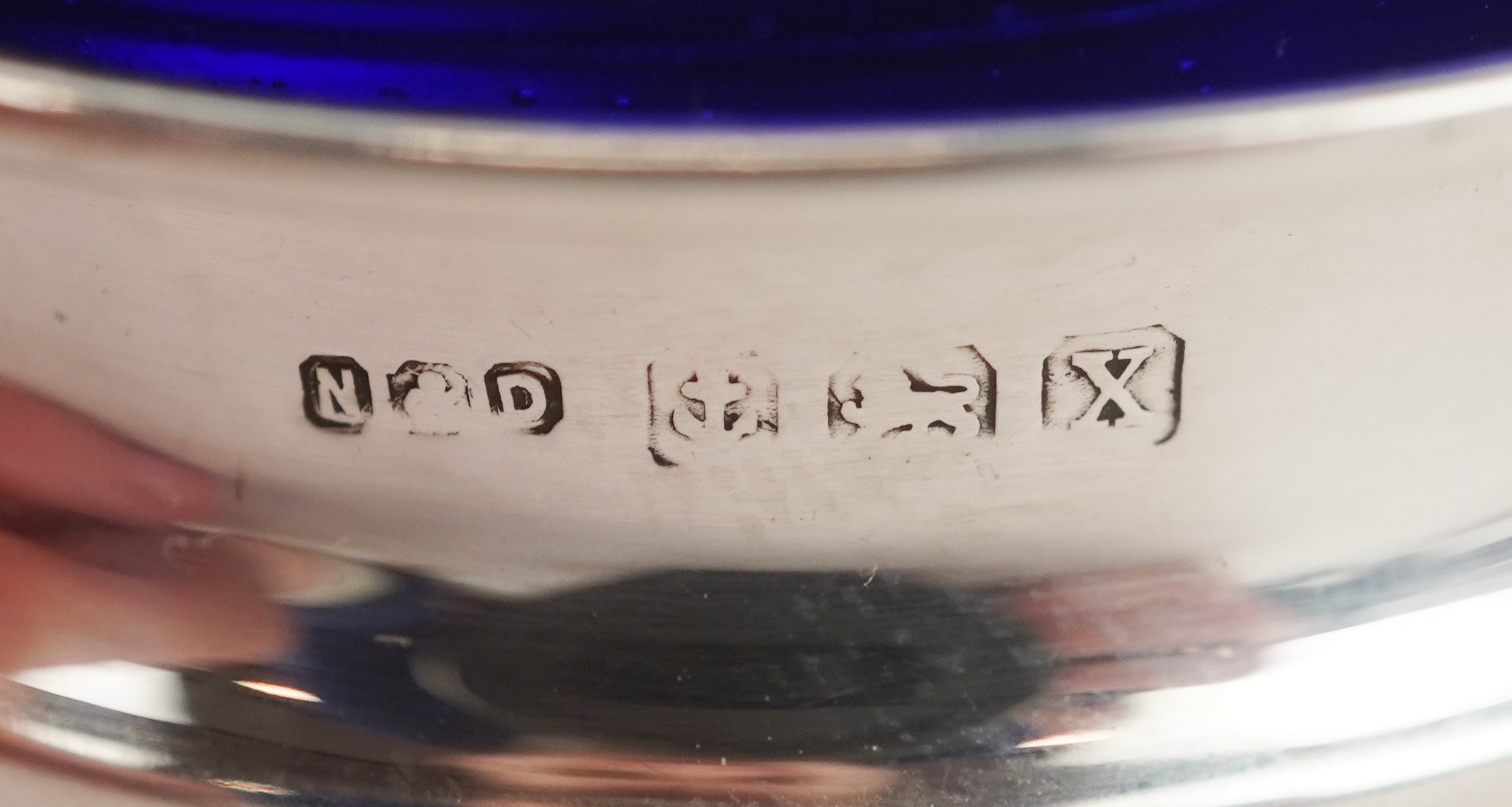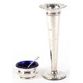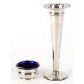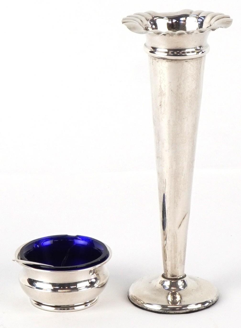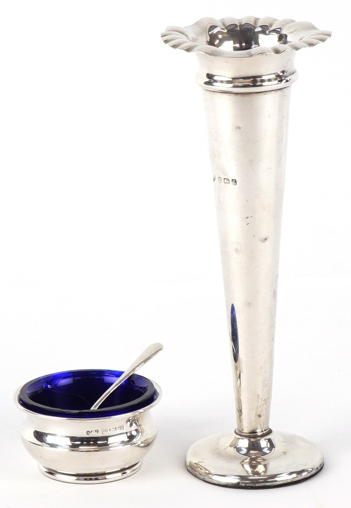 A Napper & Davenport open salt with blue glass liner and mustard spoon, Birmingham 1922 together with an Edwardian candlestick, Birmingham 1906, the largest 14.5cm high, total weighable silver 86.1g.