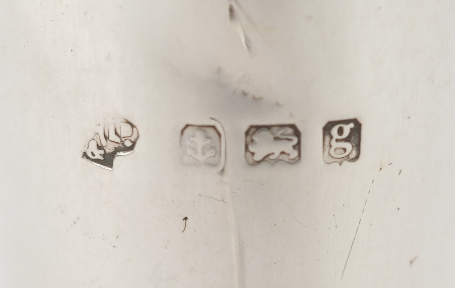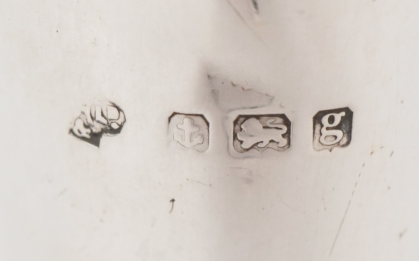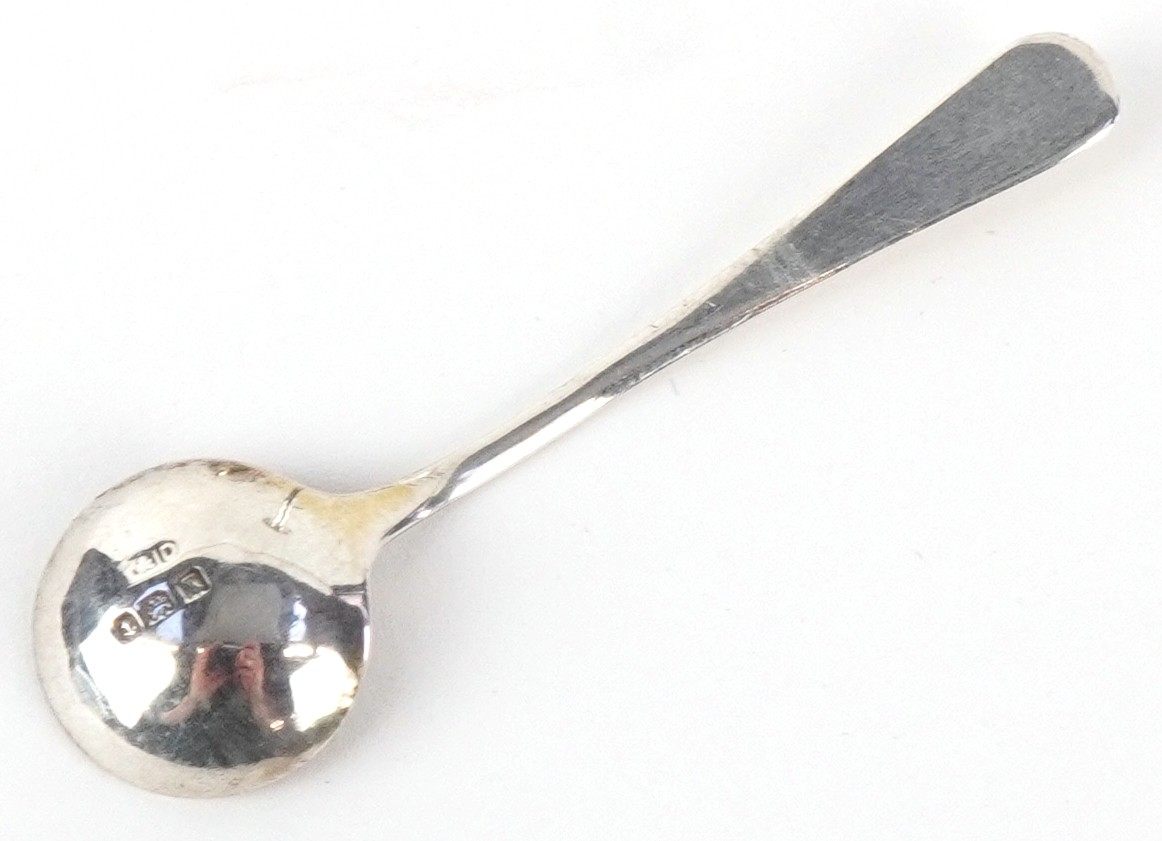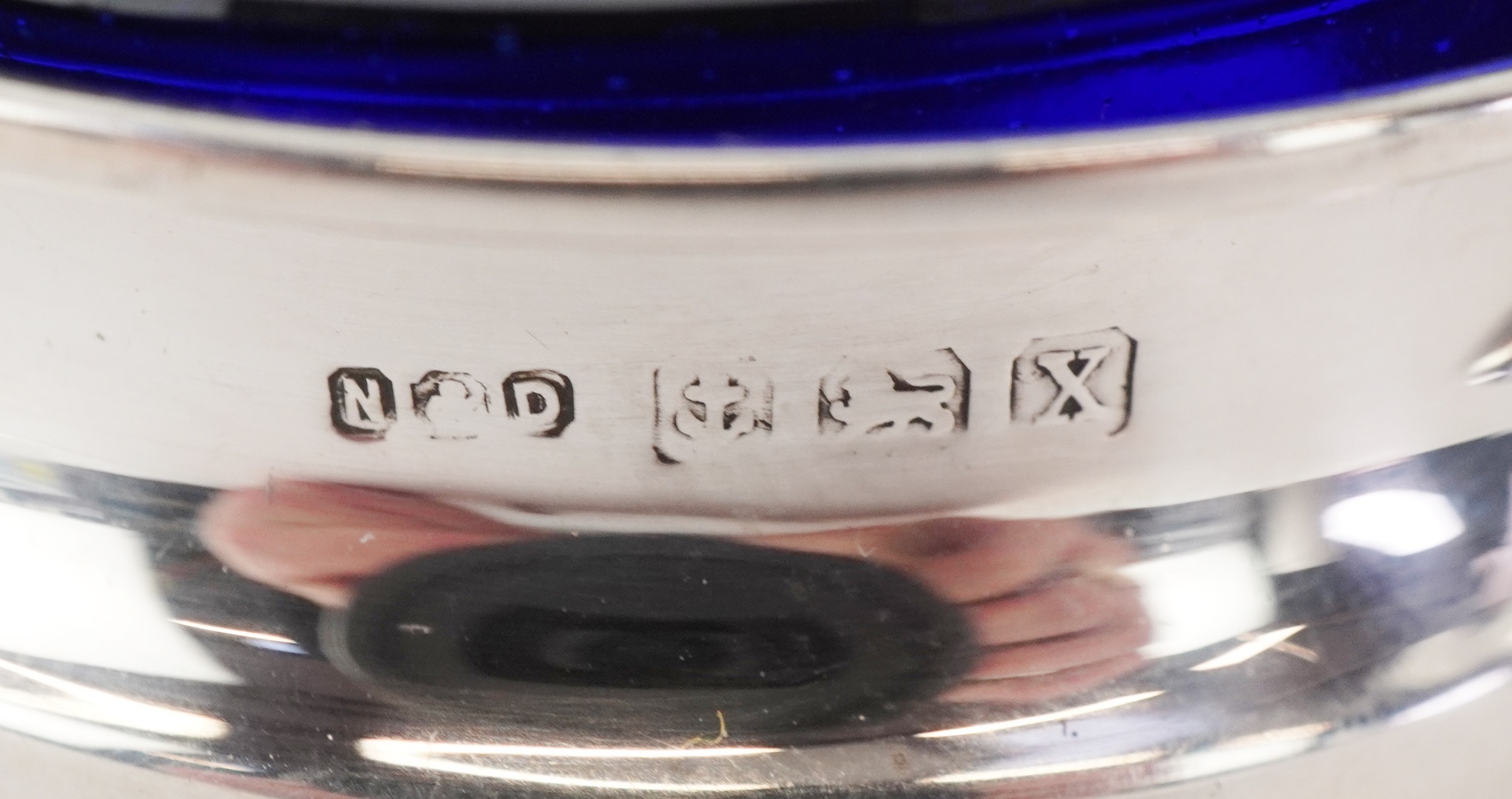 A Napper & Davenport open salt with blue glass liner and mustard spoon, Birmingham 1922 together with an Edwardian candlestick, Birmingham 1906, the largest 14.5cm high, total weighable silver 86.1g.