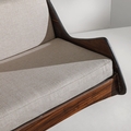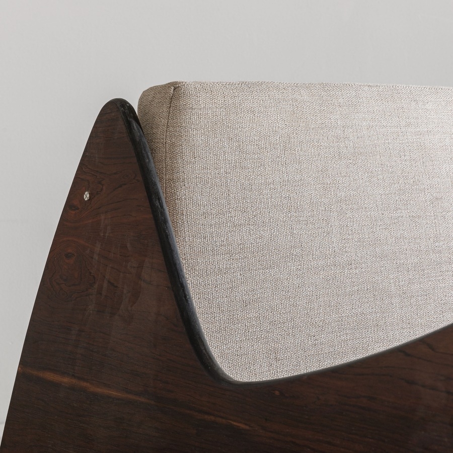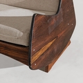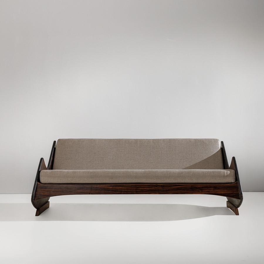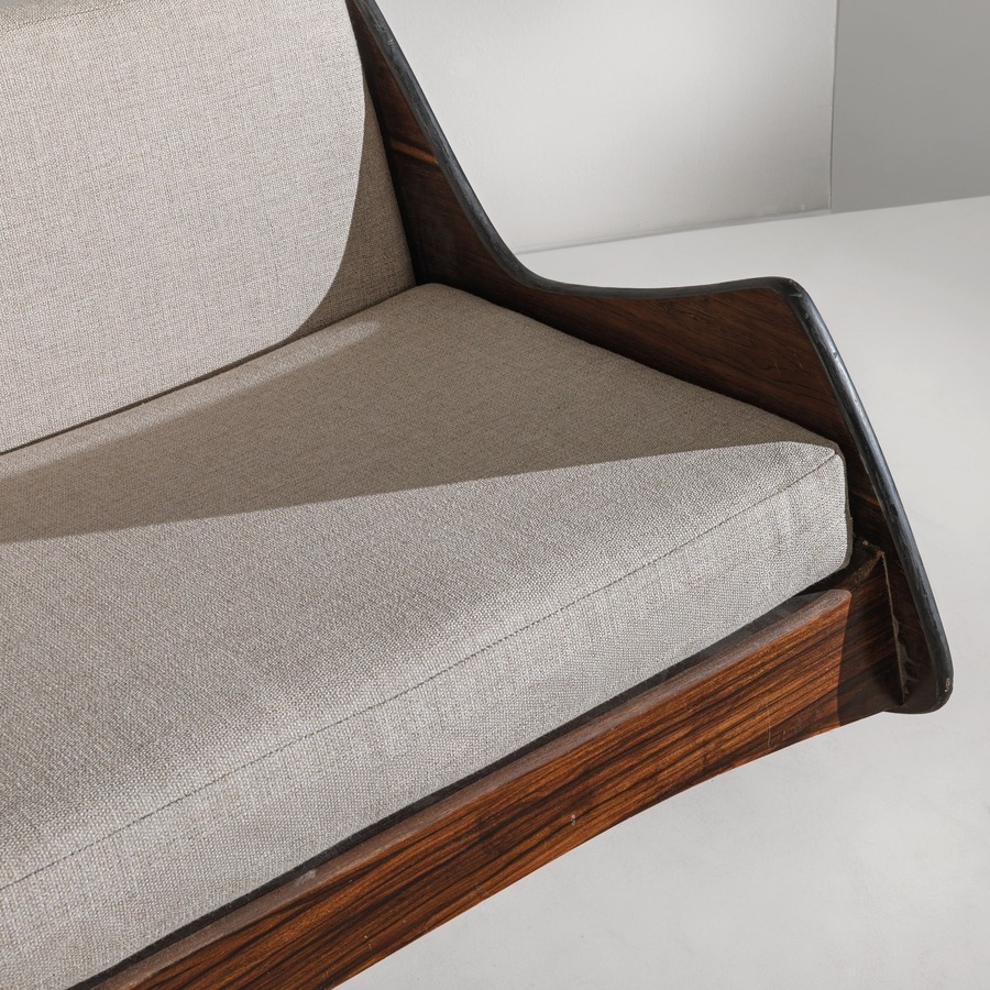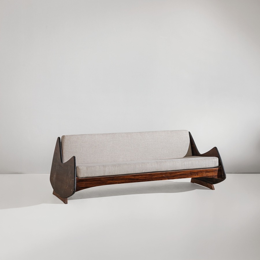 Divano mod. Ameba. Legno, legno impiallacciato in legno esotico, tessuto imbottito. Brasile anni '60.