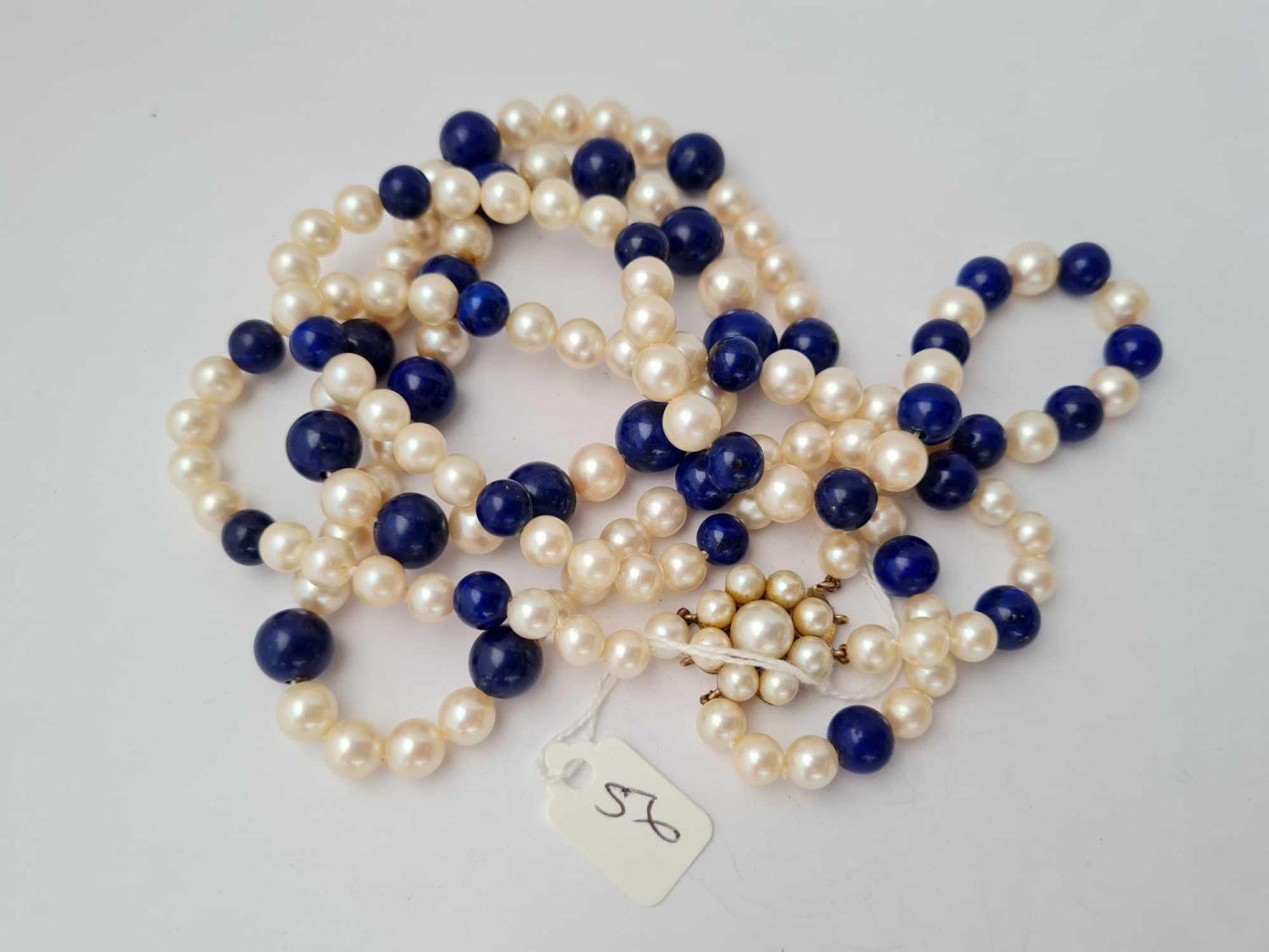 A long pearl and lapis bead necklace