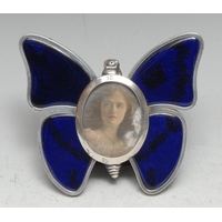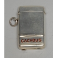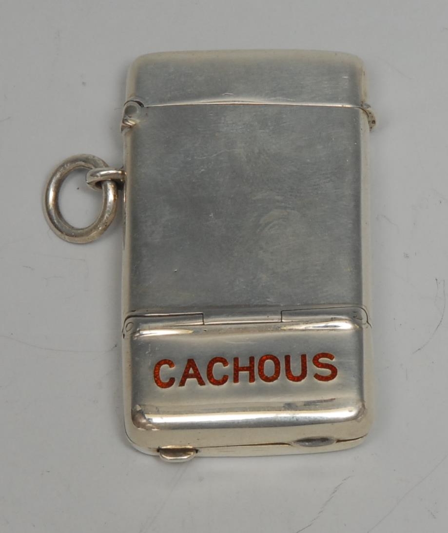 A Victorian silver and enamel combination vesta case and bonbonniere, hinged cover with striker, compartment to base labelled Cachous, 5.5cm long, Britton, Gould & Co, Birmingham 1900
