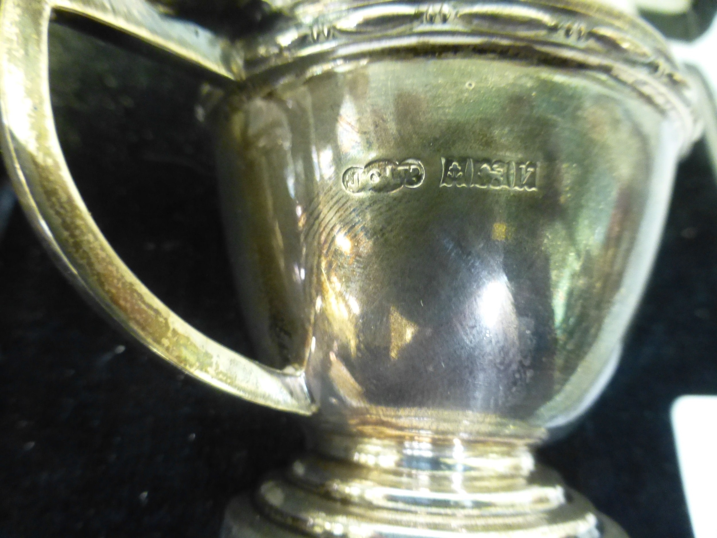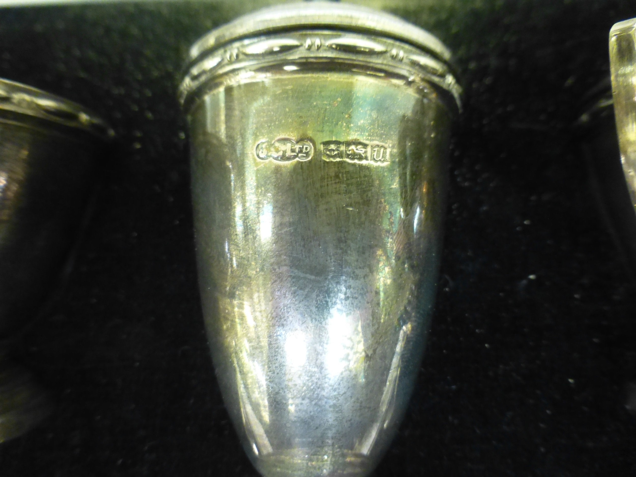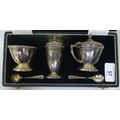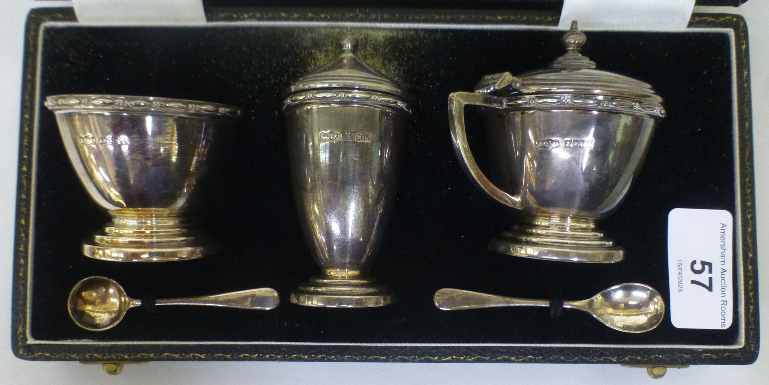 A silver three piece condiments set comprising a mustard pot, a pepper pot and salt Birmingham 1969 (approx. combined gross weight 163grms excluding liners)