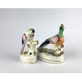 Two Staffordshire pottery colourful bird quill holders tallest 14.5cm high