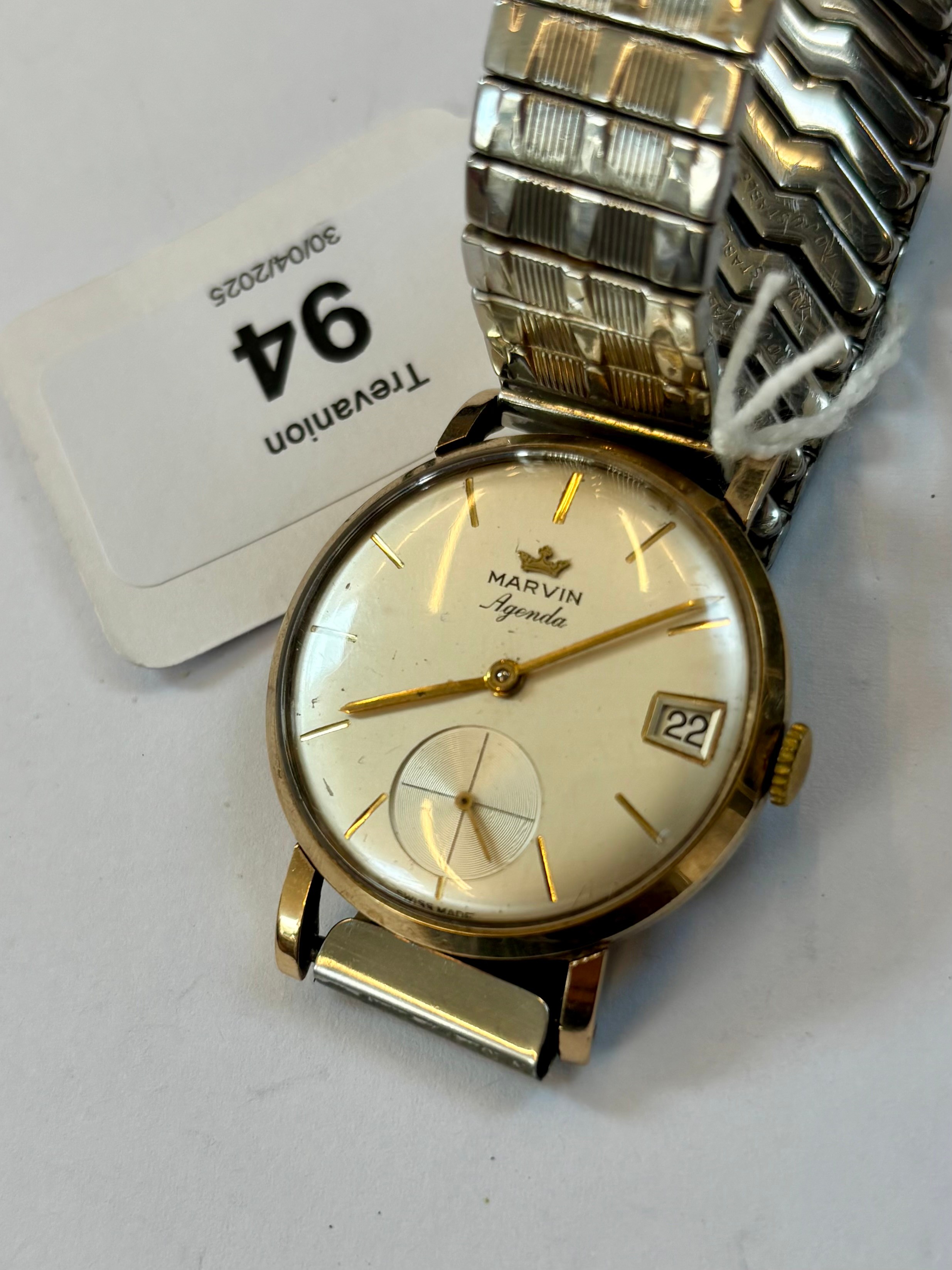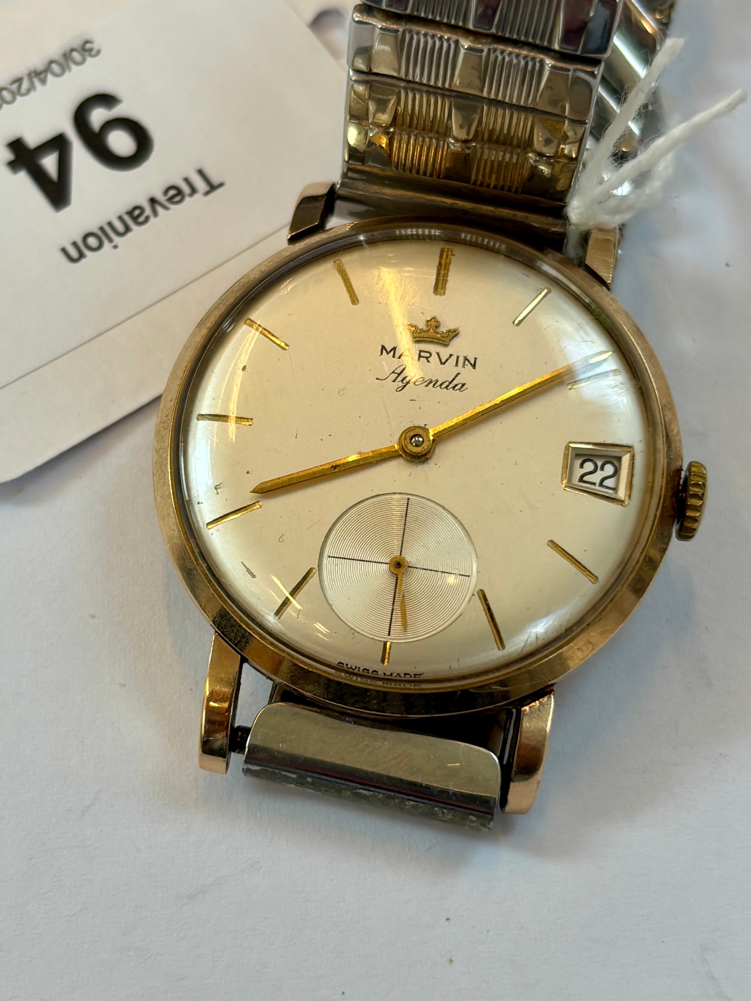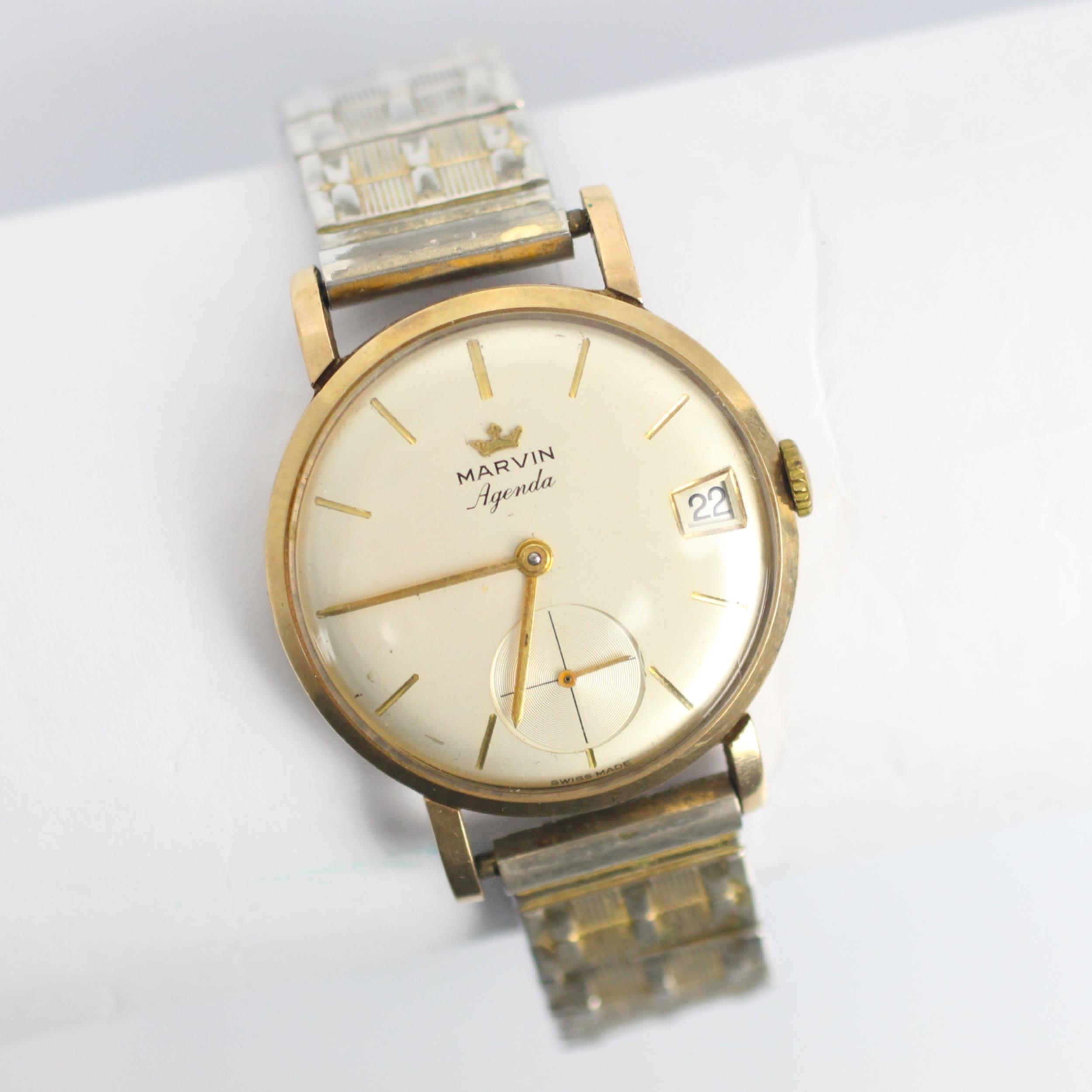 A late 20th century 9ct gold cased 'Marvin Agenda' wristwatch, the circular cream coloured dial with baton markers, subsidiary dial to 6 o'clock and date aperture to 3 o'clock, set to plain polished case, stamped to interior, 3.5cm wide (including crown) upon a later expanding strap, gross weight 44gms (including movement and strap)