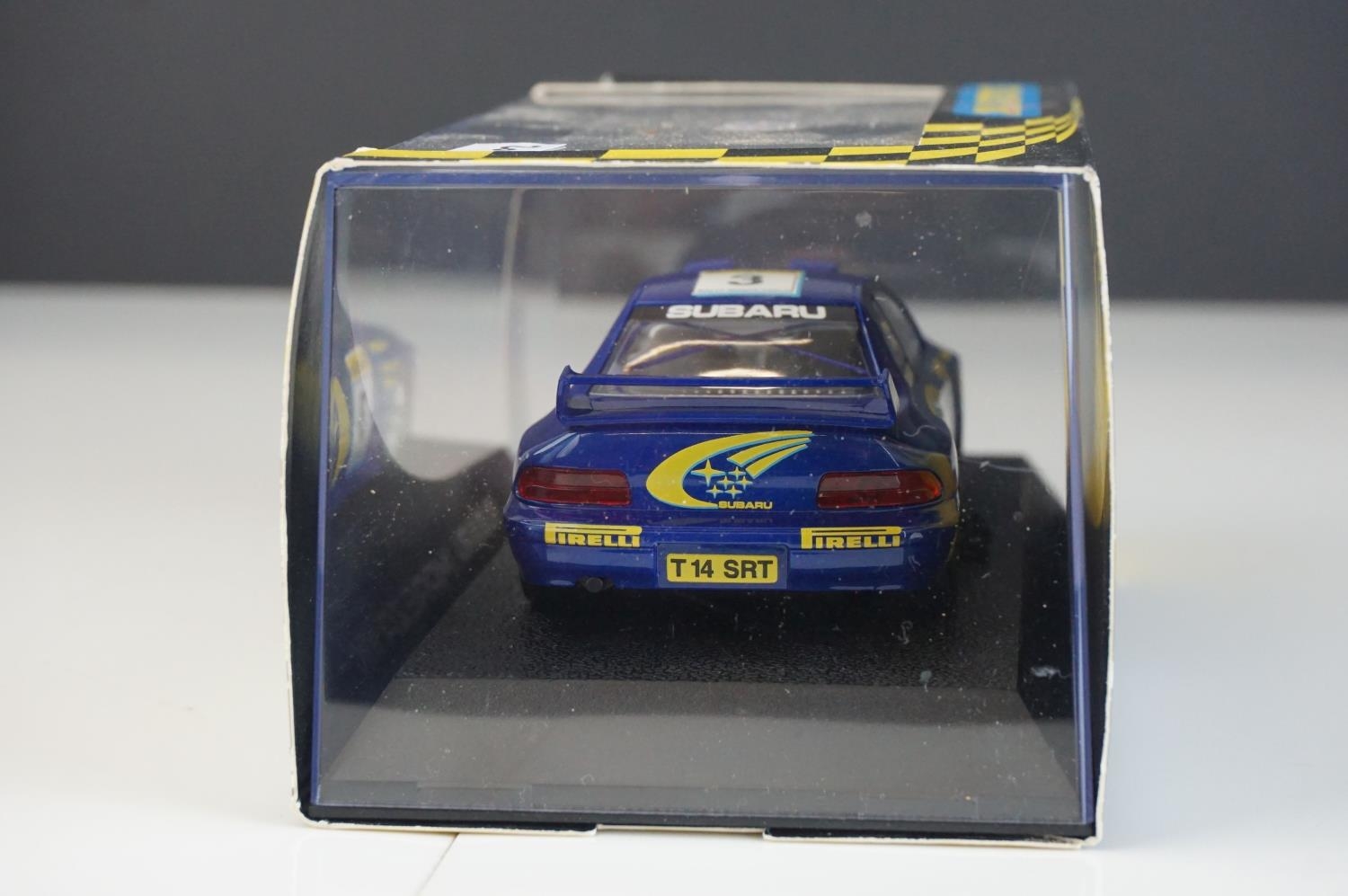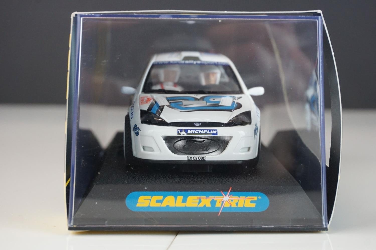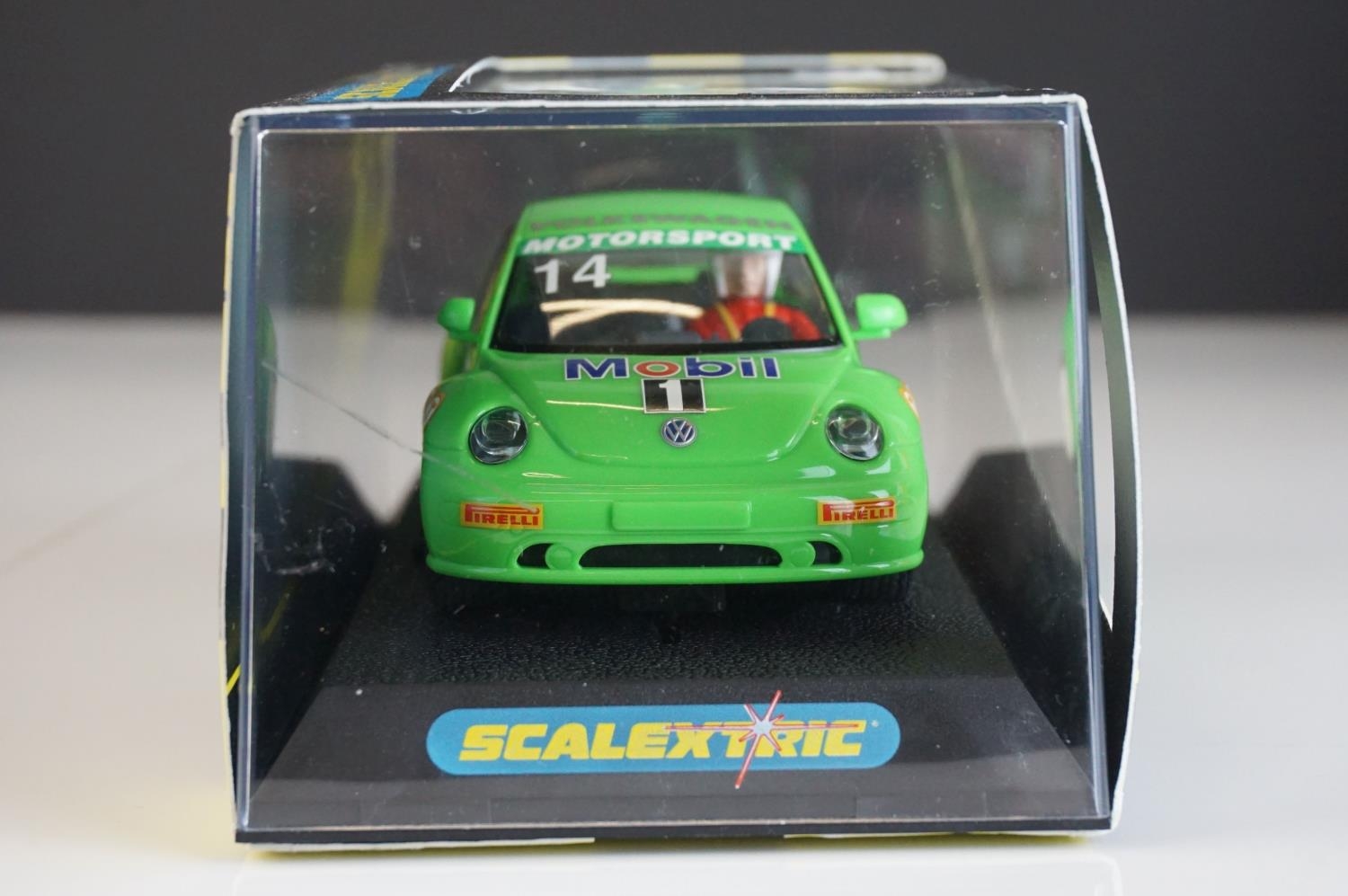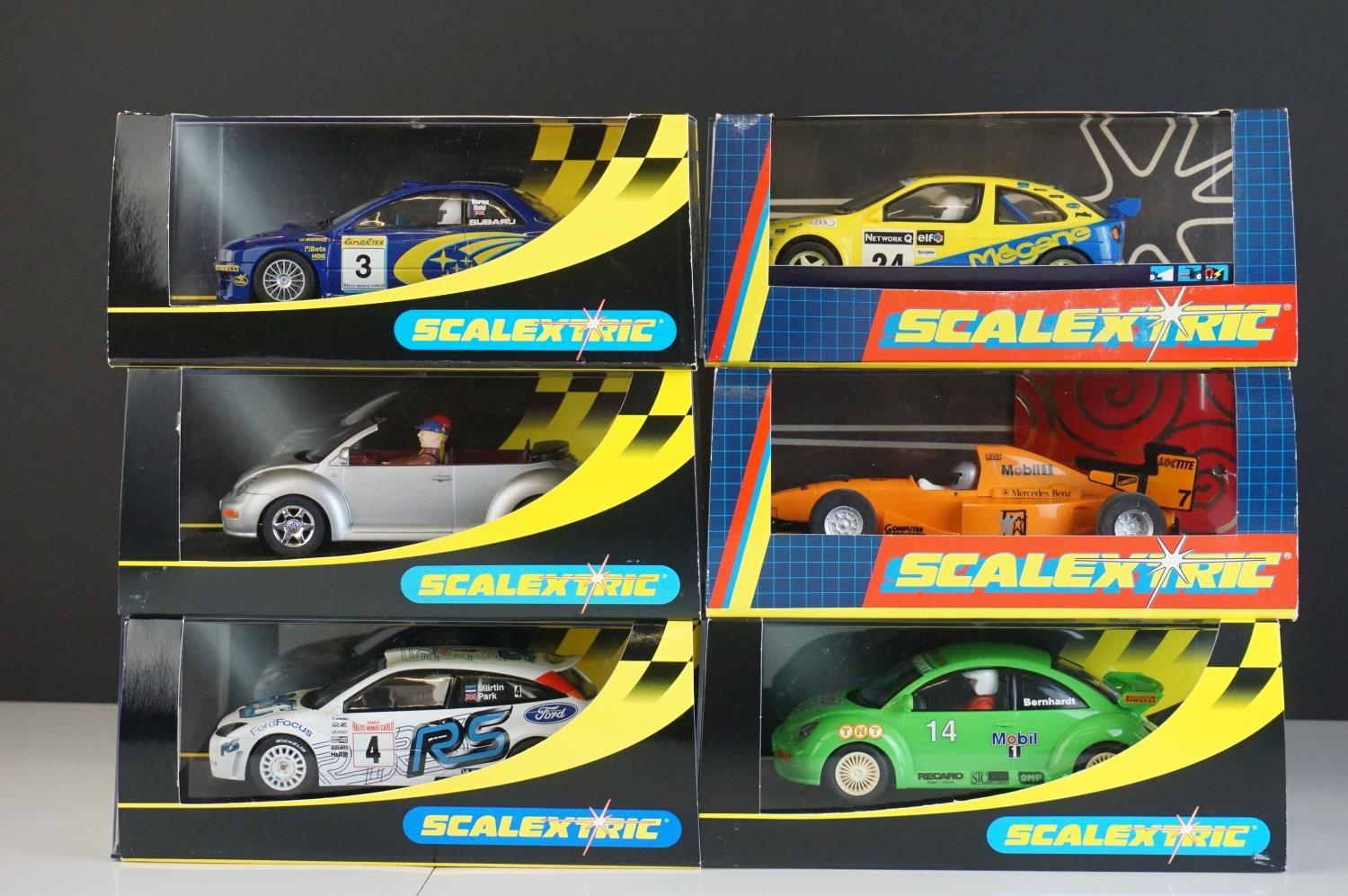 Six cased Scalextric slot cars to include Special Edition 0347 of 1000 C2204 McLaren Mercedes F1 Test Car No 7, c2234 VW Beetle Mobil 1 no 14, C2489 Ford Focus WRC Works 2003 No 4, C2314 VW Beetle silver and C2257 Subaru Impreza Works 2000 No 3,