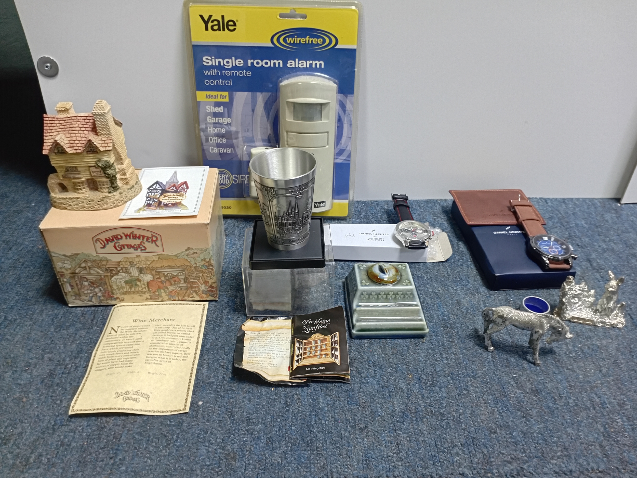 A collection of various items to include watches, irish porcelain ink well, david winter cottage, pewter cup, security system etc.