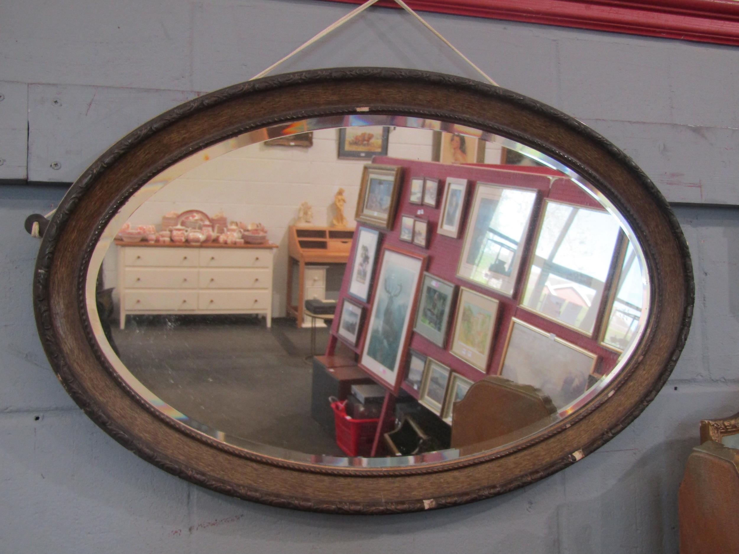 An oval wall mirror with mahogany frame and plaster edge, some a/f, 49cm x 77cm total