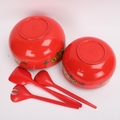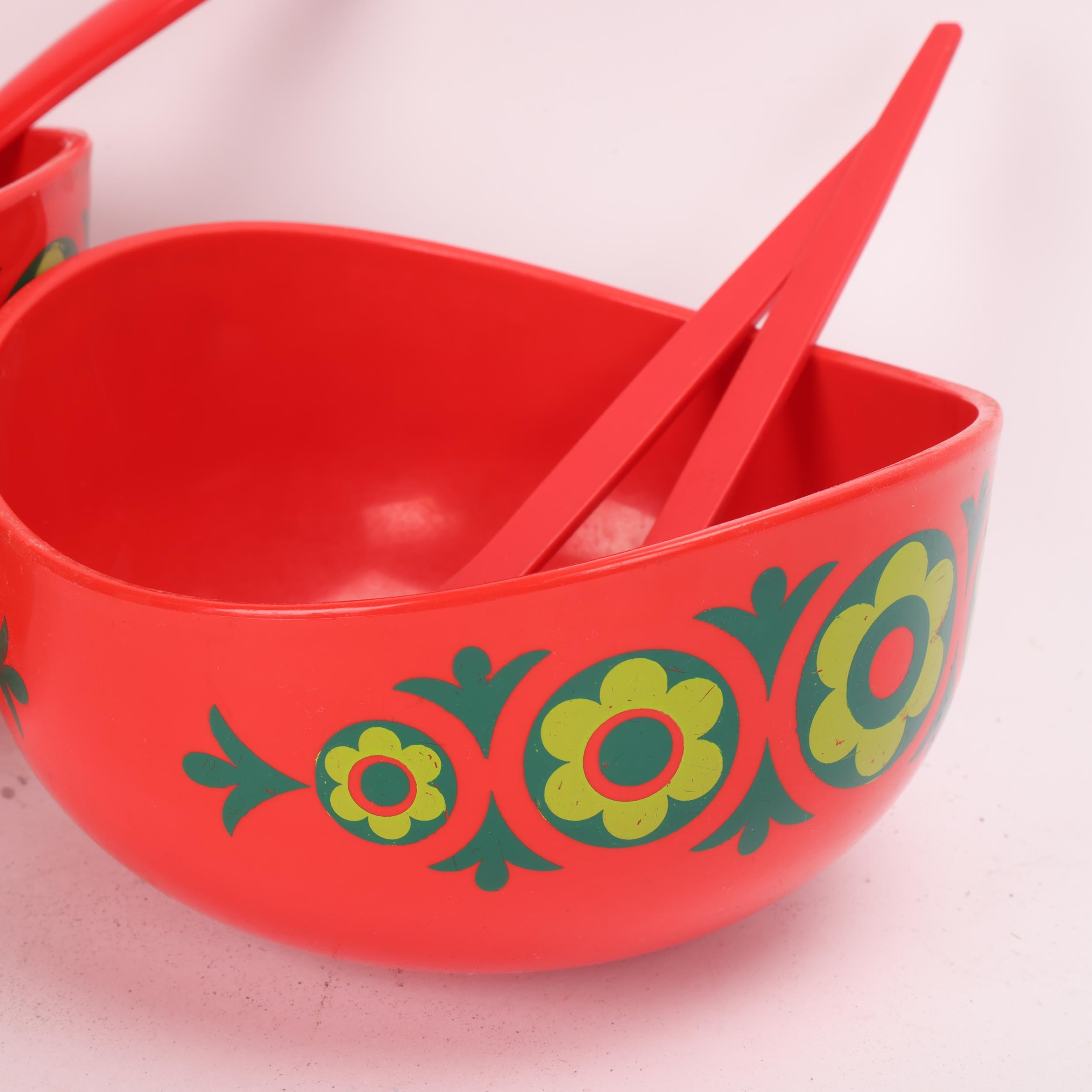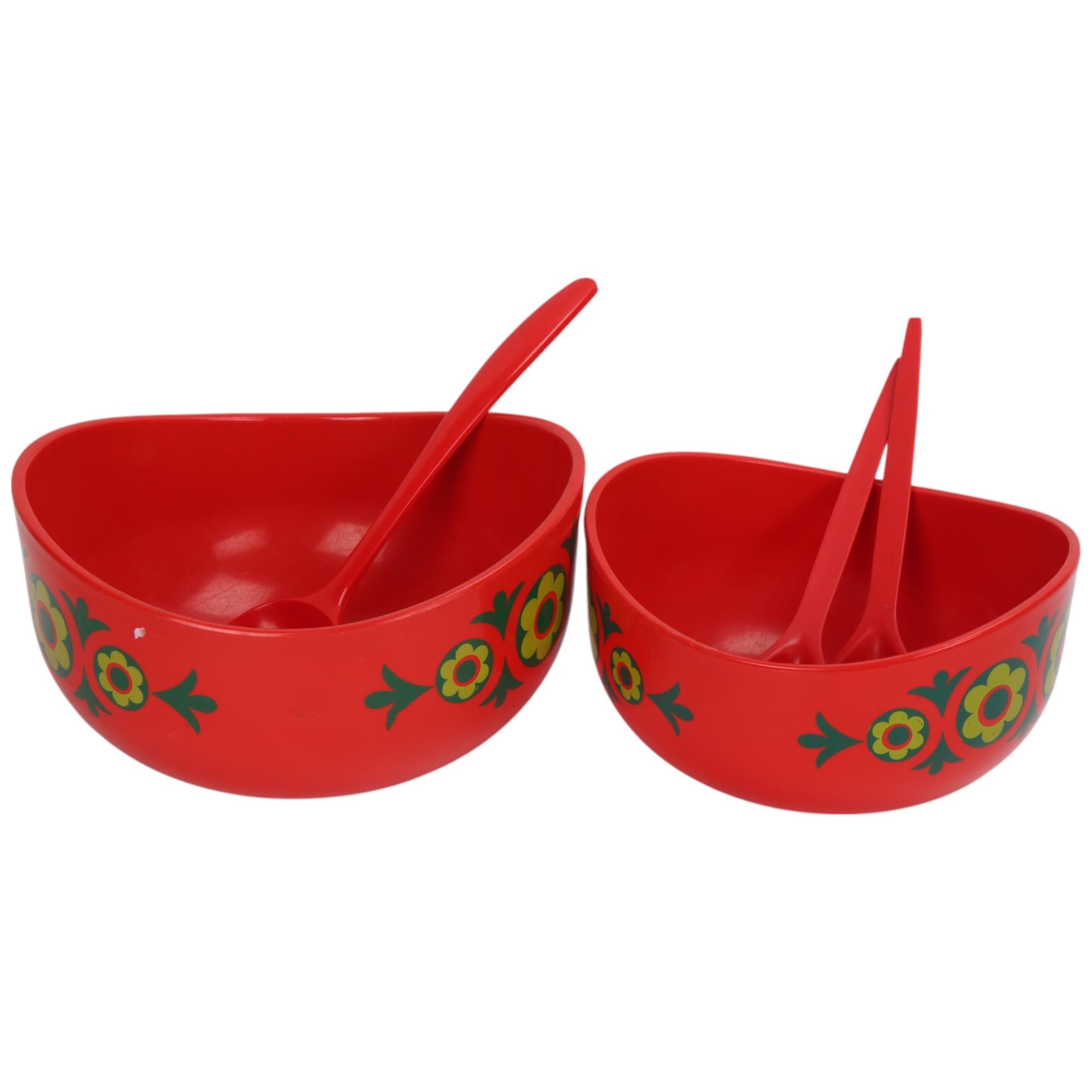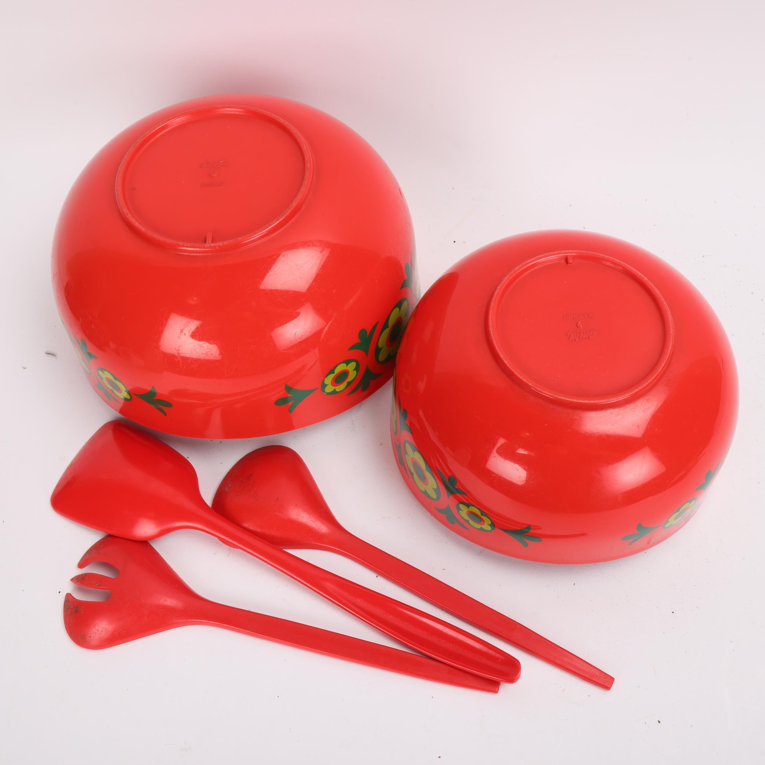2 Emsa, West German red melamine salad bowls and utensils, makers marks to base, largest diameter 21cm