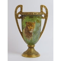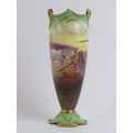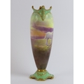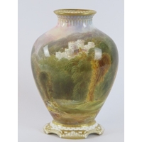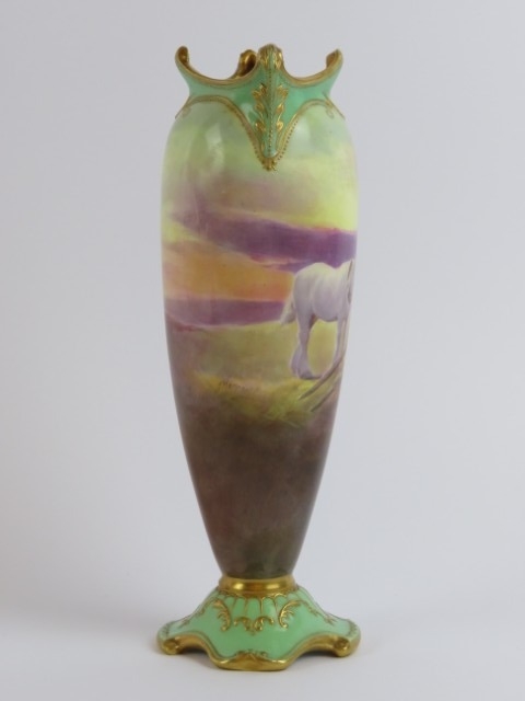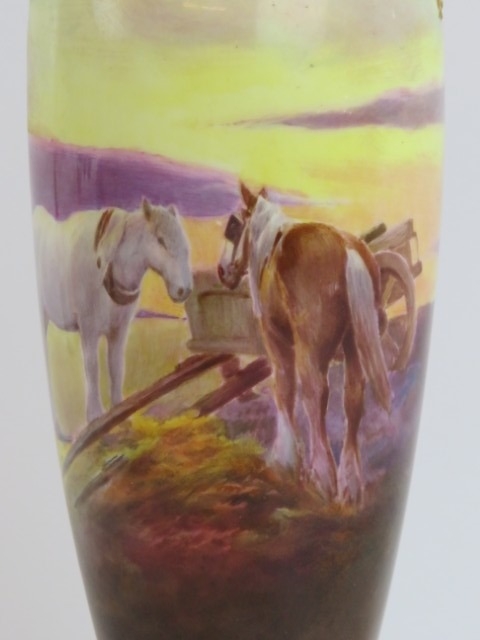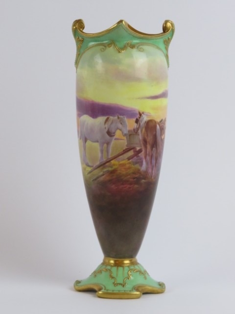 A Royal Doulton vase decorated with shire horses in a rural setting by Joseph Hancock, early 20th century. Signed ‘J. Hancock’ with factory marks beneath. 19.9 cm height.