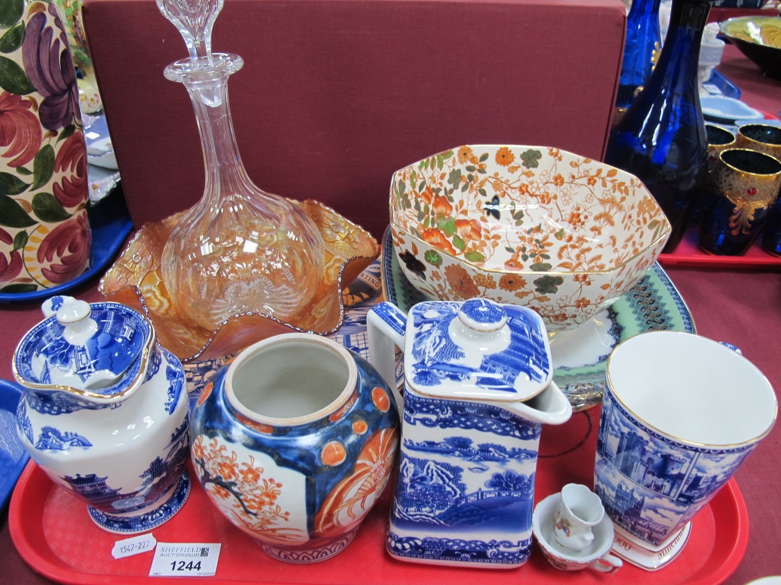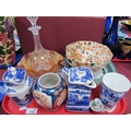 A XIX century decanter, Rington tea, jugs, plate, cups, Royal Couldron octagonal shaped bar etc. 1 Tray