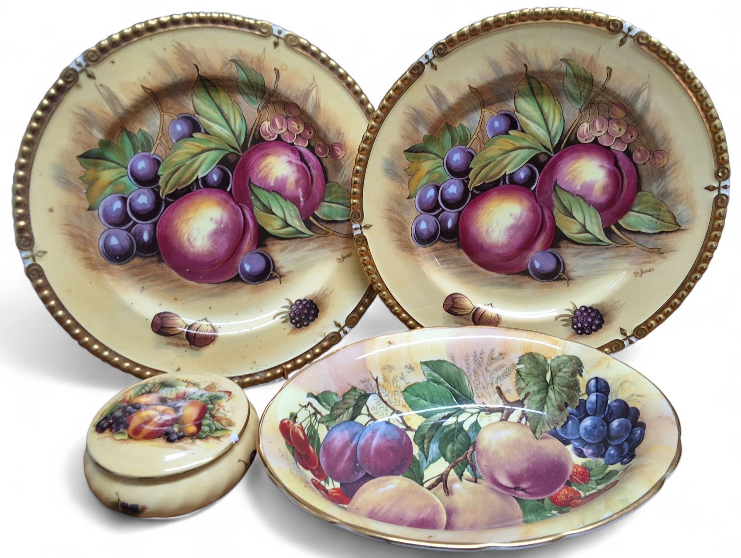 A pair of Aynsley Golden Orchard pattern 27cm plates, signed D Jones; a circular trinket pot and cover (chipped); etc.