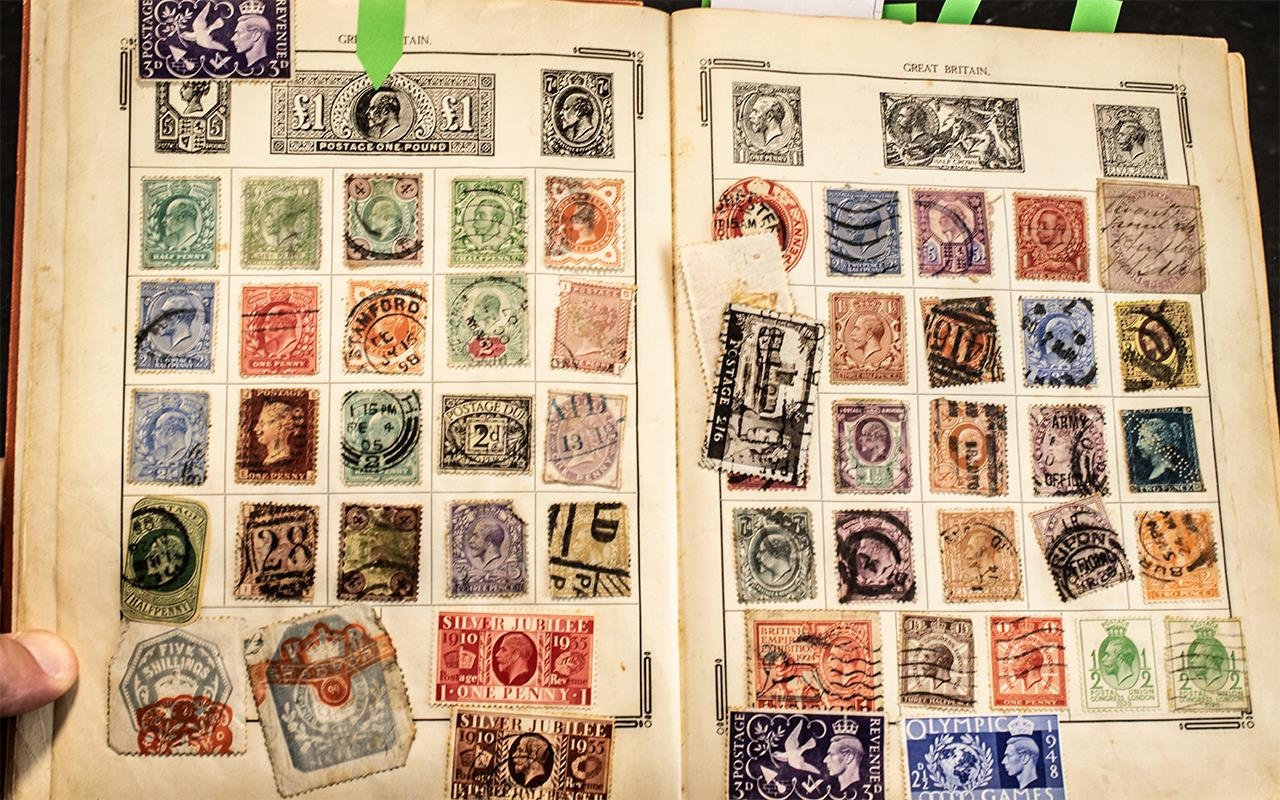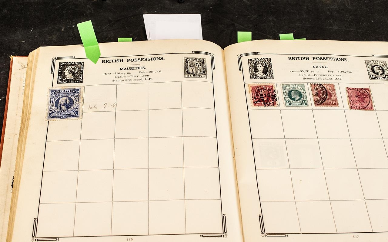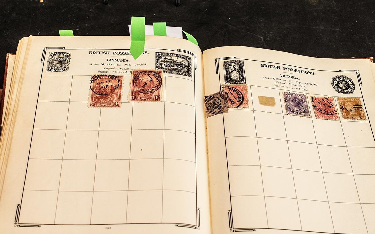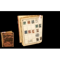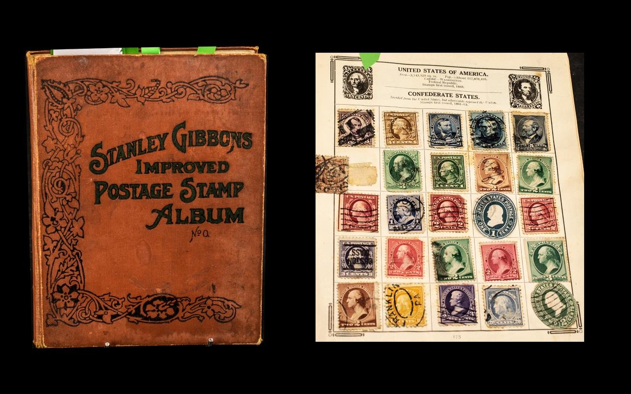 Very old Stanley Gibbons Improved stamp album No. 0 well filled with stamps from around the world. GB includes a few Queen Victoria but other countries predominate with good reasonably high value stamps.
