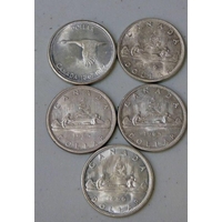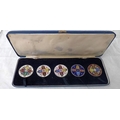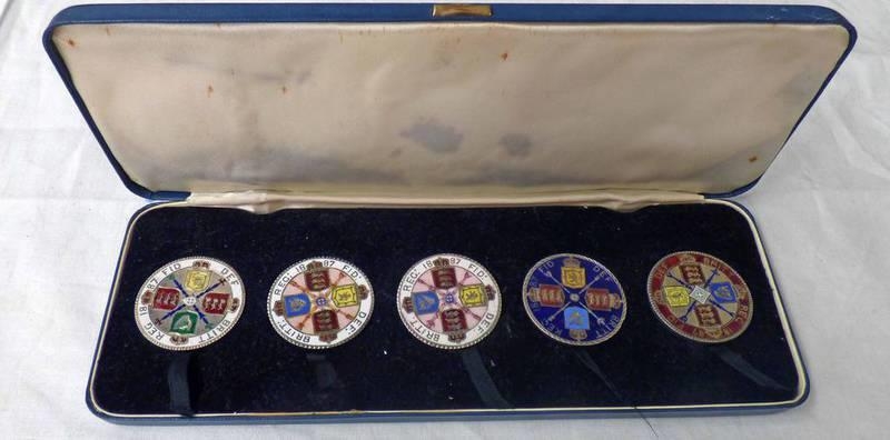 FIVE 1887 VICTORIA DOUBLE FLORINS, ALL WITH ENAMELLED REVERSES, THREE WITH EVIDENCE OF REMOVED PINS, HOUSED IN PRESENTATION CASE