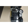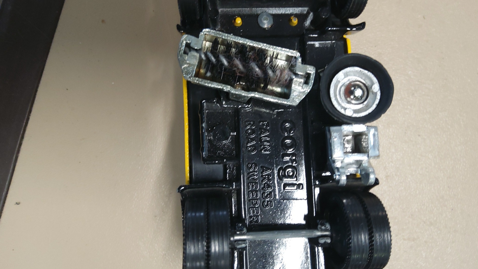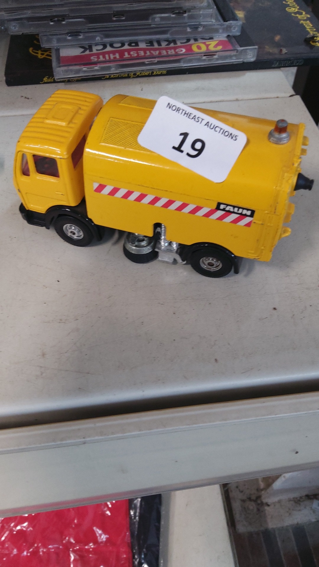 Corgi die-cast model of a Faun airport sweeper truck, yellow body with red-and-white striped livery, black chassis and rubber tyres; the underside moulded ‘CORGI’, ‘FAUN AIRPORT SWEEPER’, and ‘MADE IN GT BRITAIN’.