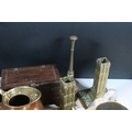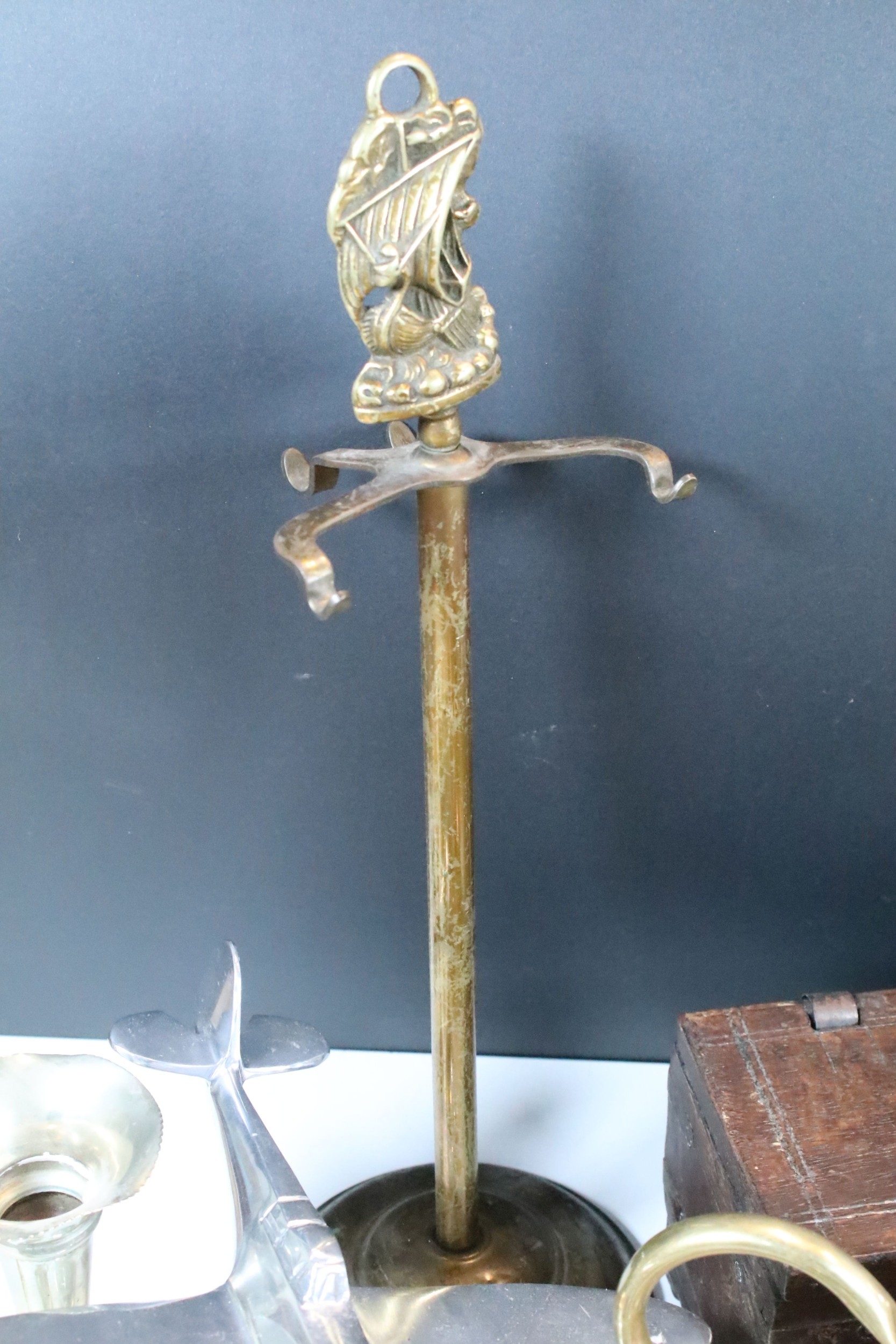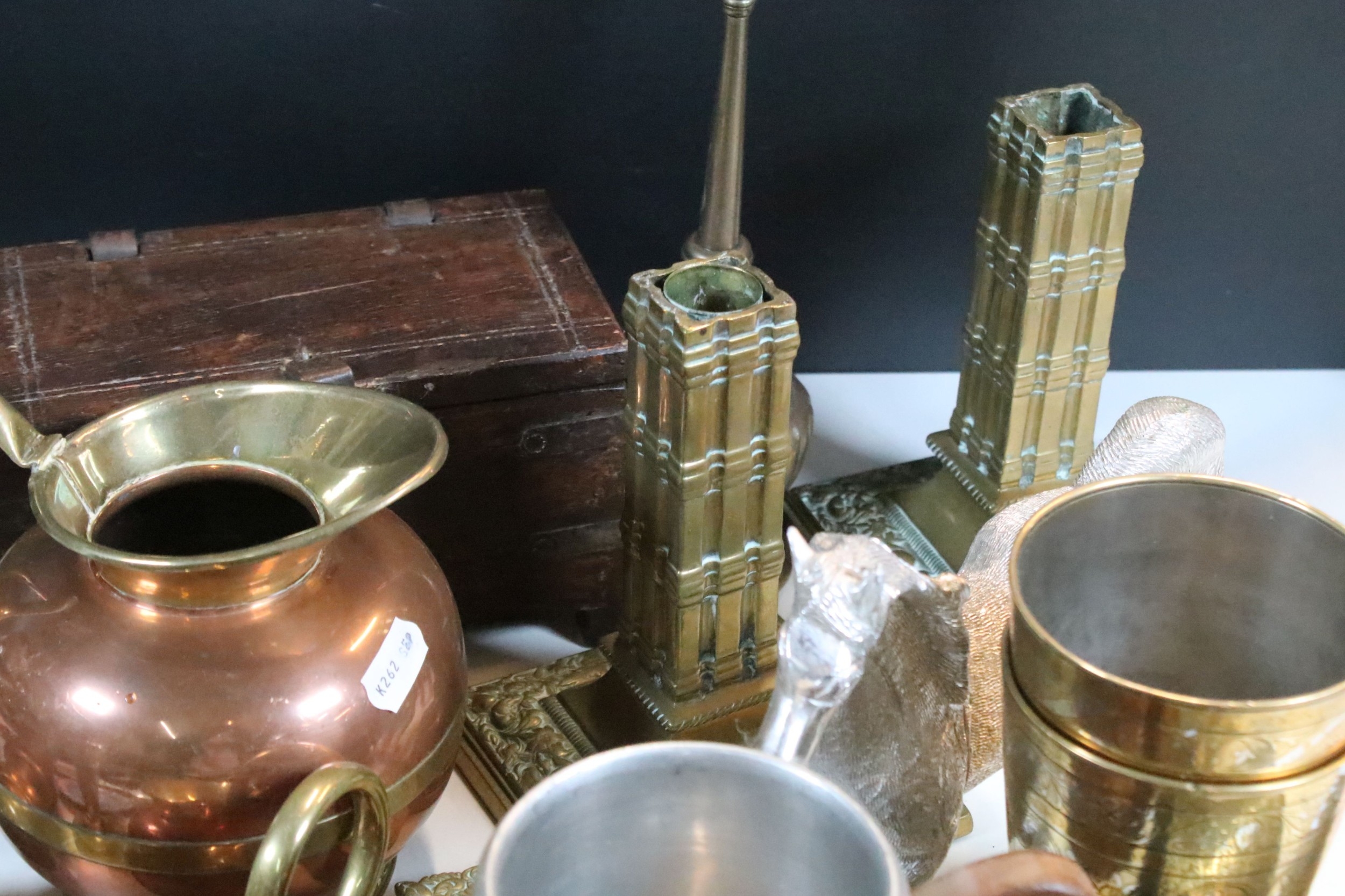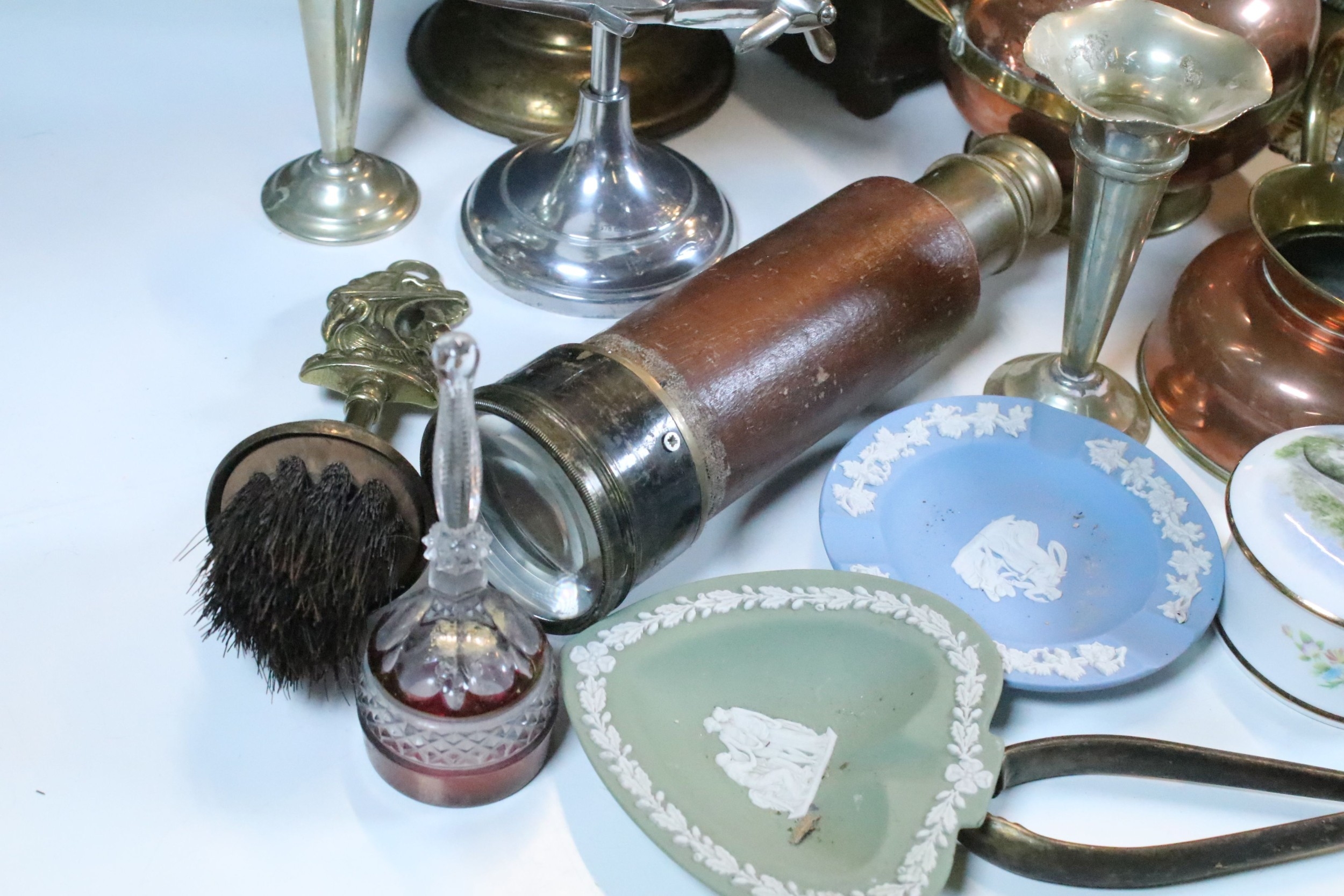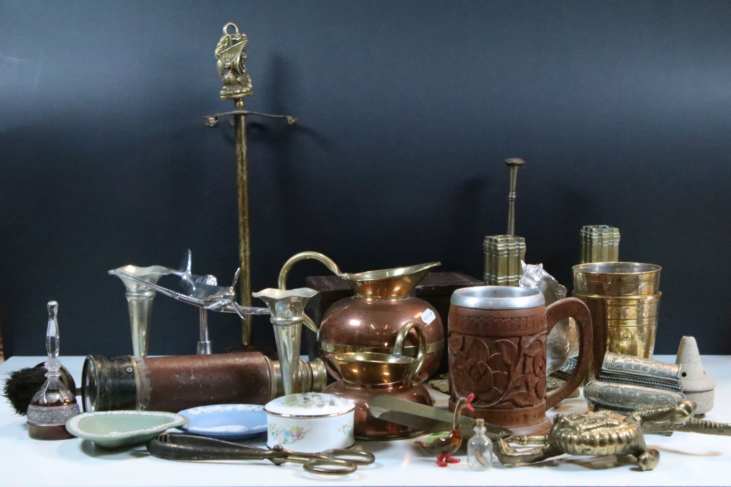 Collection of mixed metalwares, to comprise a pair of William Tonks & Sons brass candlesticks, a three-drawer brass telescope, copper jug, chromed aeroplane desk mascot, etc. (one box)