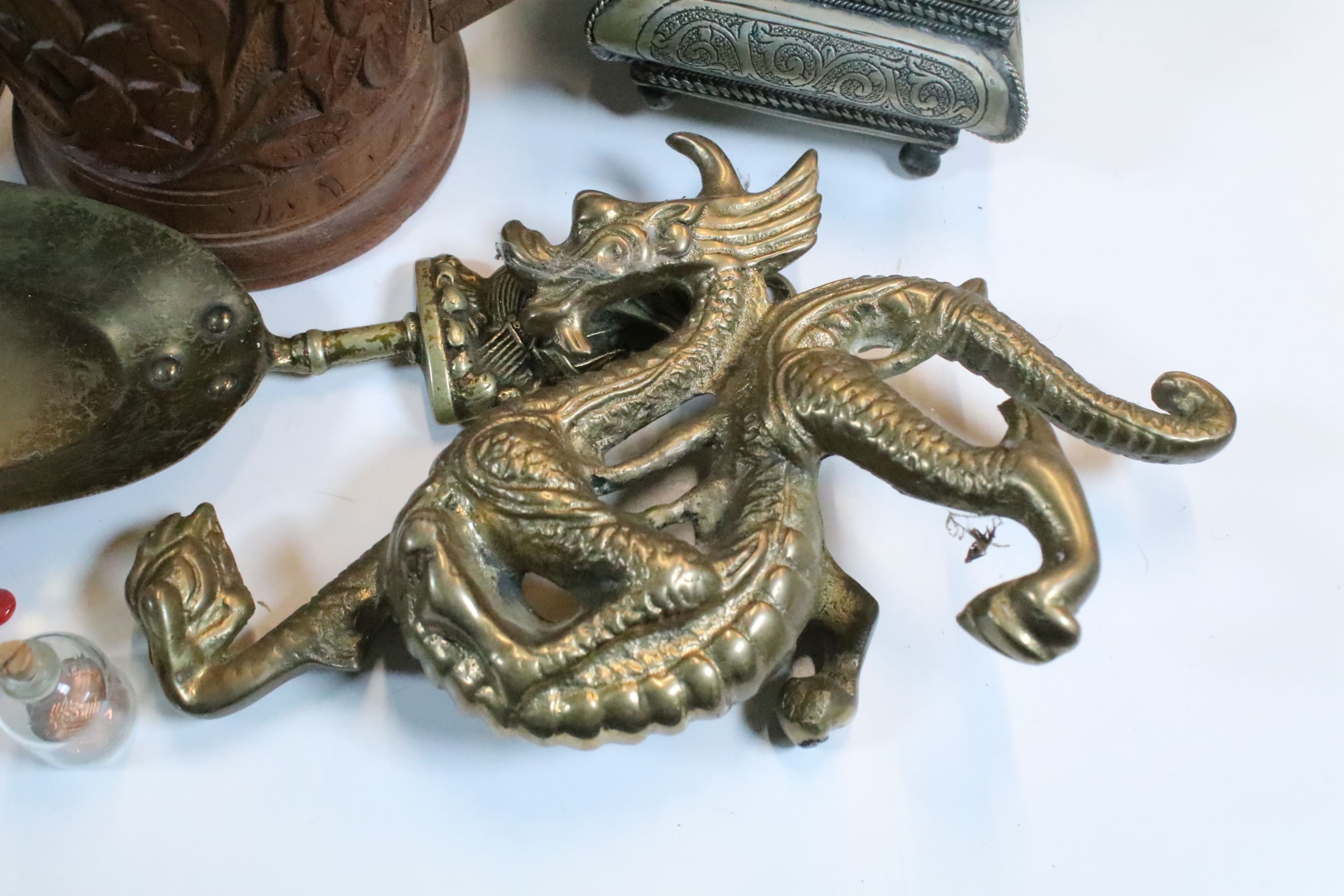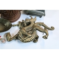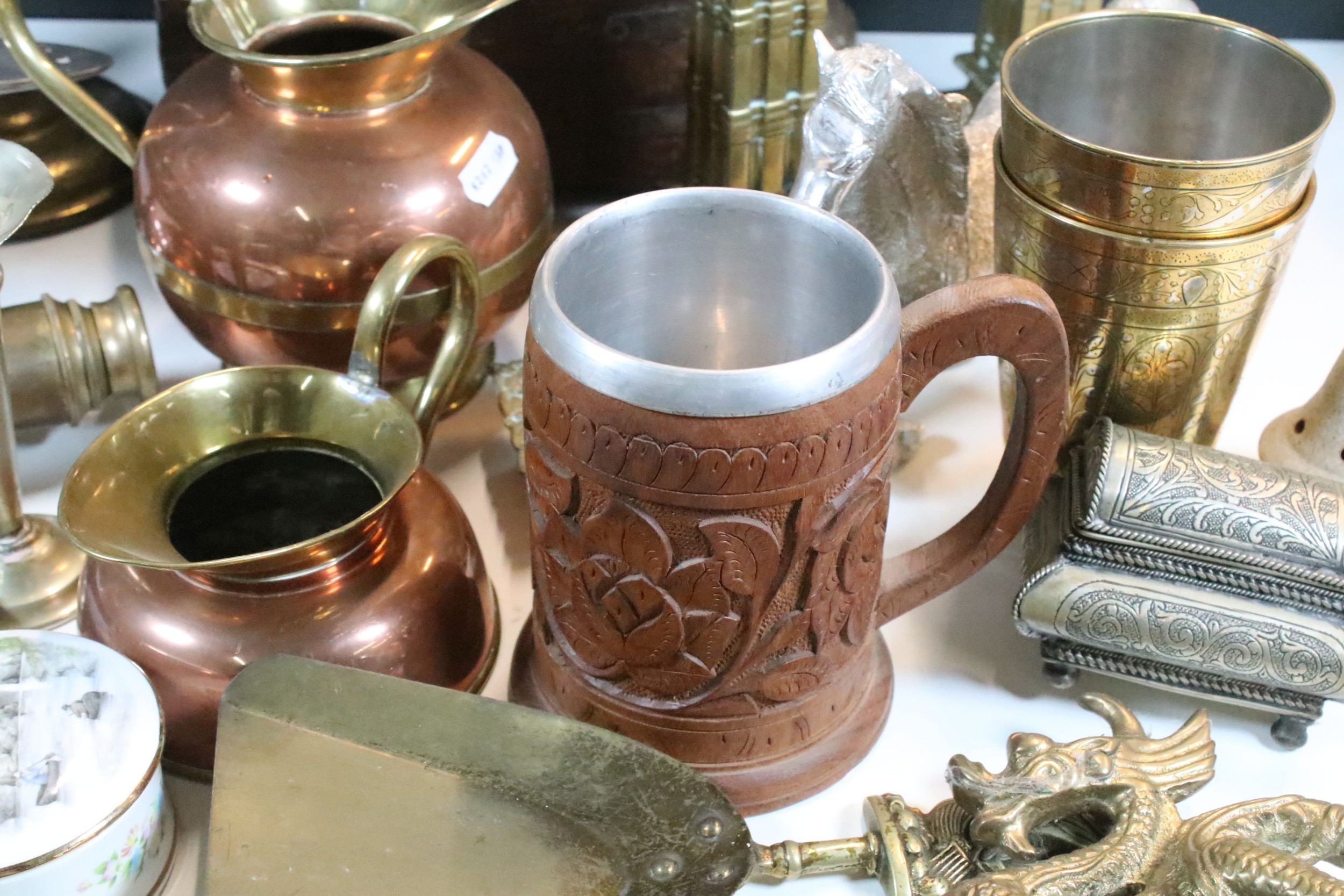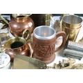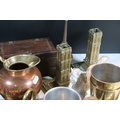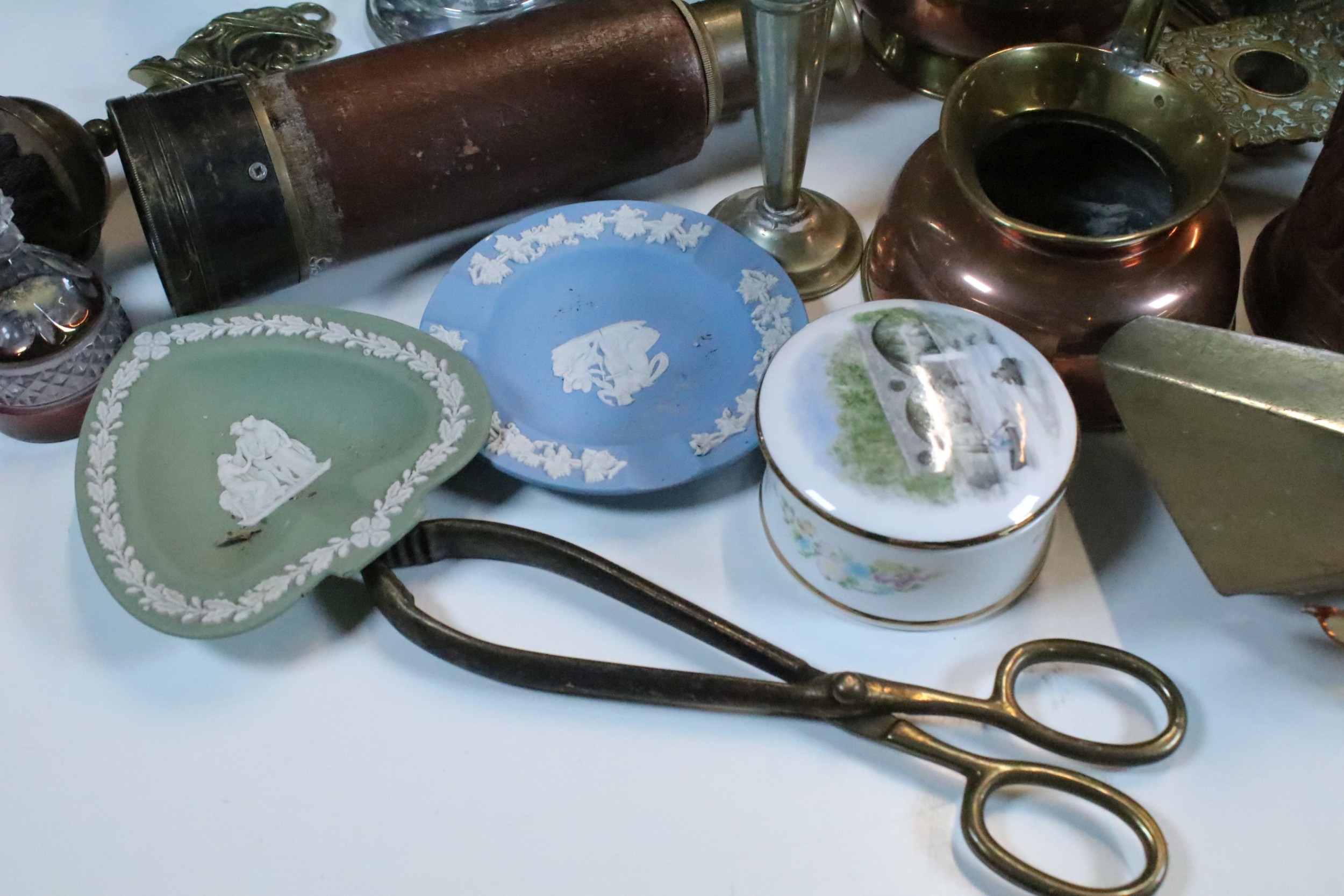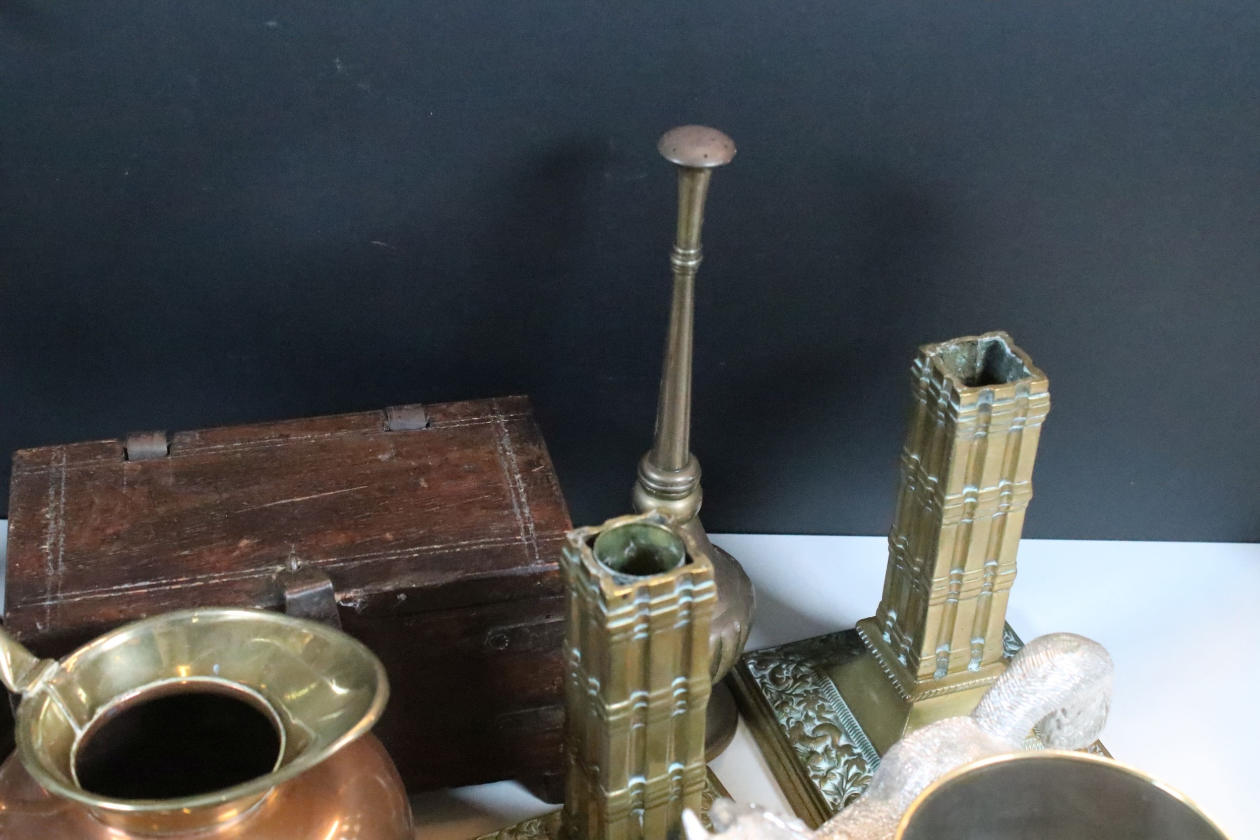 Collection of mixed metalwares, to comprise a pair of William Tonks & Sons brass candlesticks, a three-drawer brass telescope, copper jug, chromed aeroplane desk mascot, etc. (one box)