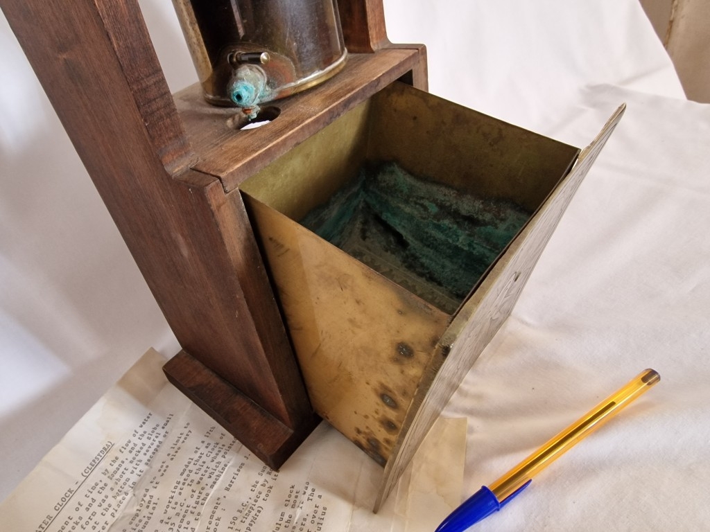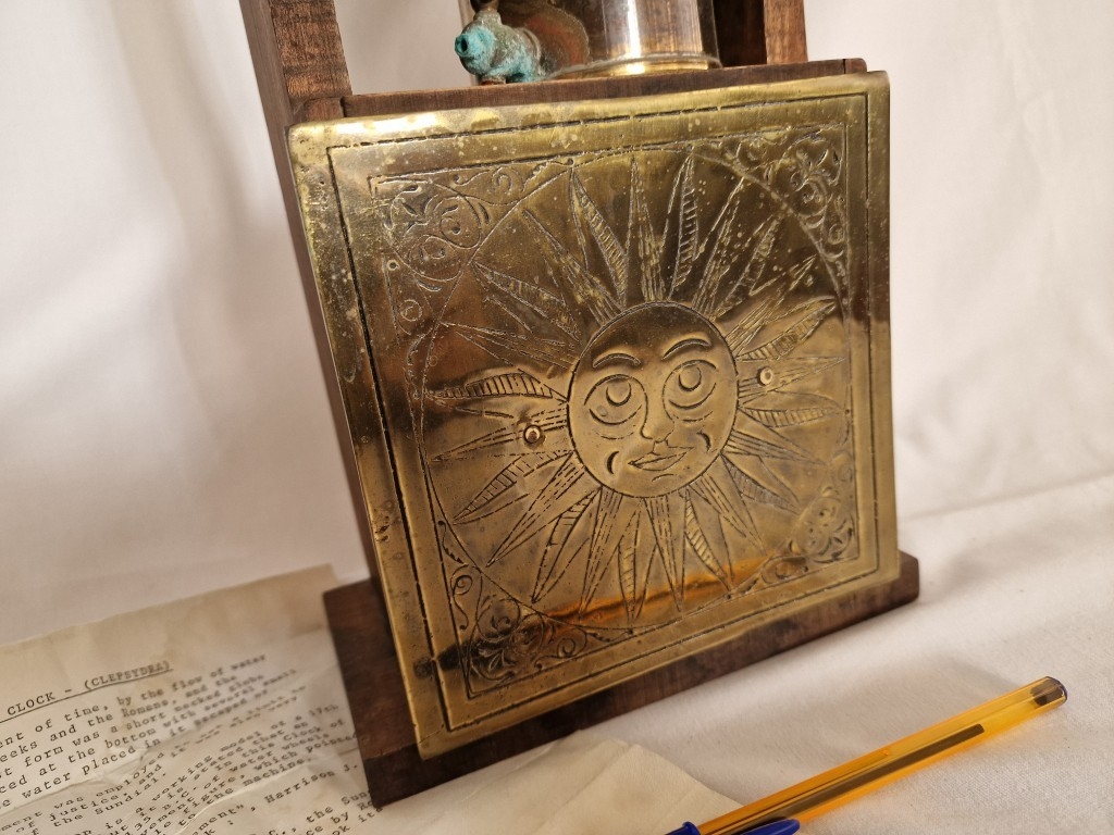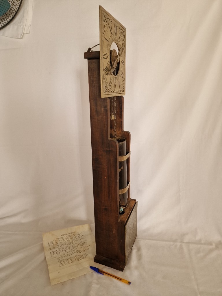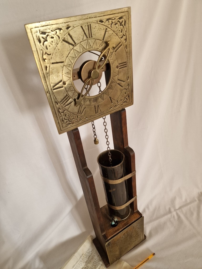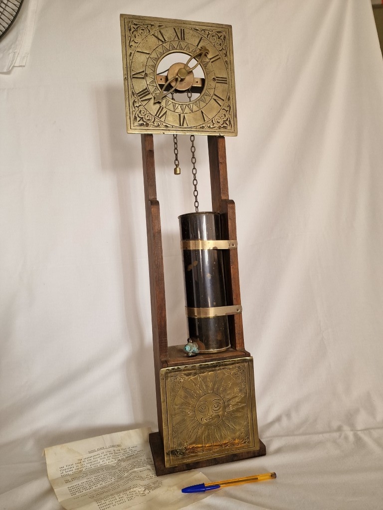 Rare & Fascinating 'Clepsydra', an English Water Clock, a Vintage Mid-Century Reproduction of an Antique 17th Century 24-Hour Water Clock with Oak Case, Brass Face & Hands, Float on Chain with Water Vessel Over Collection Tank with Sun Dial Decoration to Brass Face, (Approx. H: 79cm),